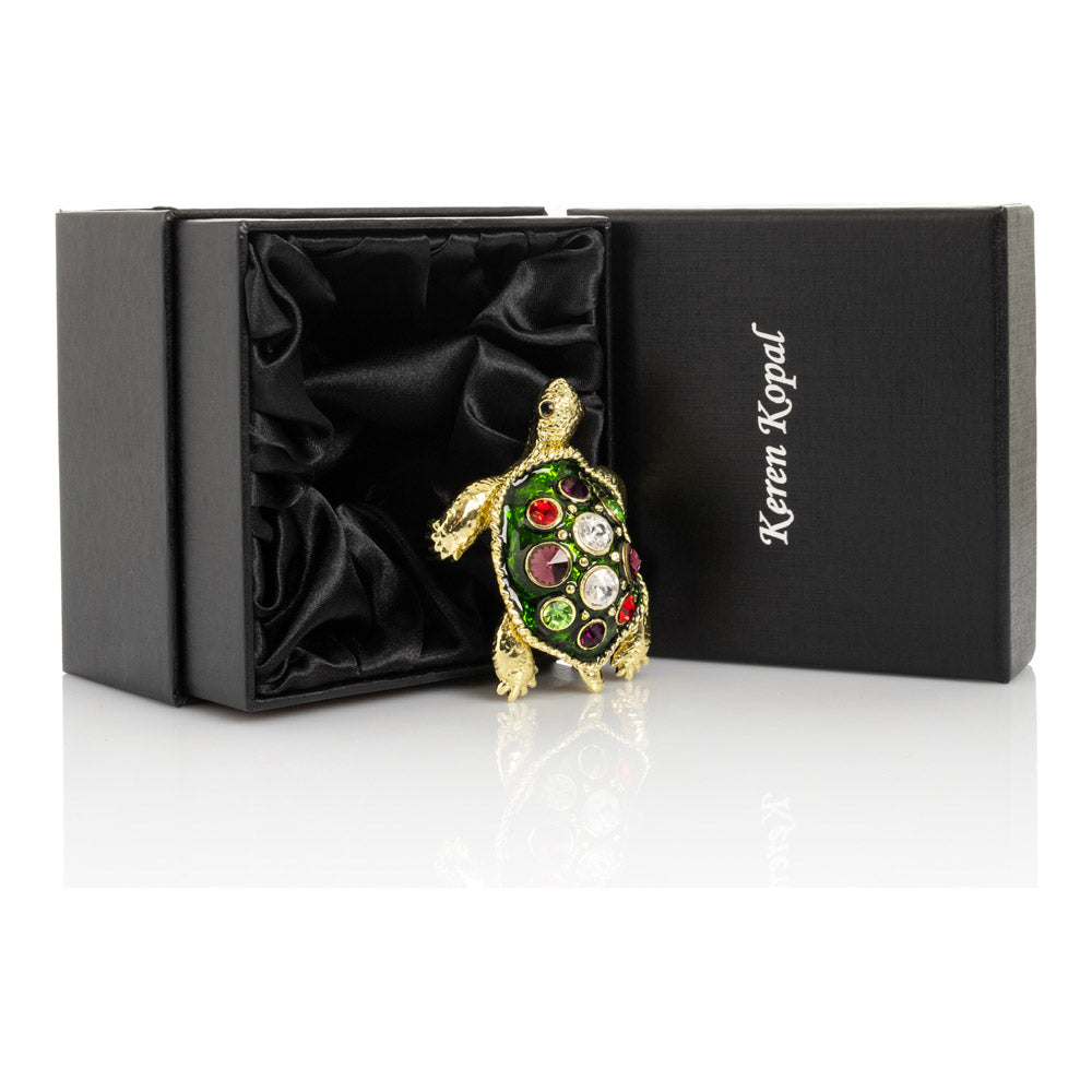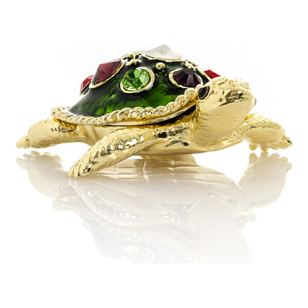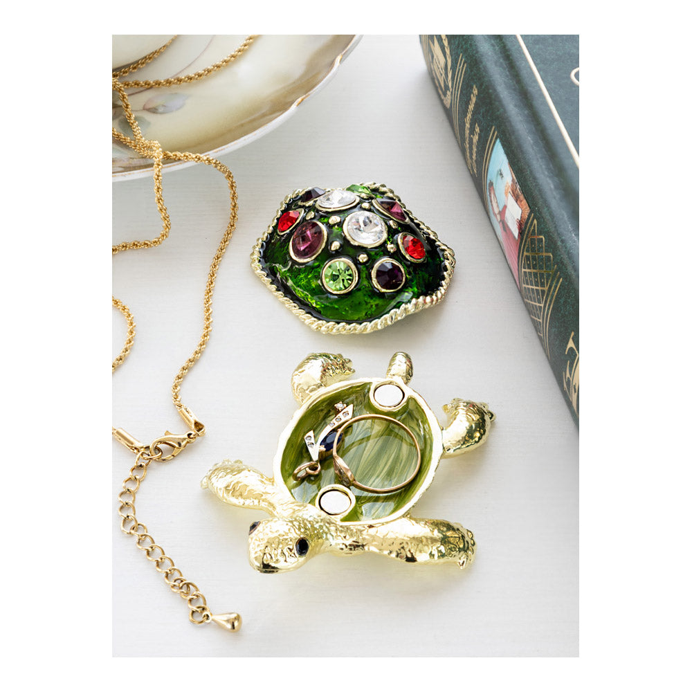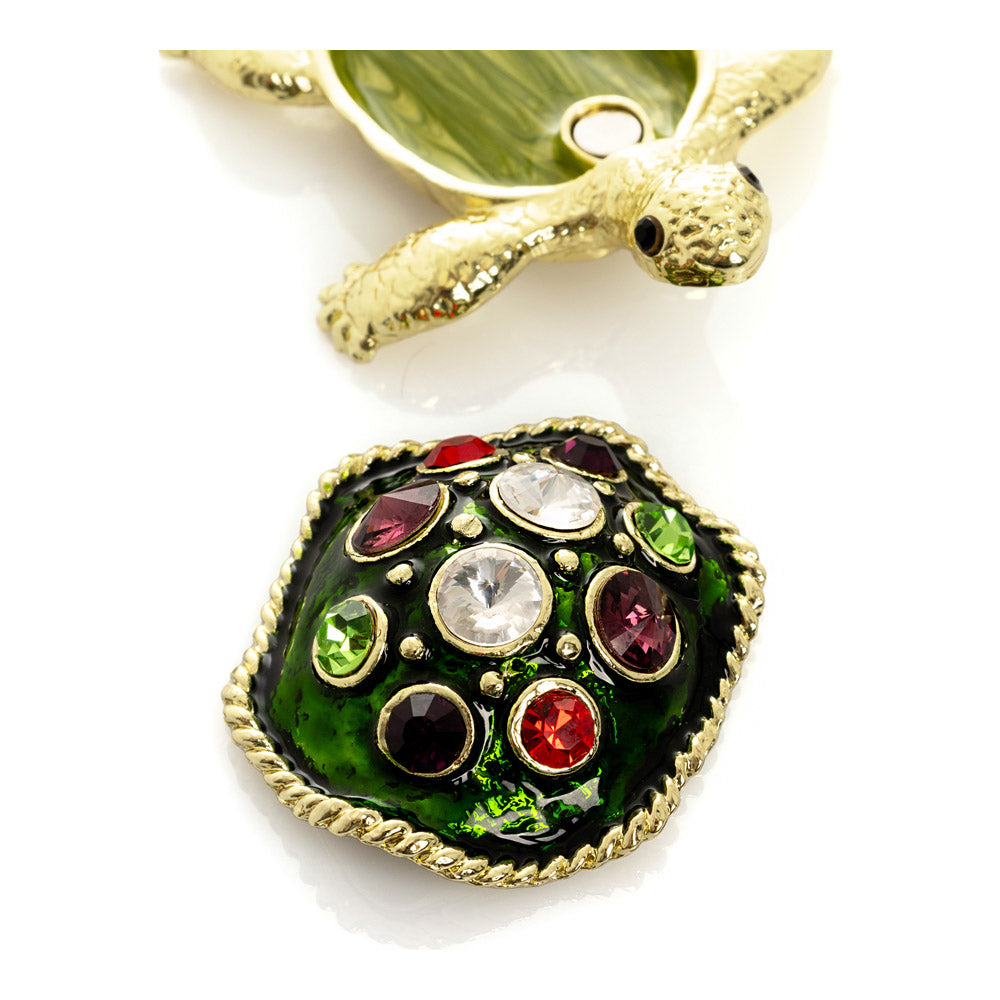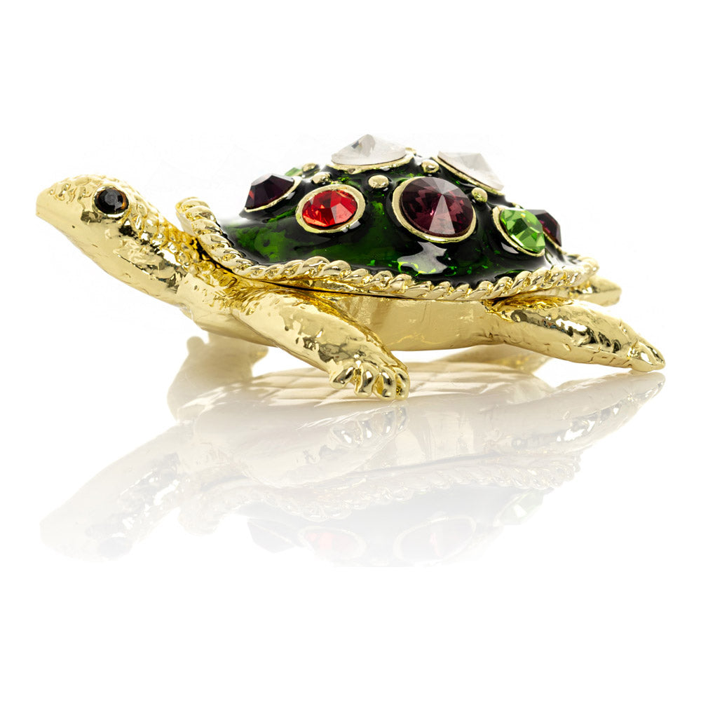 קופסת תכשיטים בעבודת יד בעיצוב צב מוזהב עם שריון ירוק, יצירה ייחודית לאספנים ולאוהבי פריטים מרהיבים. מצופה זהב 24 קראט ומעוטרת בקריסטלים אוסטריים נוצצים שנבחרו והוצבו בקפידה, עם צביעה ידנית בטכניקת אמייל ייחודית המעניקה לפריט עומק וברק מרהיב. הסגירה המגנטית מבטיחה שמירה בטוחה על תכולתה, והיא מגיעה באריזת מתנה שחורה אלגנטית.