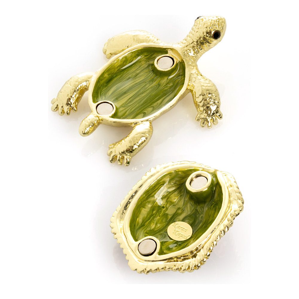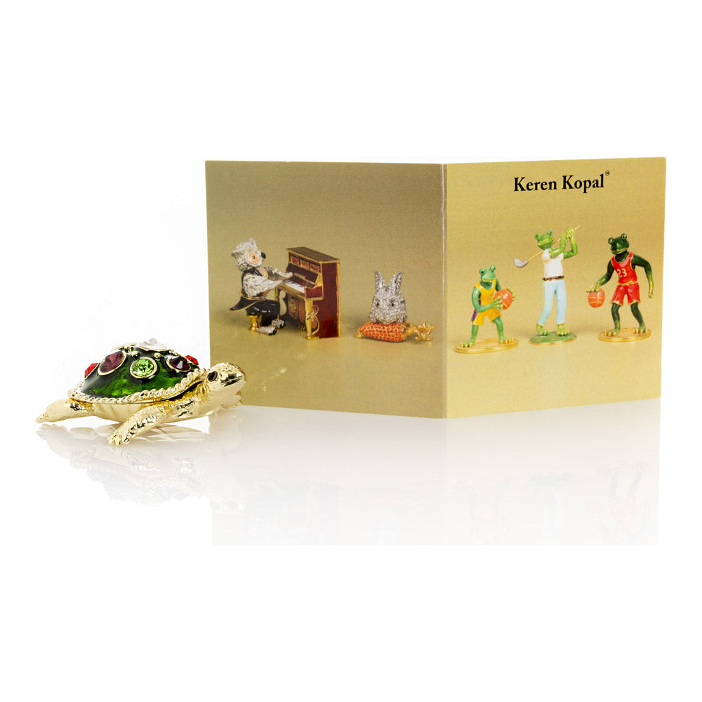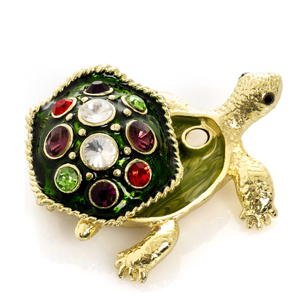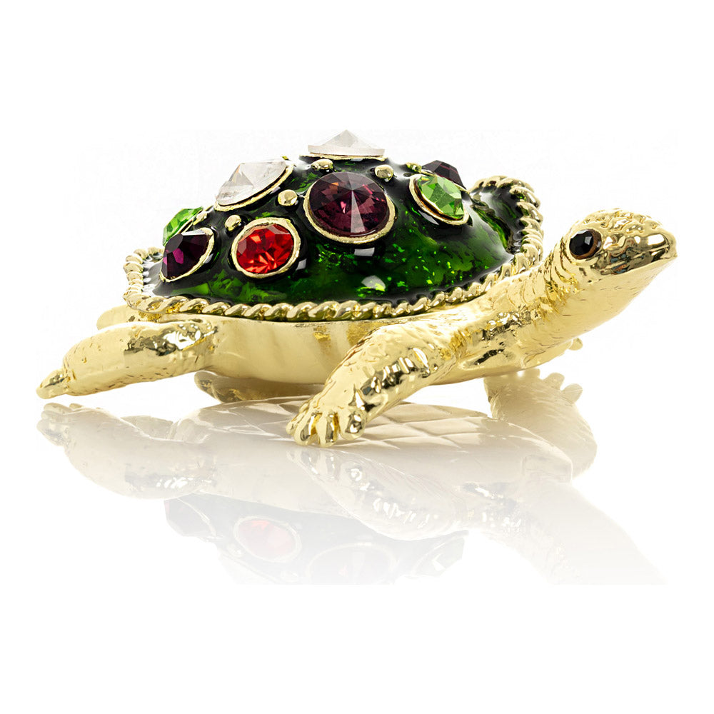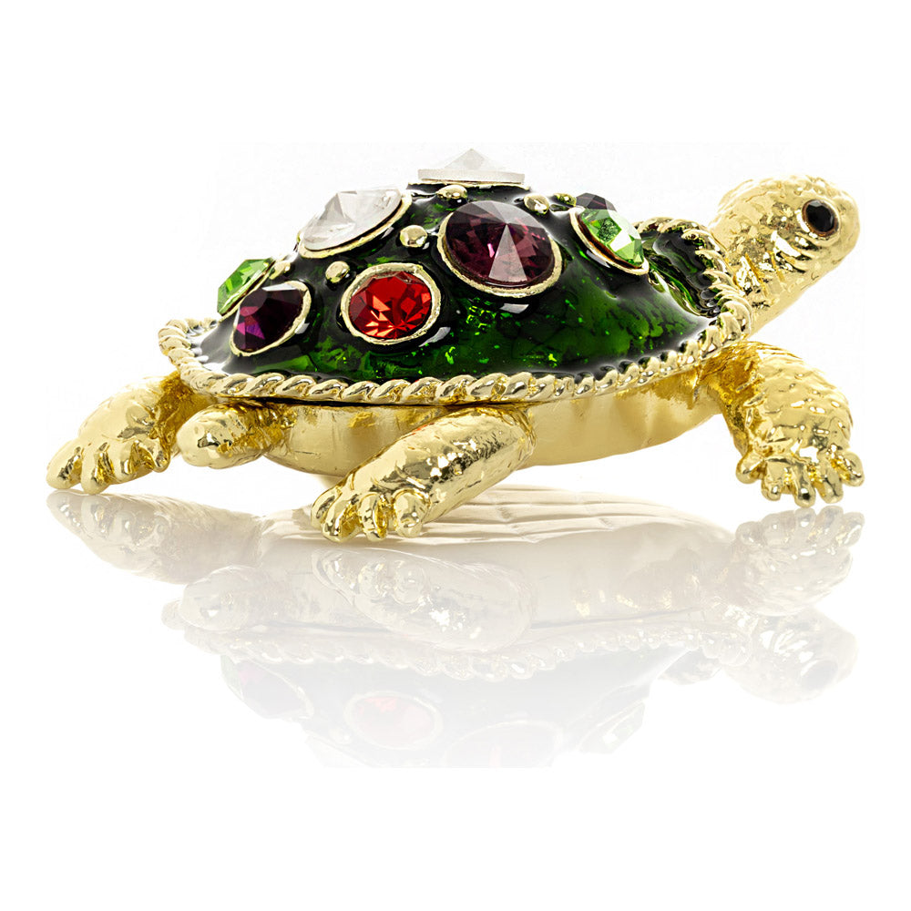 קופסת תכשיטים בעבודת יד בעיצוב צב מוזהב עם שריון ירוק, יצירה ייחודית לאספנים ולאוהבי פריטים מרהיבים. מצופה זהב 24 קראט ומעוטרת בקריסטלים אוסטריים נוצצים שנבחרו והוצבו בקפידה, עם צביעה ידנית בטכניקת אמייל ייחודית המעניקה לפריט עומק וברק מרהיב. הסגירה המגנטית מבטיחה שמירה בטוחה על תכולתה, והיא מגיעה באריזת מתנה שחורה אלגנטית.