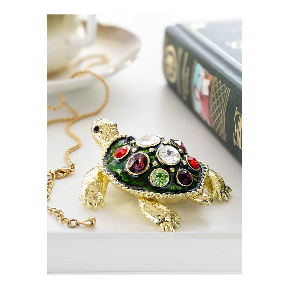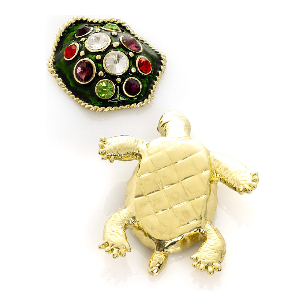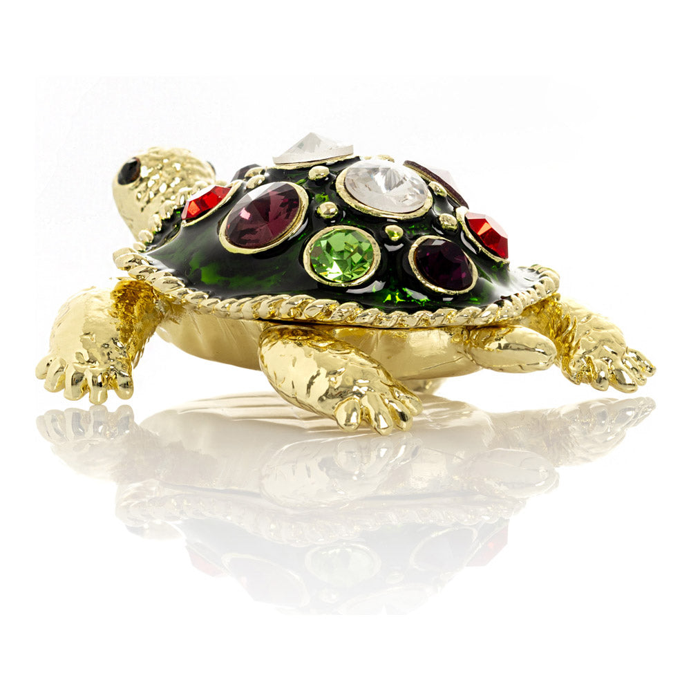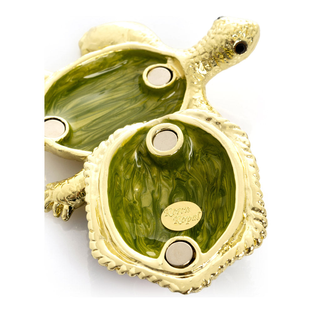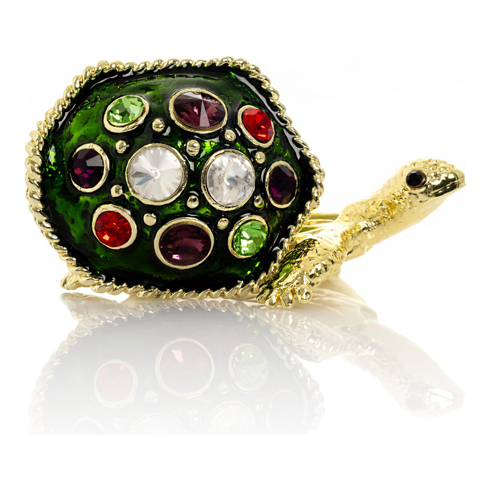 קופסת תכשיטים בעבודת יד בעיצוב צב מוזהב עם שריון ירוק, יצירה ייחודית לאספנים ולאוהבי פריטים מרהיבים. מצופה זהב 24 קראט ומעוטרת בקריסטלים אוסטריים נוצצים שנבחרו והוצבו בקפידה, עם צביעה ידנית בטכניקת אמייל ייחודית המעניקה לפריט עומק וברק מרהיב. הסגירה המגנטית מבטיחה שמירה בטוחה על תכולתה, והיא מגיעה באריזת מתנה שחורה אלגנטית.
