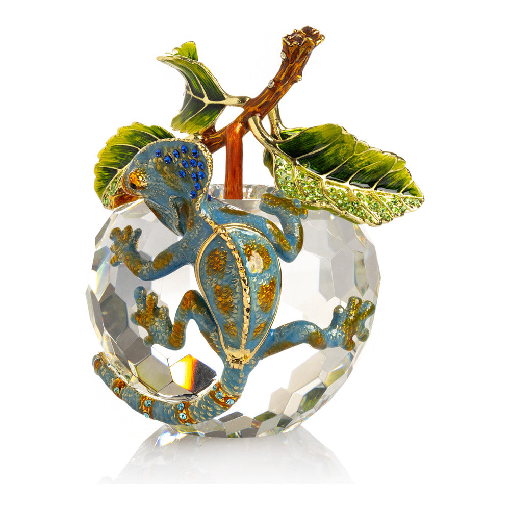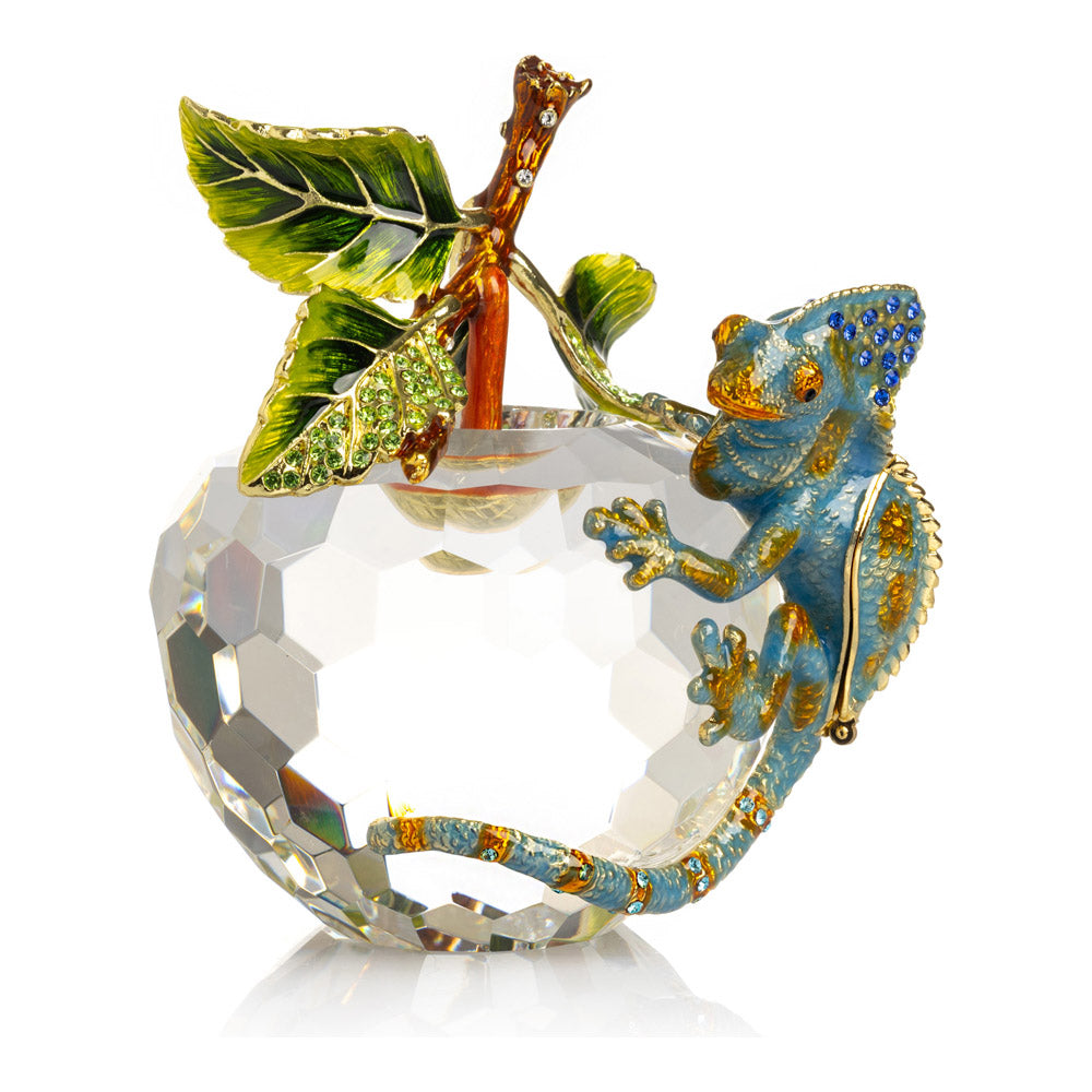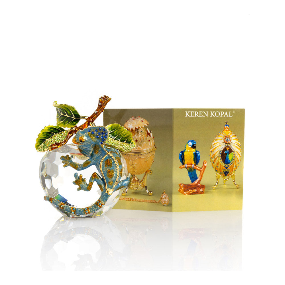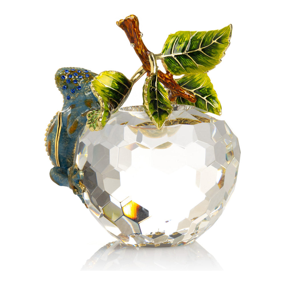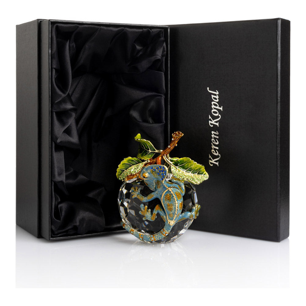 פסל קריסטל ייחודי בצורת תפוח, שבראשו זיקית בעבודת יד - יצירה מהסדרה היוקרתית "חיות על קריסטלים" של האומנית קרן קופל. בסיס הקריסטל, שנחתך בקפידה להחזרת אור בברק מרהיב, מהווה במה מושלמת לזיקית המעוטרת בקריסטלים אוסטריים נוצצים ובצביעה ידנית בטכניקת אמייל ייחודית. השילוב בין הקריסטל המרהיב לעבודת האמנות העדינה יוצר פריט מרהיב וחד-פעמי, מושלם כקישוט יוקרתי או כפריט אספנות נדיר. מגיע באריזת מתנה שחורה אלגנטית.