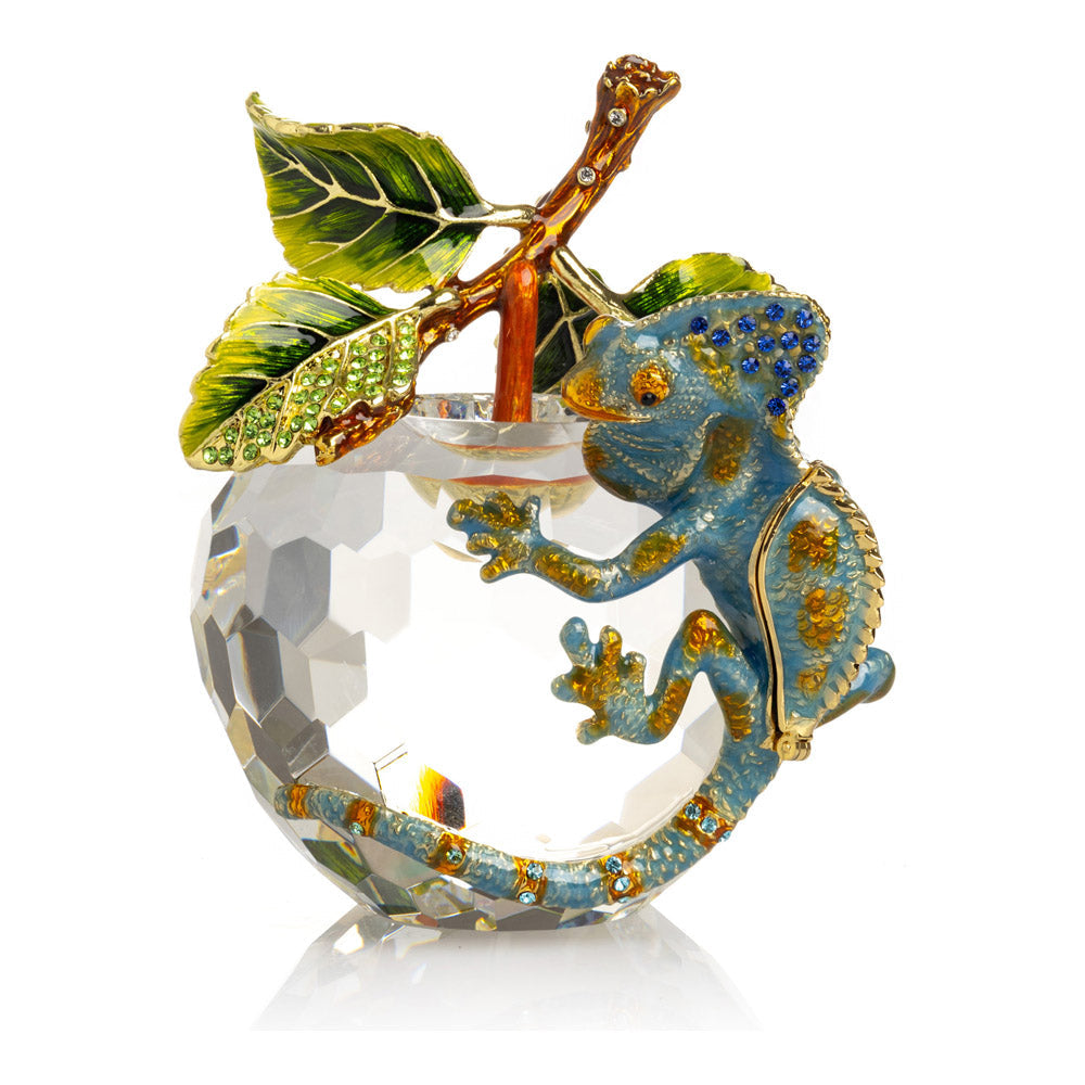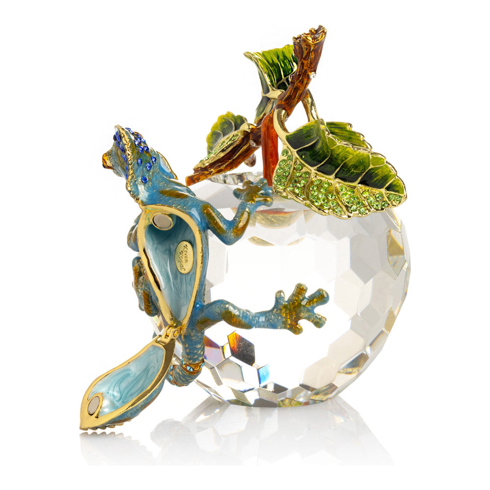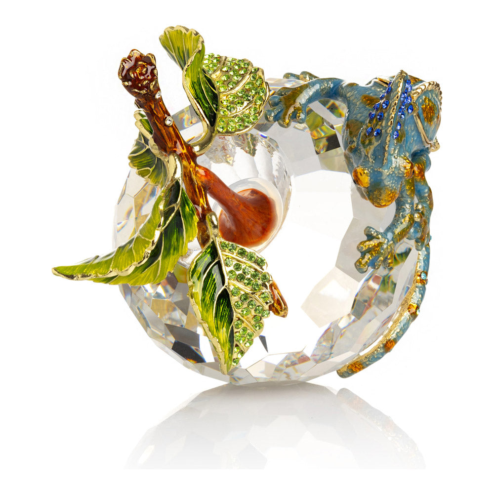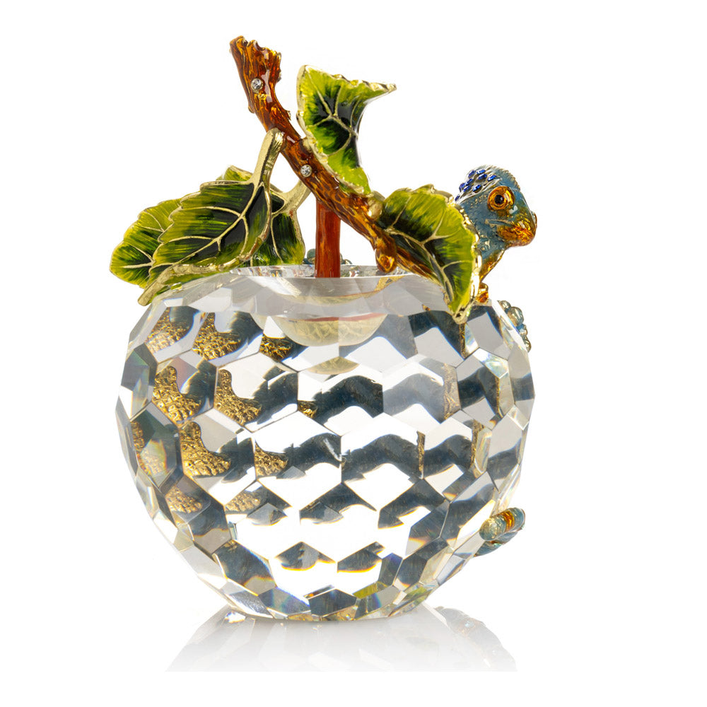 פסל קריסטל ייחודי בצורת תפוח, שבראשו זיקית בעבודת יד - יצירה מהסדרה היוקרתית "חיות על קריסטלים" של האומנית קרן קופל. בסיס הקריסטל, שנחתך בקפידה להחזרת אור בברק מרהיב, מהווה במה מושלמת לזיקית המעוטרת בקריסטלים אוסטריים נוצצים ובצביעה ידנית בטכניקת אמייל ייחודית. השילוב בין הקריסטל המרהיב לעבודת האמנות העדינה יוצר פריט מרהיב וחד-פעמי, מושלם כקישוט יוקרתי או כפריט אספנות נדיר. מגיע באריזת מתנה שחורה אלגנטית.