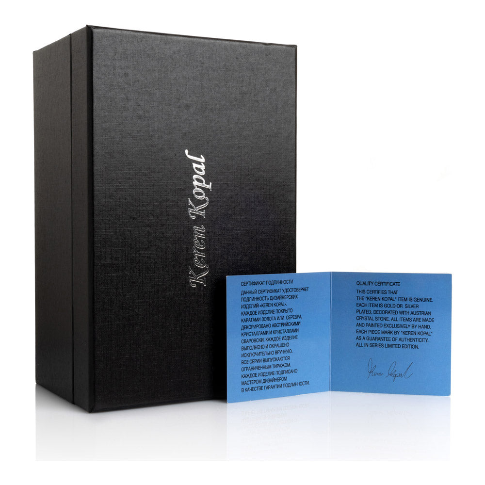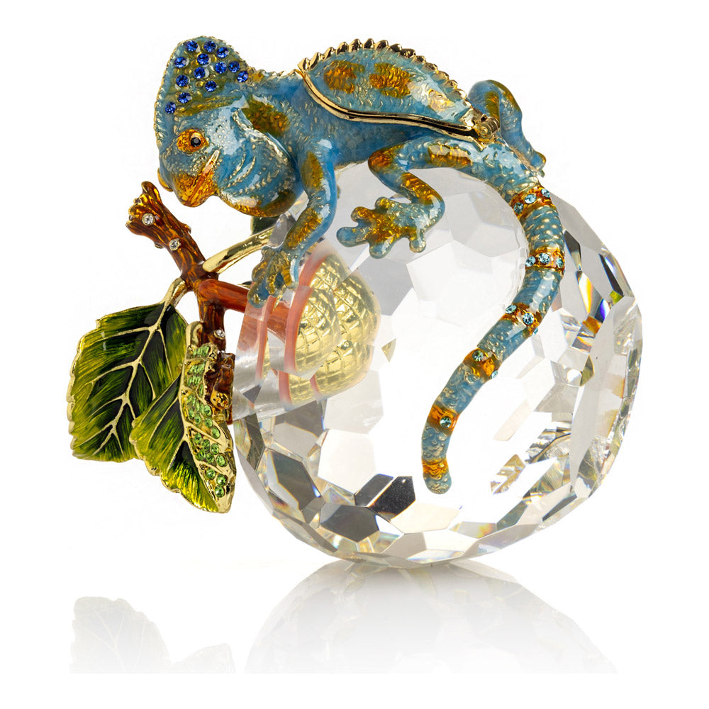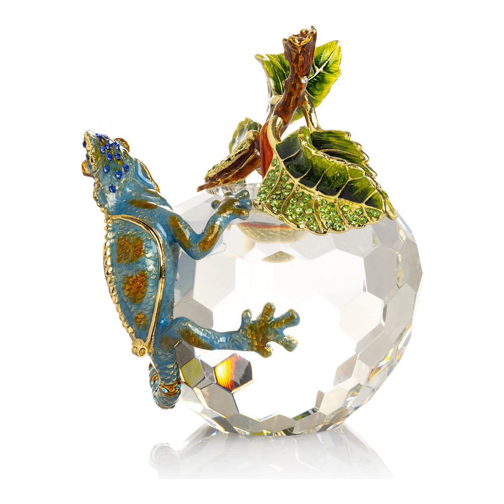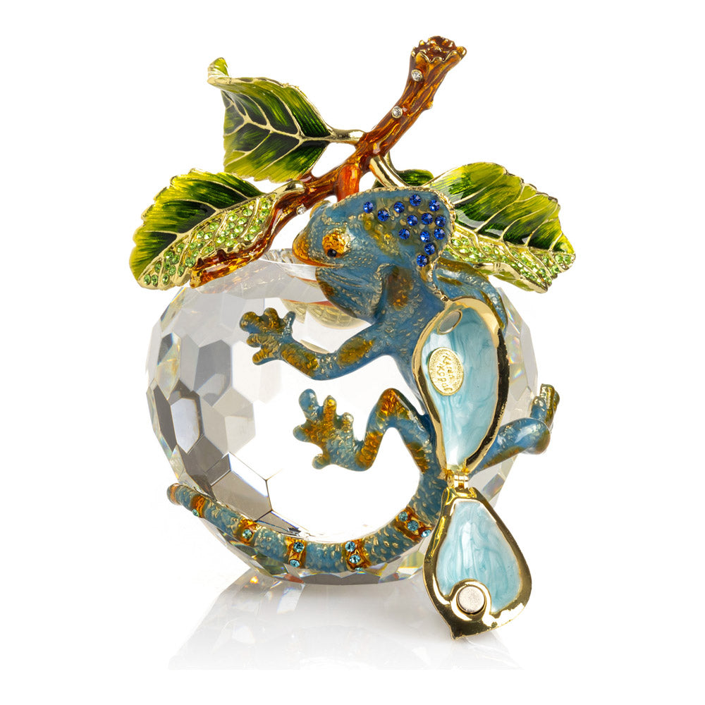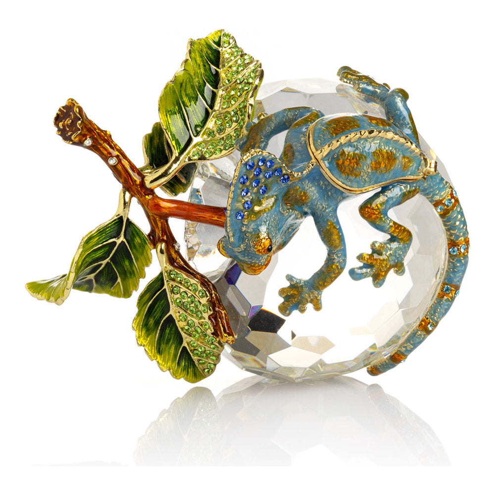 פסל קריסטל ייחודי בצורת תפוח, שבראשו זיקית בעבודת יד - יצירה מהסדרה היוקרתית "חיות על קריסטלים" של האומנית קרן קופל. בסיס הקריסטל, שנחתך בקפידה להחזרת אור בברק מרהיב, מהווה במה מושלמת לזיקית המעוטרת בקריסטלים אוסטריים נוצצים ובצביעה ידנית בטכניקת אמייל ייחודית. השילוב בין הקריסטל המרהיב לעבודת האמנות העדינה יוצר פריט מרהיב וחד-פעמי, מושלם כקישוט יוקרתי או כפריט אספנות נדיר. מגיע באריזת מתנה שחורה אלגנטית.
