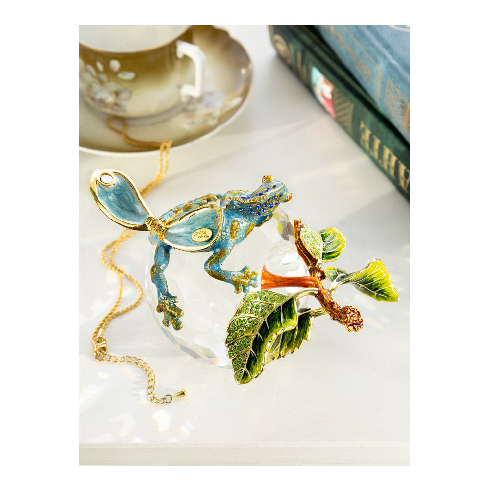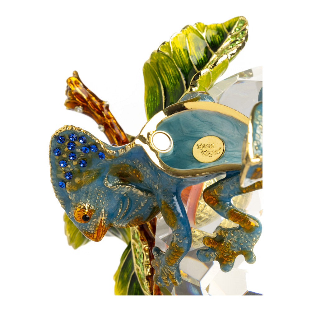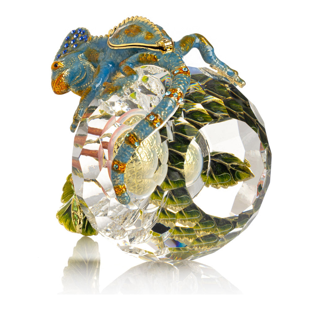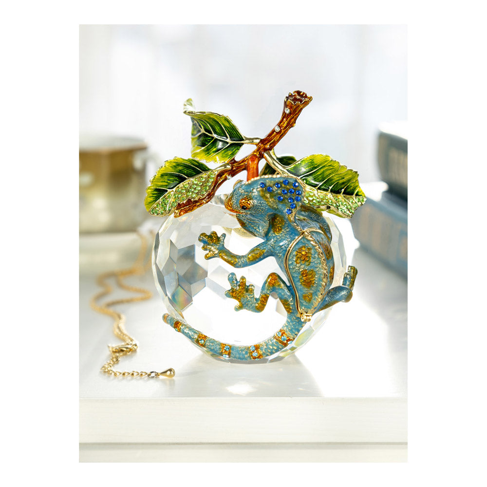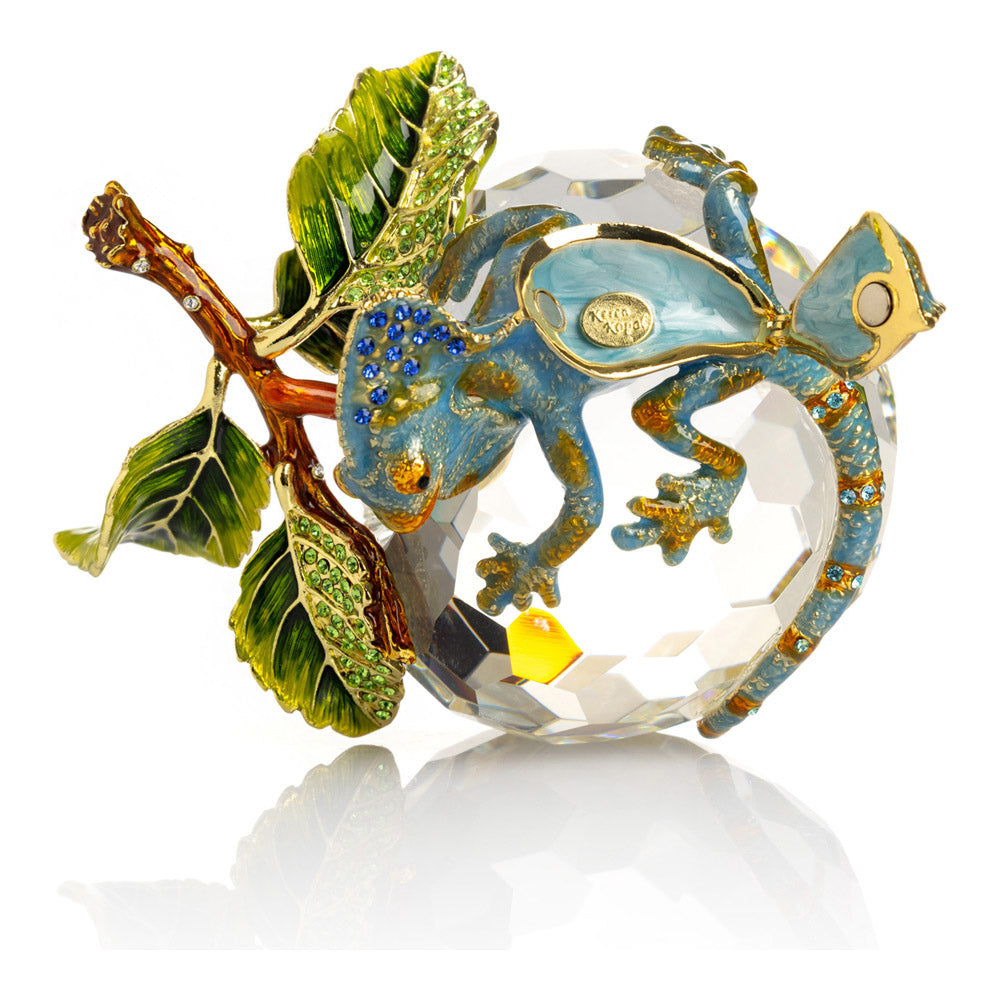 פסל קריסטל ייחודי בצורת תפוח, שבראשו זיקית בעבודת יד - יצירה מהסדרה היוקרתית "חיות על קריסטלים" של האומנית קרן קופל. בסיס הקריסטל, שנחתך בקפידה להחזרת אור בברק מרהיב, מהווה במה מושלמת לזיקית המעוטרת בקריסטלים אוסטריים נוצצים ובצביעה ידנית בטכניקת אמייל ייחודית. השילוב בין הקריסטל המרהיב לעבודת האמנות העדינה יוצר פריט מרהיב וחד-פעמי, מושלם כקישוט יוקרתי או כפריט אספנות נדיר. מגיע באריזת מתנה שחורה אלגנטית.