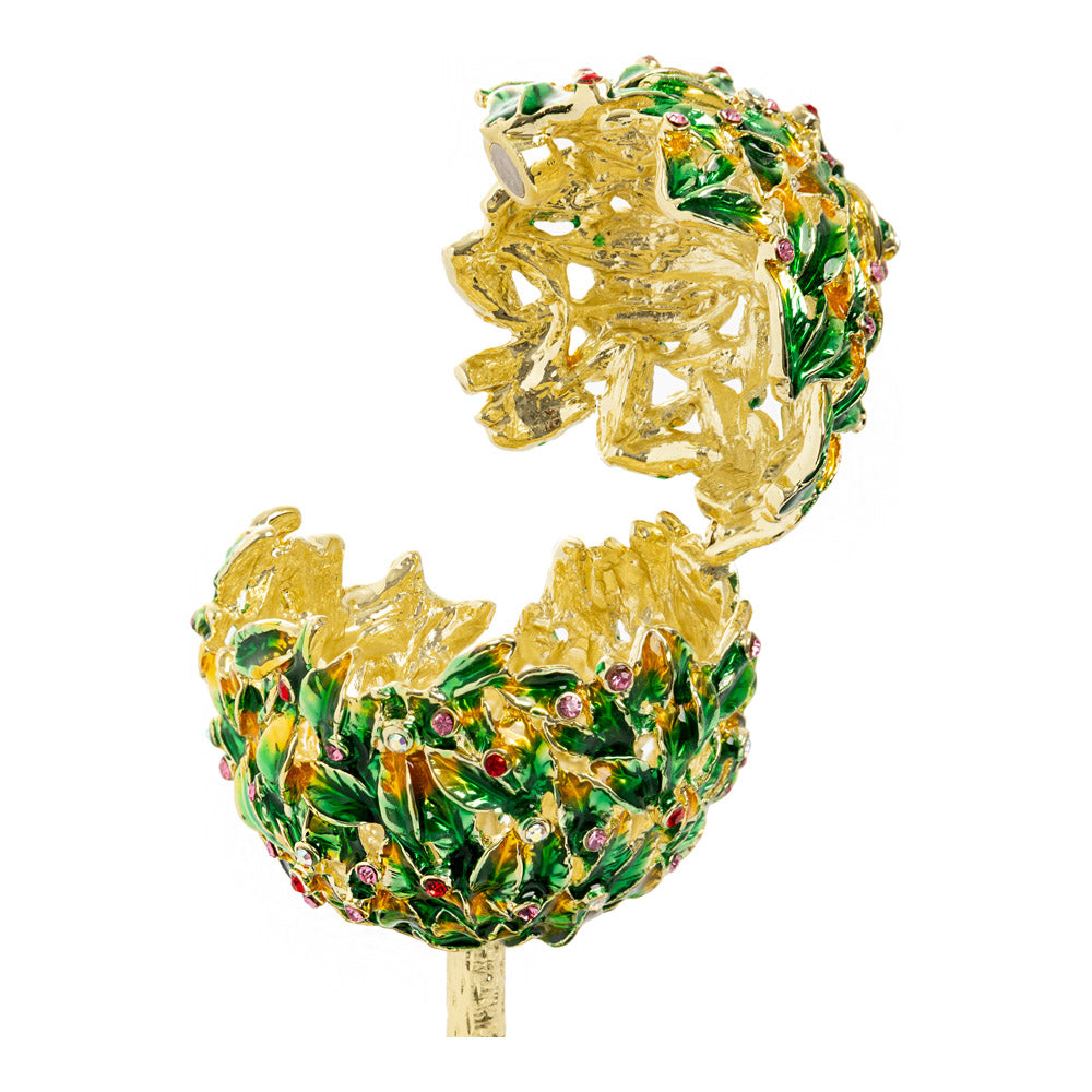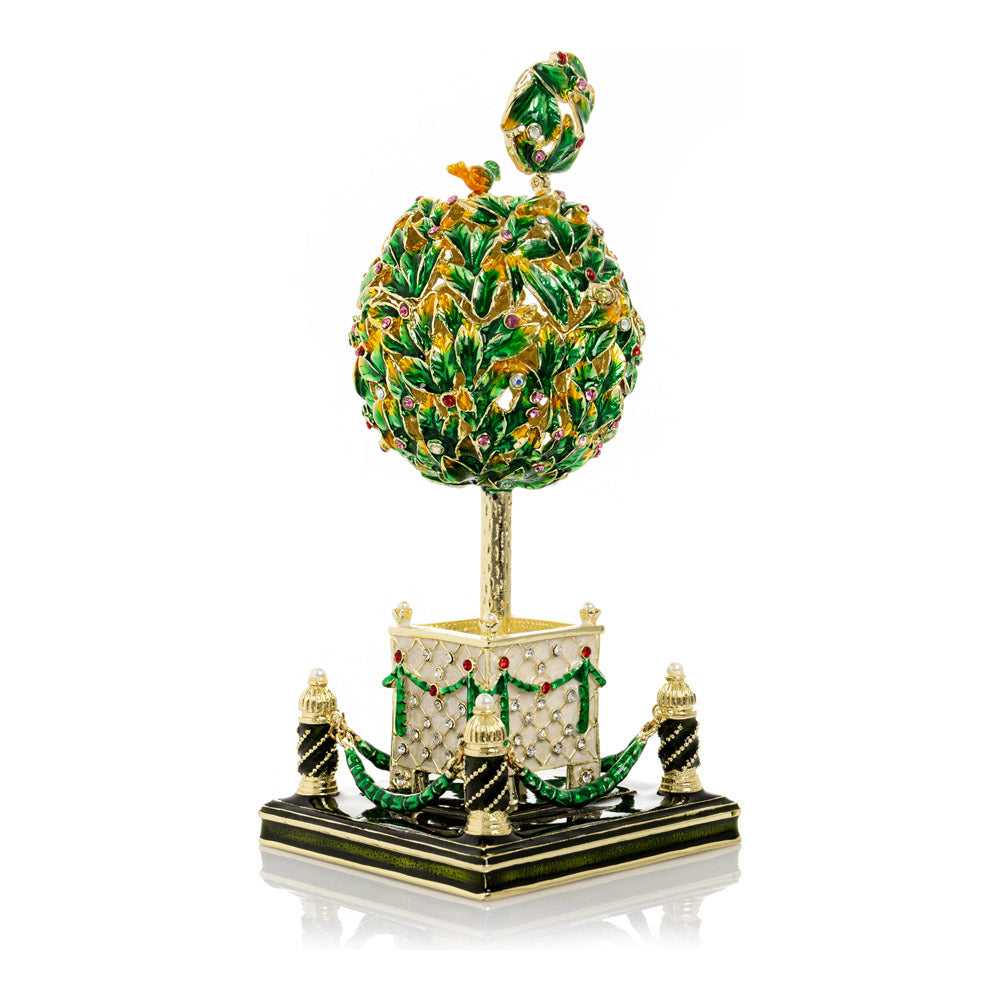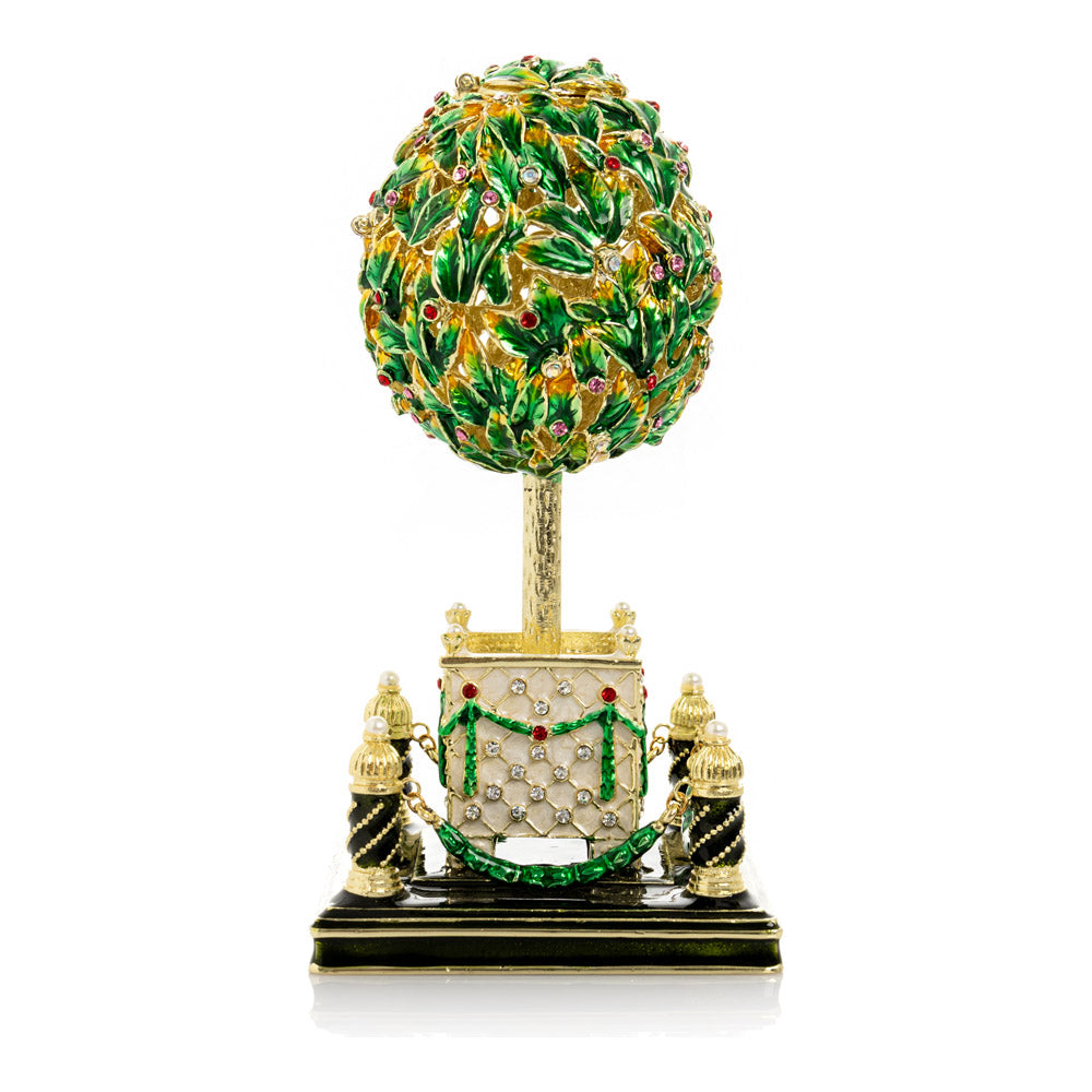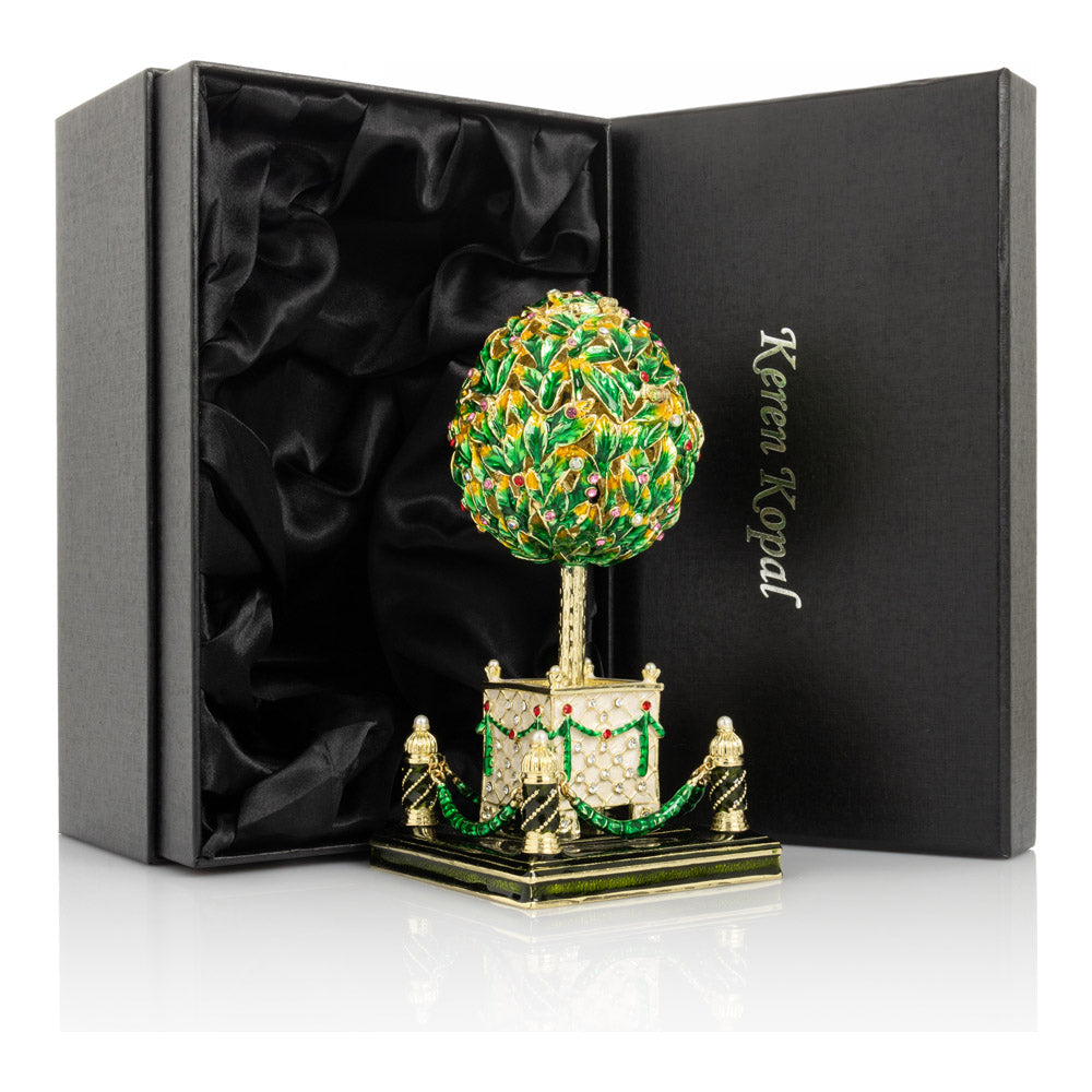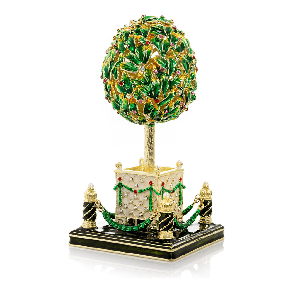 קופסת תכשיטים בעבודת יד בהשראת יצירות הפברז'ה האגדיות, בעיצוב עץ דפנה משובץ קריסטלים צבעוניים מרהיבים. מצופה זהב 24 קראט ומעוטרת בקריסטלים אוסטריים וסברובסקי שנבחרו והוצבו בקפידה, היא משלבת אומנות רוסית ואירופאית ליצירה אלגנטית ועל-זמנית. מוטיב עץ הדפנה, סמל להתחדשות, שגשוג ויופי נצחי, מעניק לפריט עומק ומשמעות. הצביעה הידנית בטכניקת אמייל ייחודית והסגירה המגנטית מבטיחות יופי לצד שימושיות, והביצה מגיעה באריזת מתנה שחורה אלגנטית - מושלמת כמתנת יוקרה או כפריט אספנות נדיר.