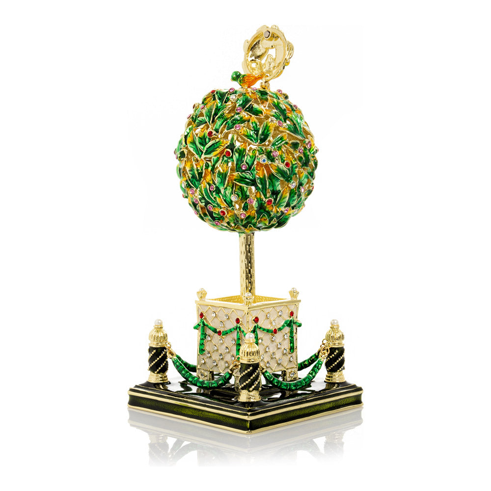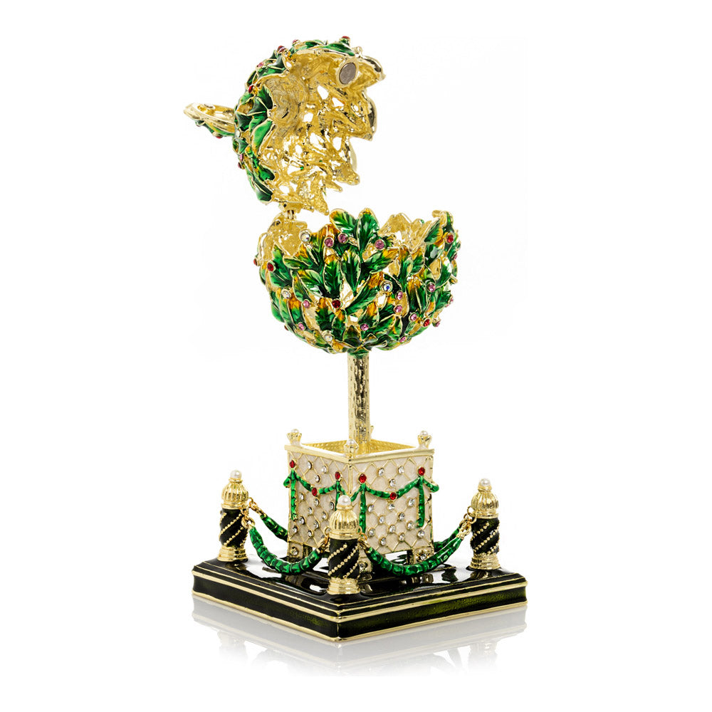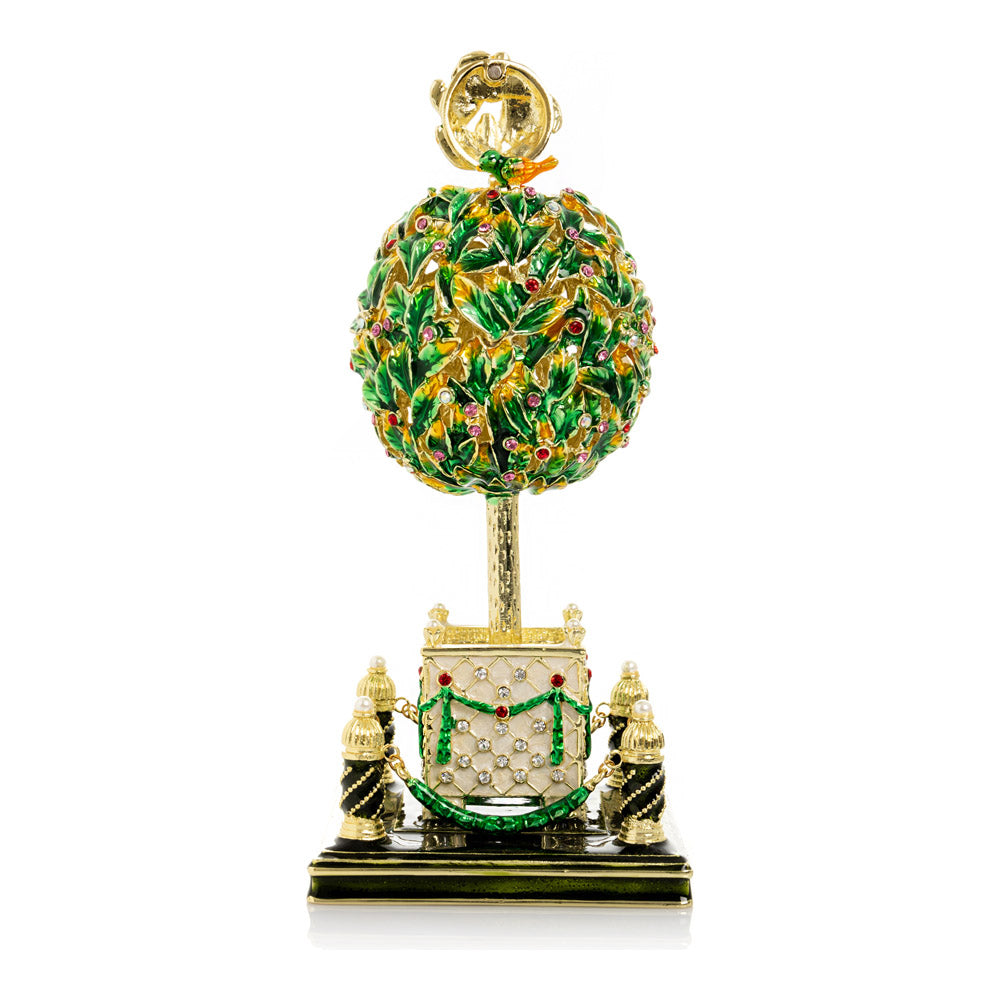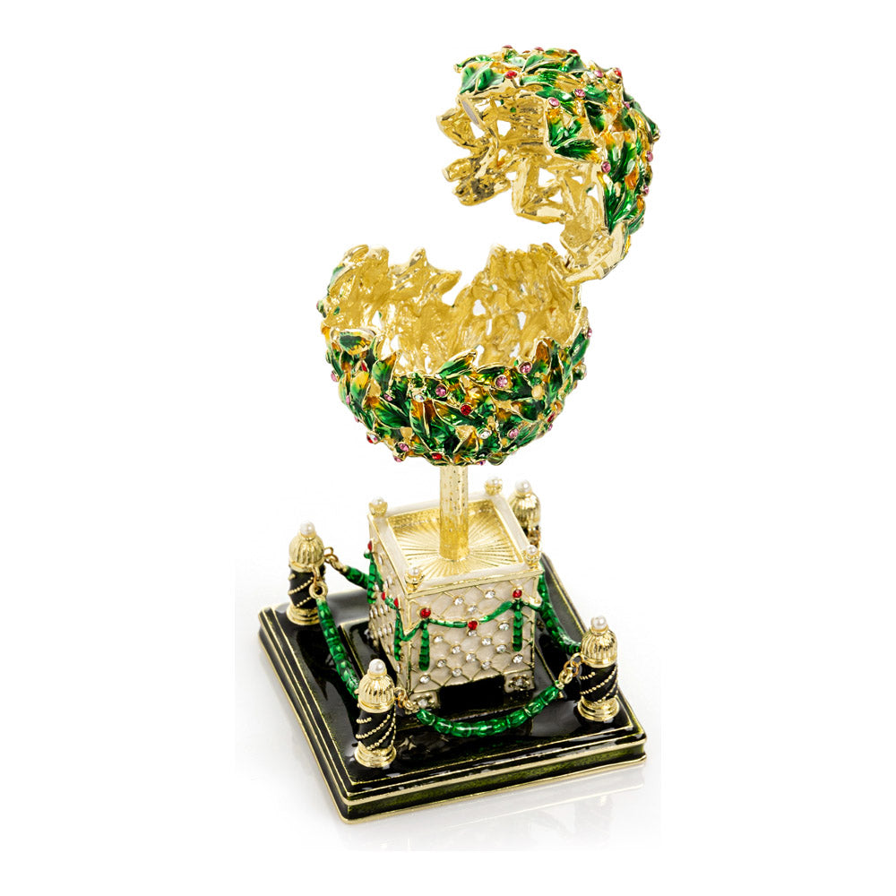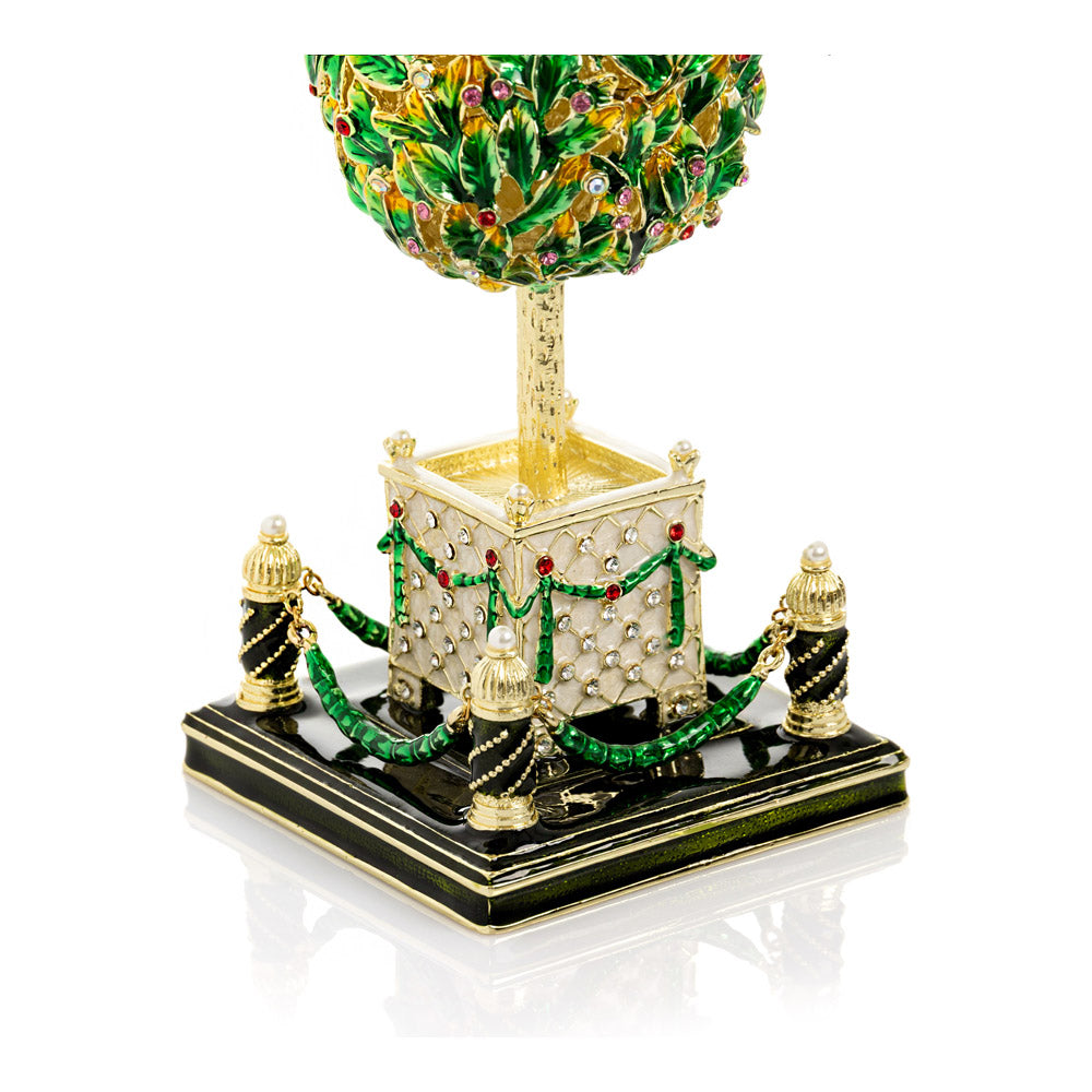 קופסת תכשיטים בעבודת יד בהשראת יצירות הפברז'ה האגדיות, בעיצוב עץ דפנה משובץ קריסטלים צבעוניים מרהיבים. מצופה זהב 24 קראט ומעוטרת בקריסטלים אוסטריים וסברובסקי שנבחרו והוצבו בקפידה, היא משלבת אומנות רוסית ואירופאית ליצירה אלגנטית ועל-זמנית. מוטיב עץ הדפנה, סמל להתחדשות, שגשוג ויופי נצחי, מעניק לפריט עומק ומשמעות. הצביעה הידנית בטכניקת אמייל ייחודית והסגירה המגנטית מבטיחות יופי לצד שימושיות, והביצה מגיעה באריזת מתנה שחורה אלגנטית - מושלמת כמתנת יוקרה או כפריט אספנות נדיר.