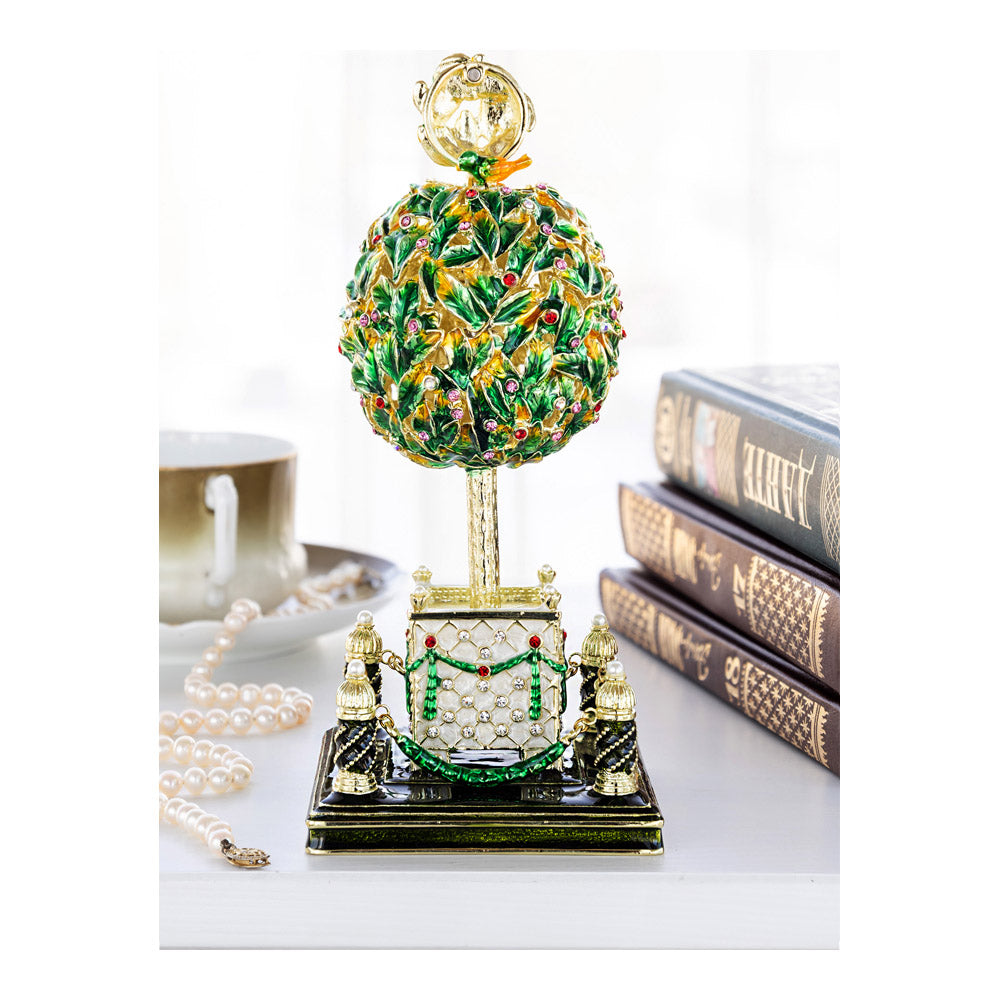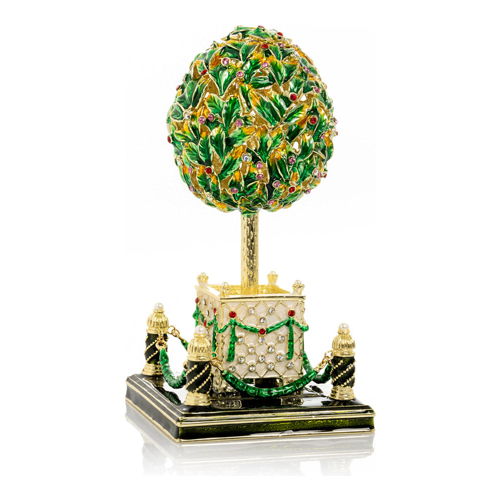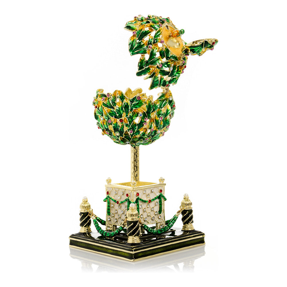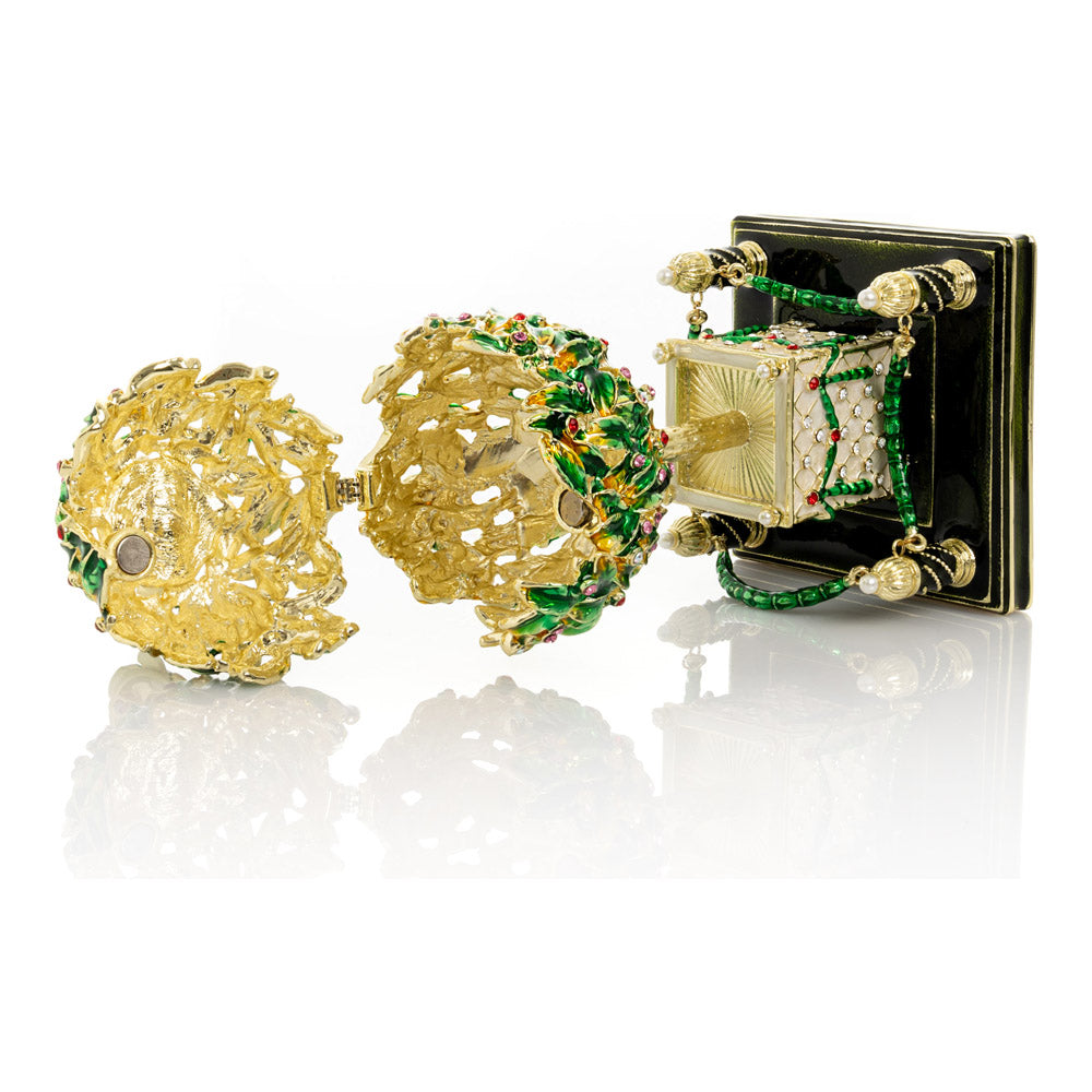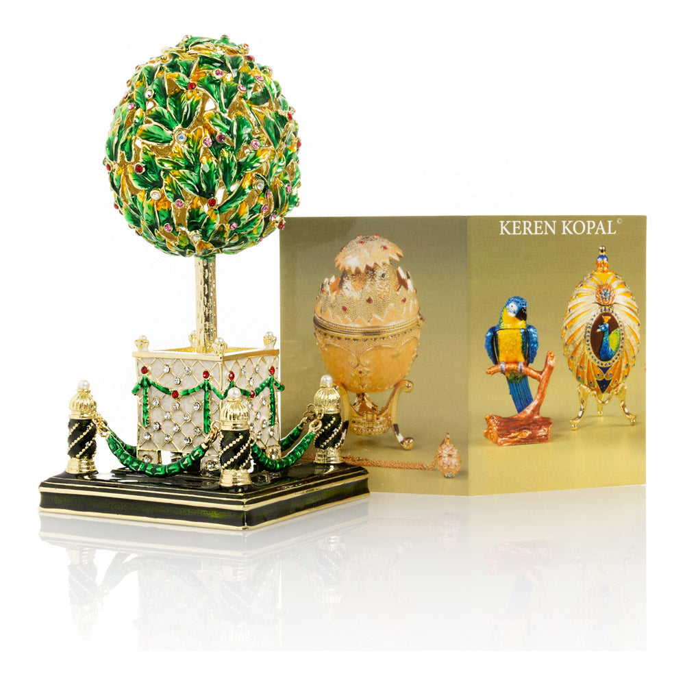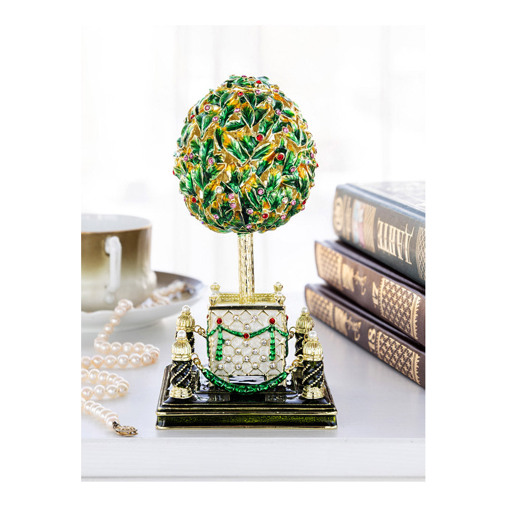 קופסת תכשיטים בעבודת יד בהשראת יצירות הפברז'ה האגדיות, בעיצוב עץ דפנה משובץ קריסטלים צבעוניים מרהיבים. מצופה זהב 24 קראט ומעוטרת בקריסטלים אוסטריים וסברובסקי שנבחרו והוצבו בקפידה, היא משלבת אומנות רוסית ואירופאית ליצירה אלגנטית ועל-זמנית. מוטיב עץ הדפנה, סמל להתחדשות, שגשוג ויופי נצחי, מעניק לפריט עומק ומשמעות. הצביעה הידנית בטכניקת אמייל ייחודית והסגירה המגנטית מבטיחות יופי לצד שימושיות, והביצה מגיעה באריזת מתנה שחורה אלגנטית - מושלמת כמתנת יוקרה או כפריט אספנות נדיר.