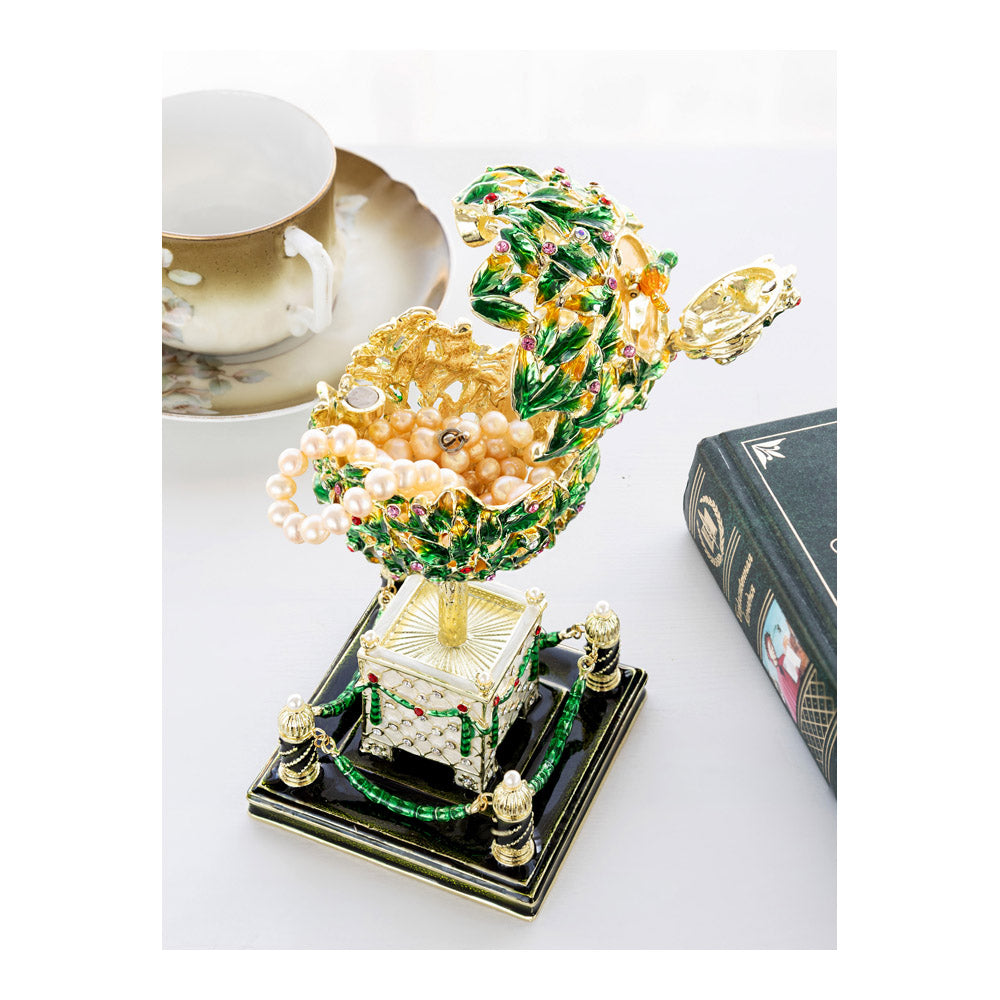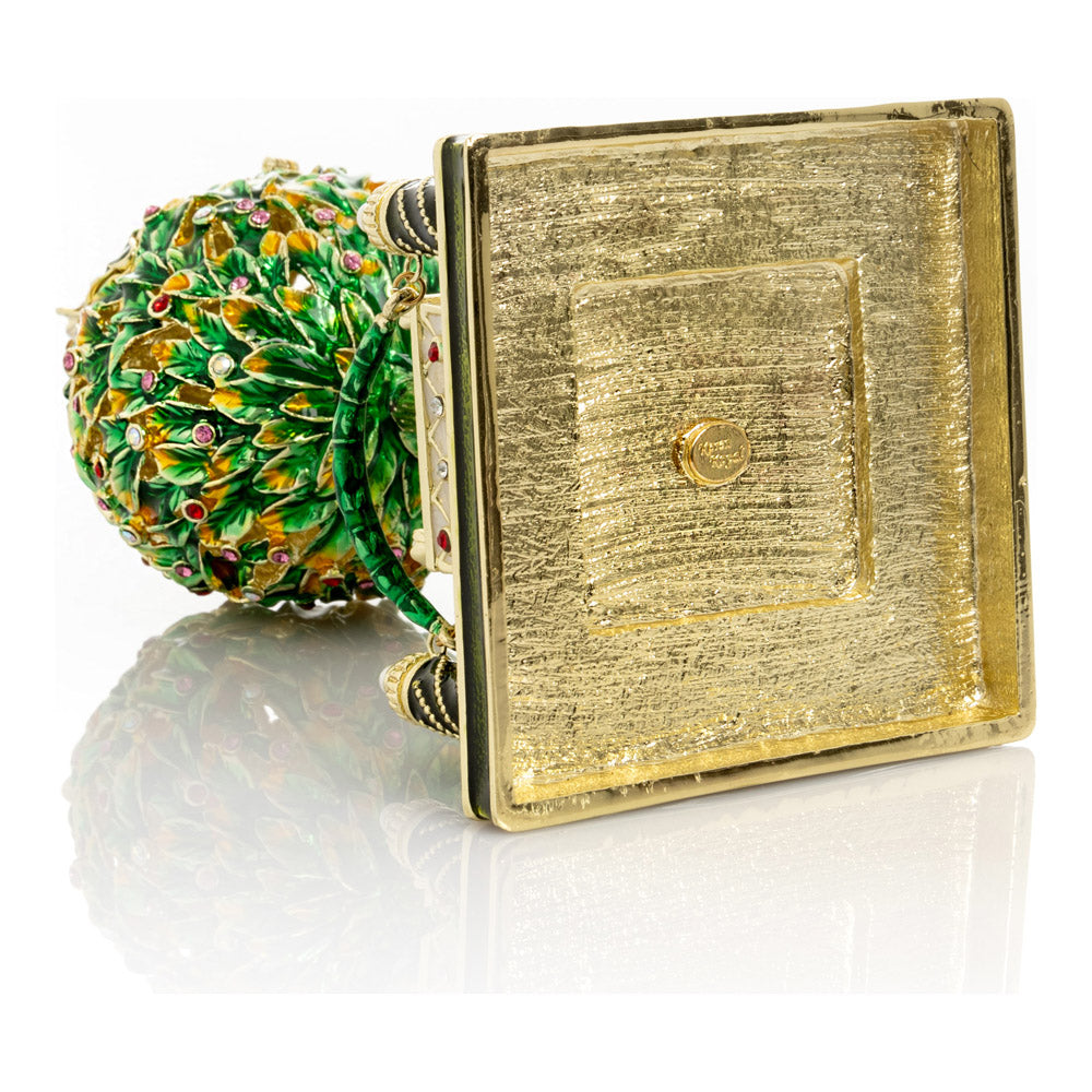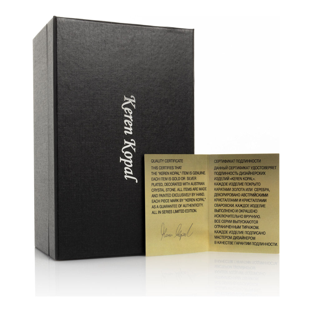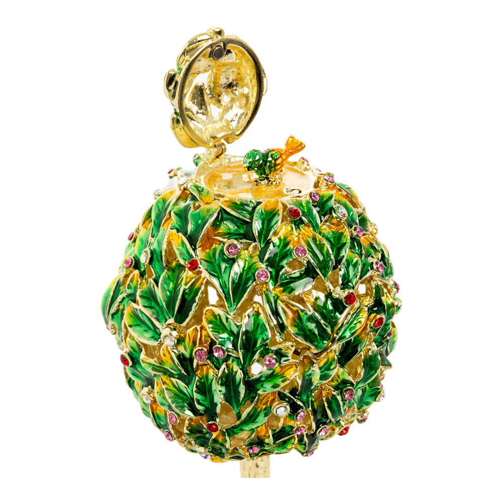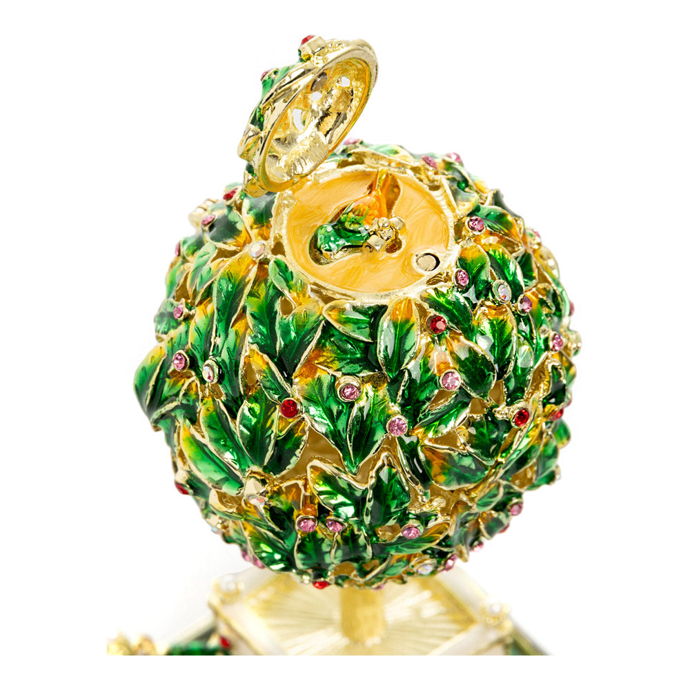 קופסת תכשיטים בעבודת יד בהשראת יצירות הפברז'ה האגדיות, בעיצוב עץ דפנה משובץ קריסטלים צבעוניים מרהיבים. מצופה זהב 24 קראט ומעוטרת בקריסטלים אוסטריים וסברובסקי שנבחרו והוצבו בקפידה, היא משלבת אומנות רוסית ואירופאית ליצירה אלגנטית ועל-זמנית. מוטיב עץ הדפנה, סמל להתחדשות, שגשוג ויופי נצחי, מעניק לפריט עומק ומשמעות. הצביעה הידנית בטכניקת אמייל ייחודית והסגירה המגנטית מבטיחות יופי לצד שימושיות, והביצה מגיעה באריזת מתנה שחורה אלגנטית - מושלמת כמתנת יוקרה או כפריט אספנות נדיר.