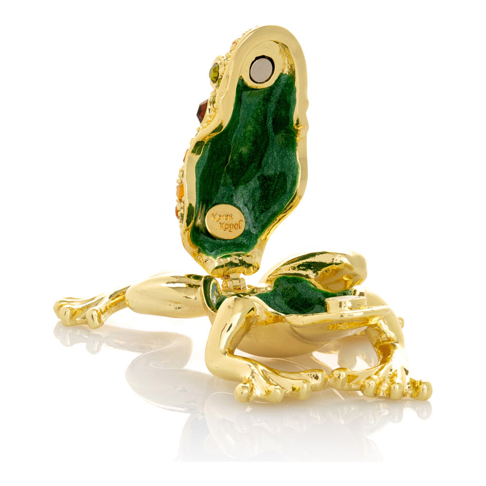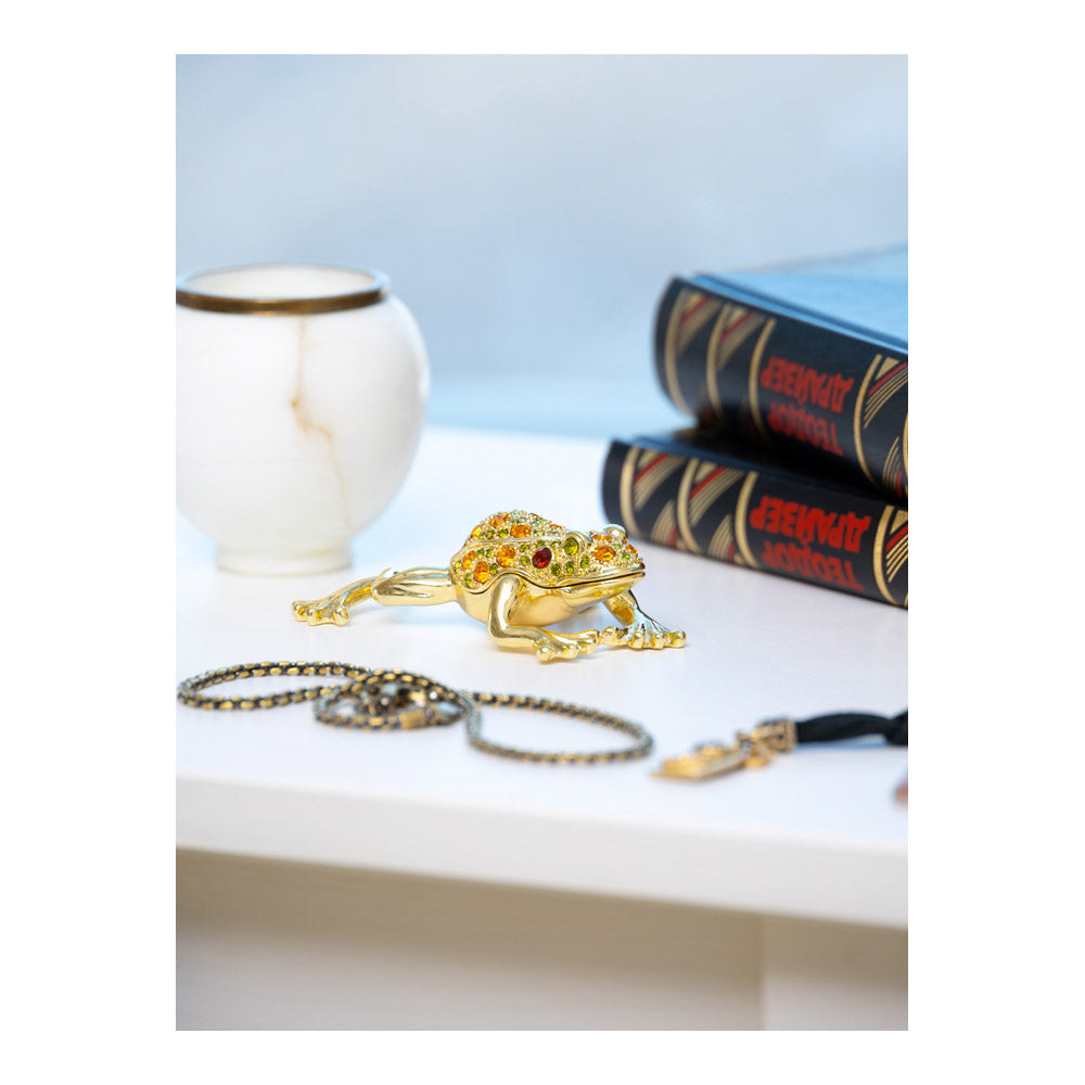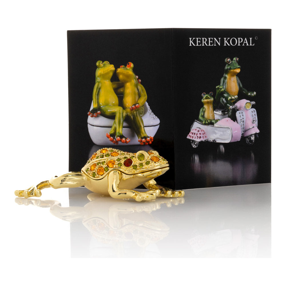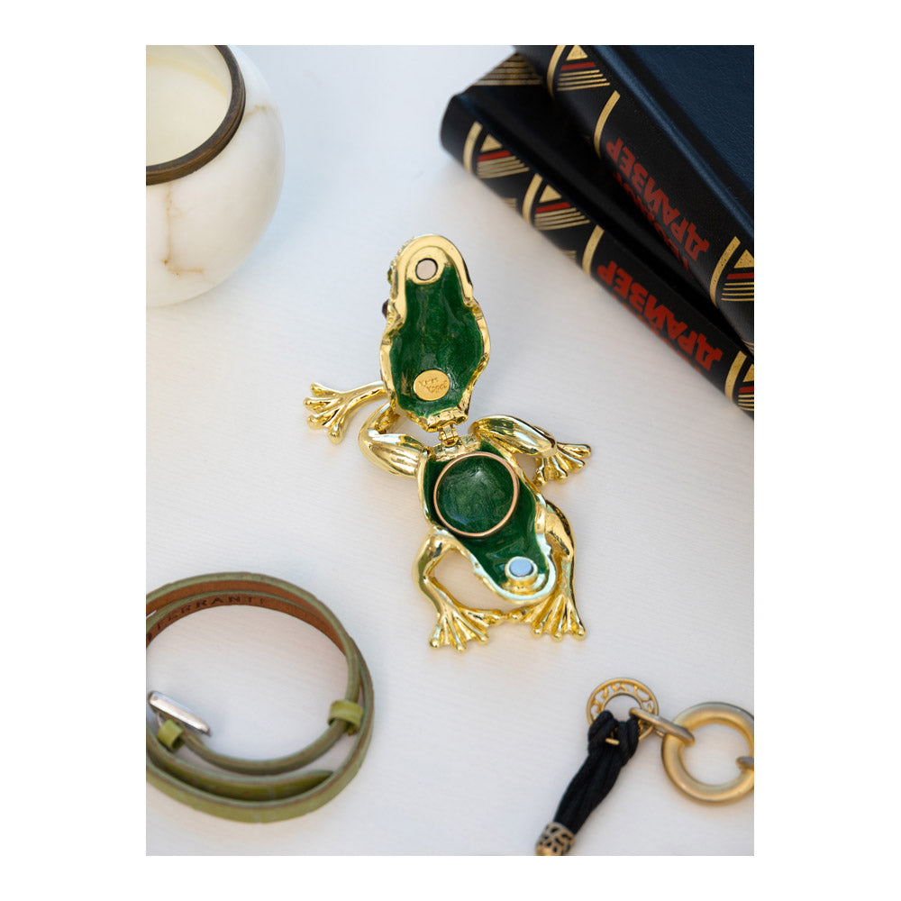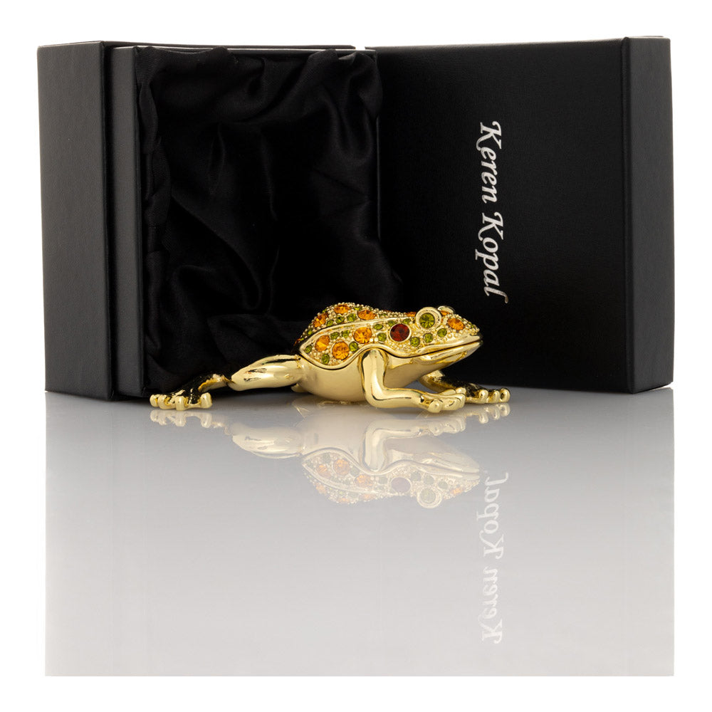קופסת תכשיטים בעבודת יד בעיצוב צפרדע מוזהבת, יצירה יוקרתית מסדרת הצפרדעים של קרן קופל, המושפעת מסגנון האר נובו ומעבודות הפברז'ה האגדיות. מצופה זהב 24 קראט ומעוטרת בקריסטלים אוסטריים וסברובסקי נוצצים, הצביעה הידנית בטכניקת אמייל ייחודית מעניקה לה עומק וברק מרהיב. הצפרדע, סמל למזל, שגשוג והתחדשות בתרבויות רבות, הופכת את הקופסה לפריט אספנות בעל ערך אמנותי ותרבותי גבוה. הסגירה המגנטית מבטיחה שמירה בטוחה על התכולה, והקופסה מגיעה באריזת מתנה שחורה אלגנטית.