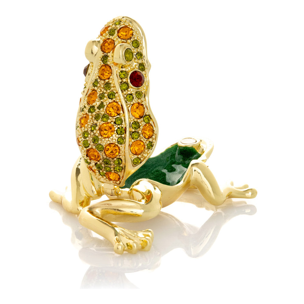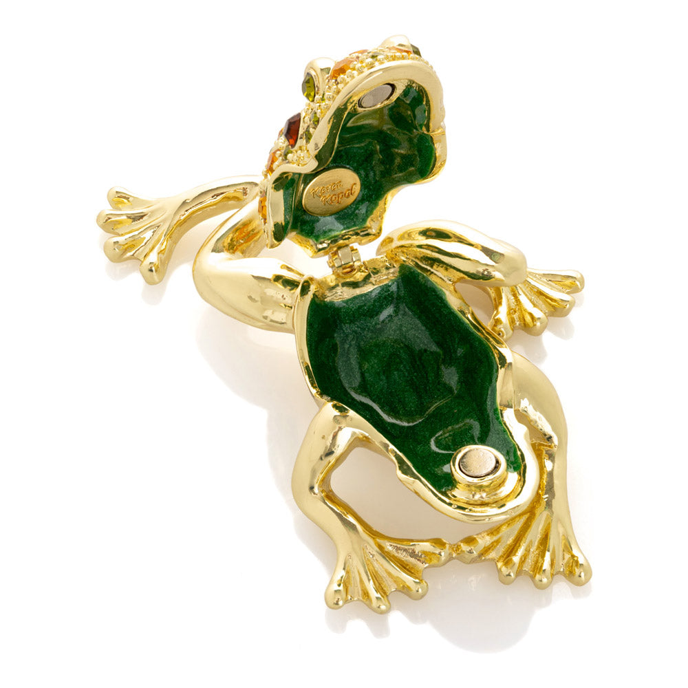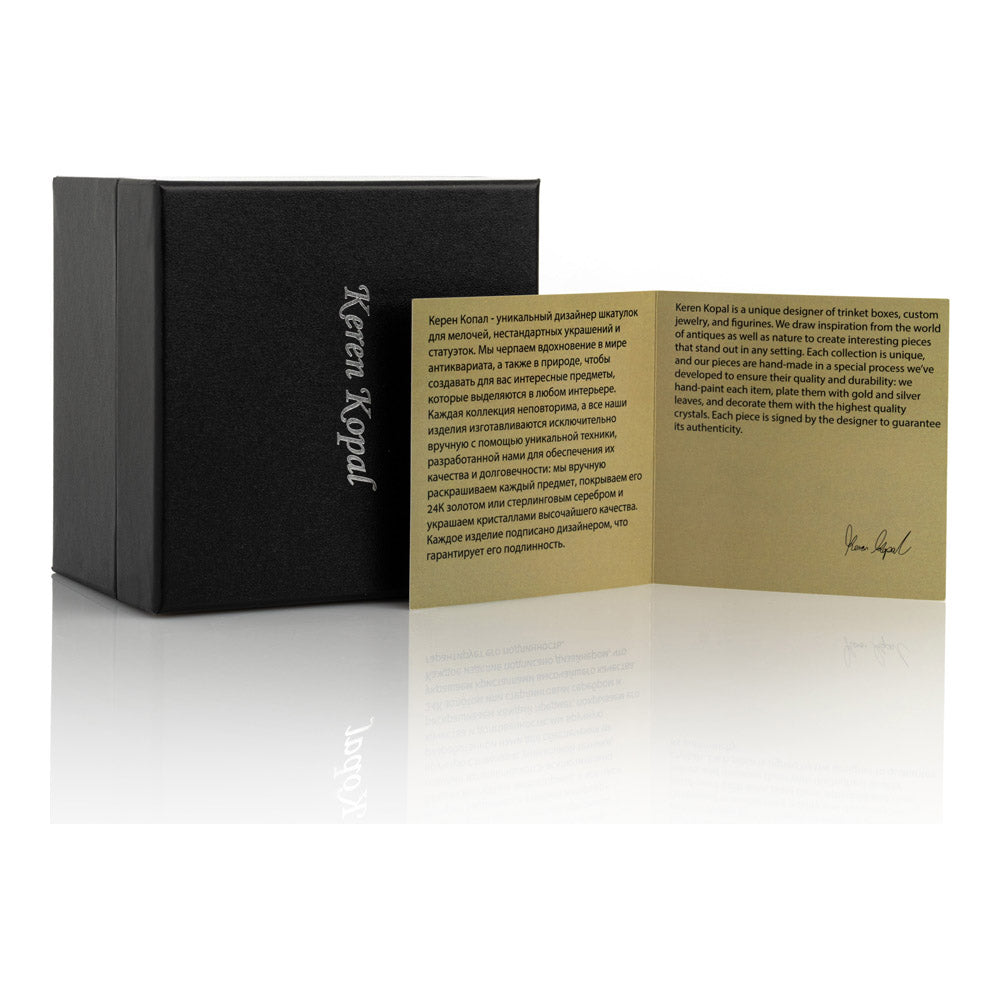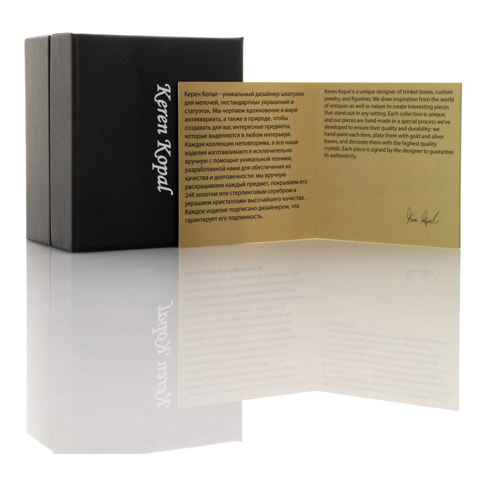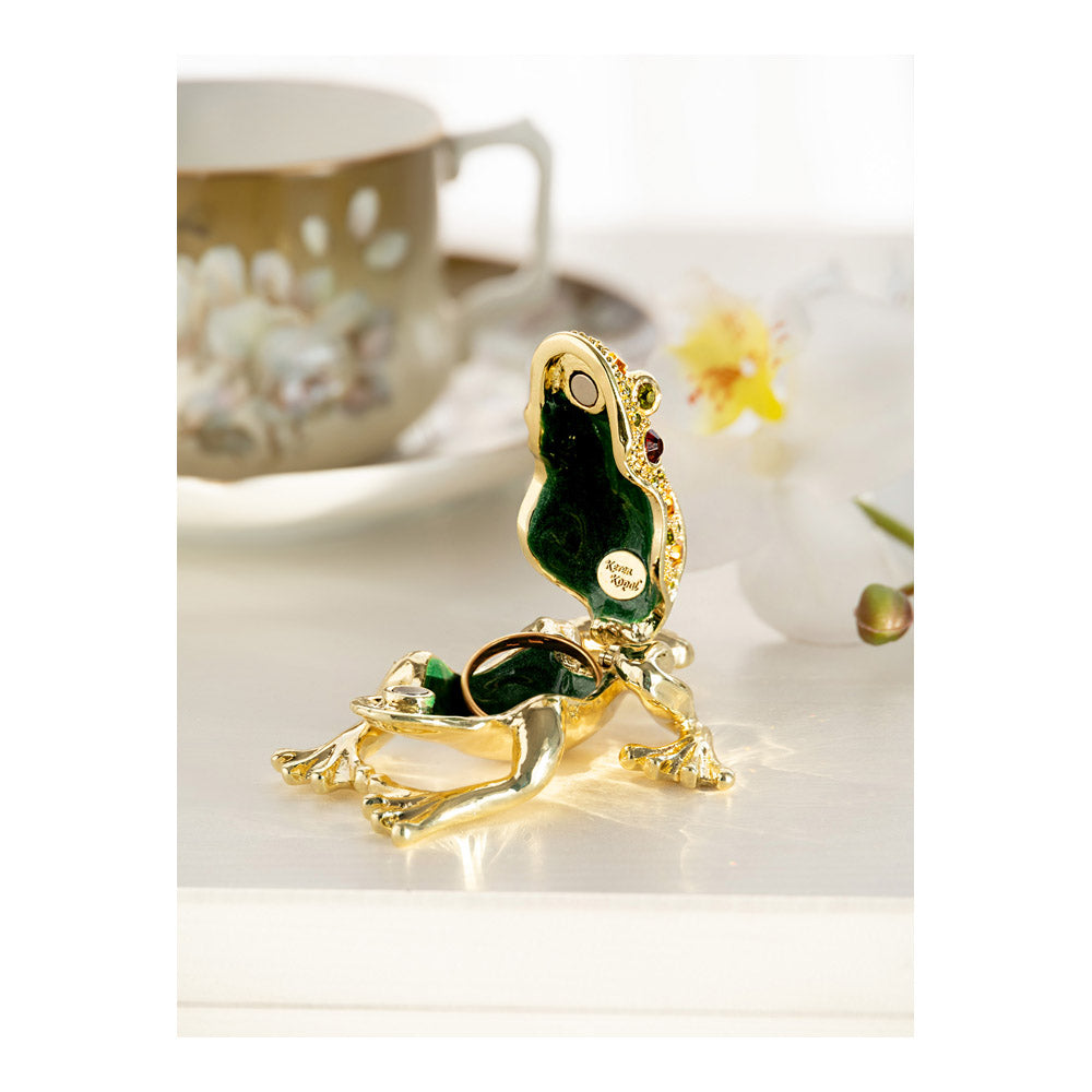 קופסת תכשיטים בעבודת יד בעיצוב צפרדע מוזהבת, יצירה יוקרתית מסדרת הצפרדעים של קרן קופל, המושפעת מסגנון האר נובו ומעבודות הפברז'ה האגדיות. מצופה זהב 24 קראט ומעוטרת בקריסטלים אוסטריים וסברובסקי נוצצים, הצביעה הידנית בטכניקת אמייל ייחודית מעניקה לה עומק וברק מרהיב. הצפרדע, סמל למזל, שגשוג והתחדשות בתרבויות רבות, הופכת את הקופסה לפריט אספנות בעל ערך אמנותי ותרבותי גבוה. הסגירה המגנטית מבטיחה שמירה בטוחה על התכולה, והקופסה מגיעה באריזת מתנה שחורה אלגנטית.