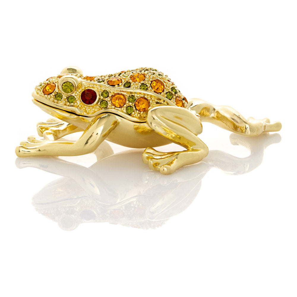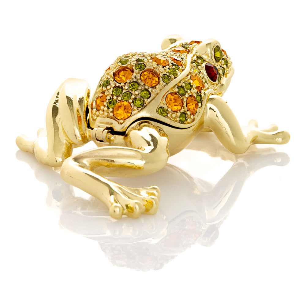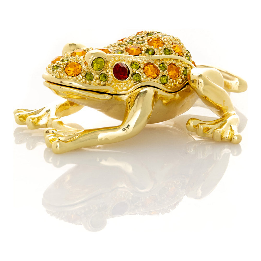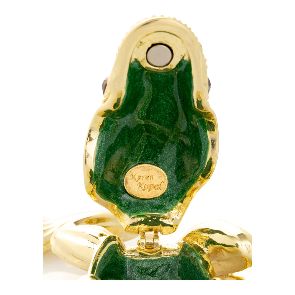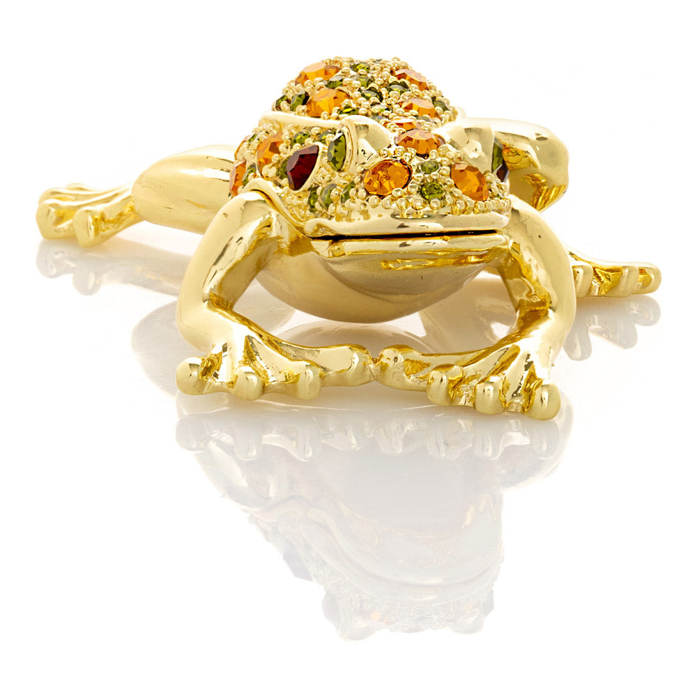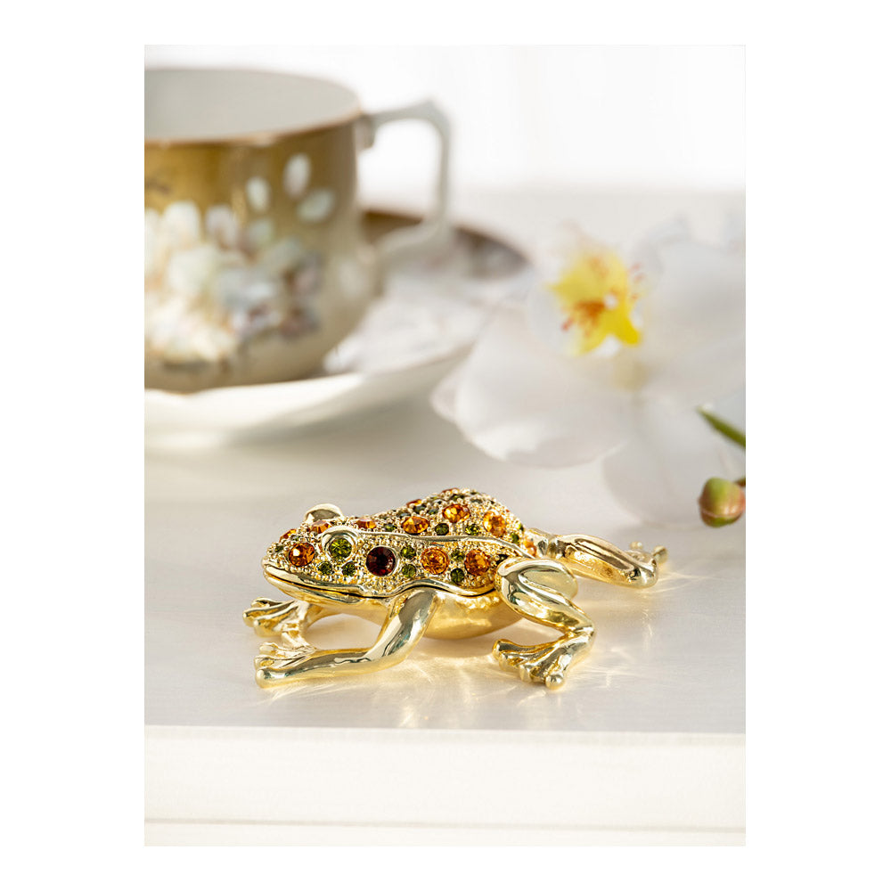 קופסת תכשיטים בעבודת יד בעיצוב צפרדע מוזהבת, יצירה יוקרתית מסדרת הצפרדעים של קרן קופל, המושפעת מסגנון האר נובו ומעבודות הפברז'ה האגדיות. מצופה זהב 24 קראט ומעוטרת בקריסטלים אוסטריים וסברובסקי נוצצים, הצביעה הידנית בטכניקת אמייל ייחודית מעניקה לה עומק וברק מרהיב. הצפרדע, סמל למזל, שגשוג והתחדשות בתרבויות רבות, הופכת את הקופסה לפריט אספנות בעל ערך אמנותי ותרבותי גבוה. הסגירה המגנטית מבטיחה שמירה בטוחה על התכולה, והקופסה מגיעה באריזת מתנה שחורה אלגנטית.