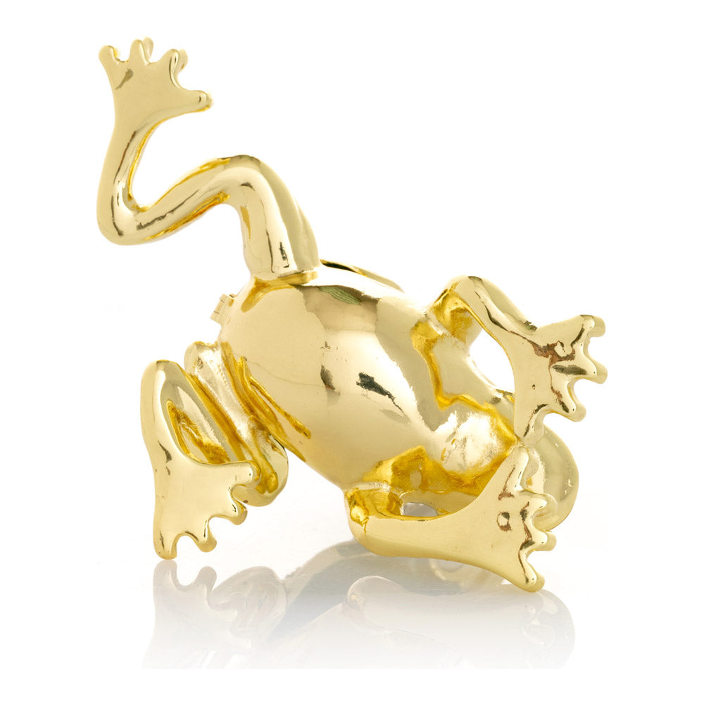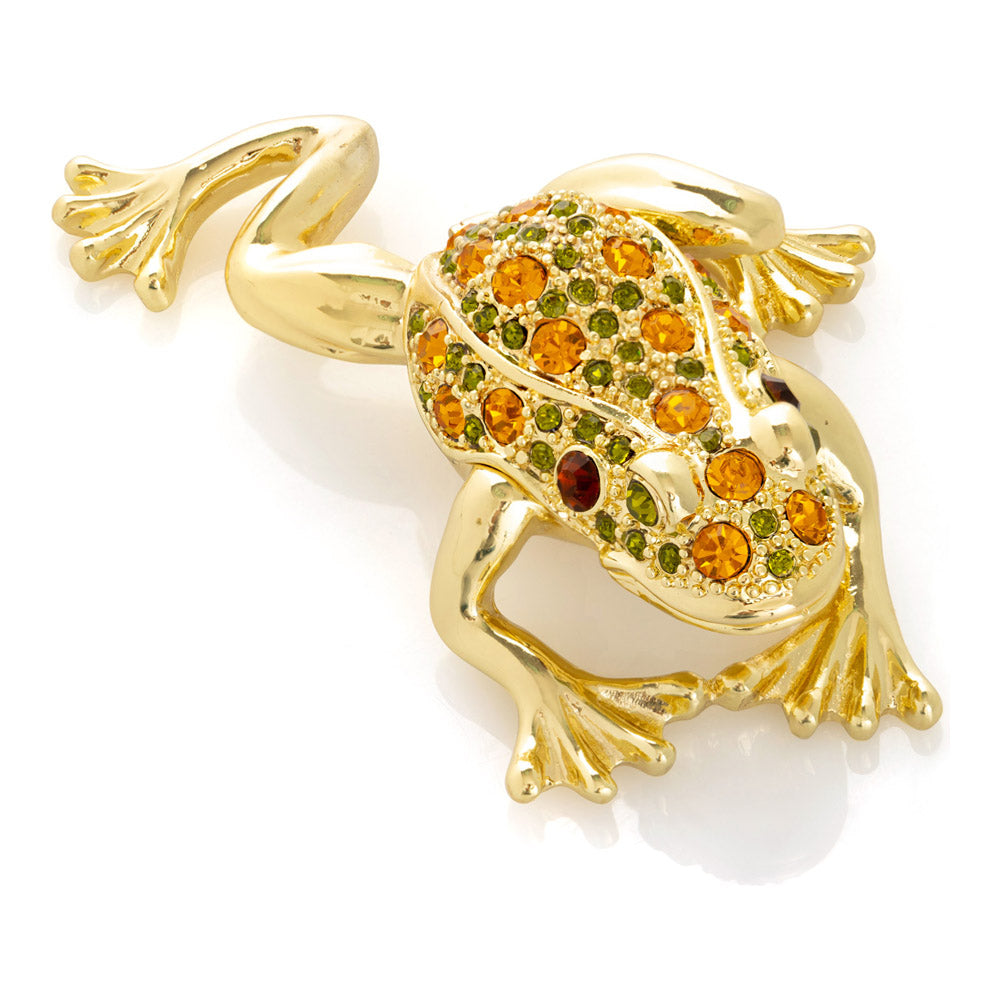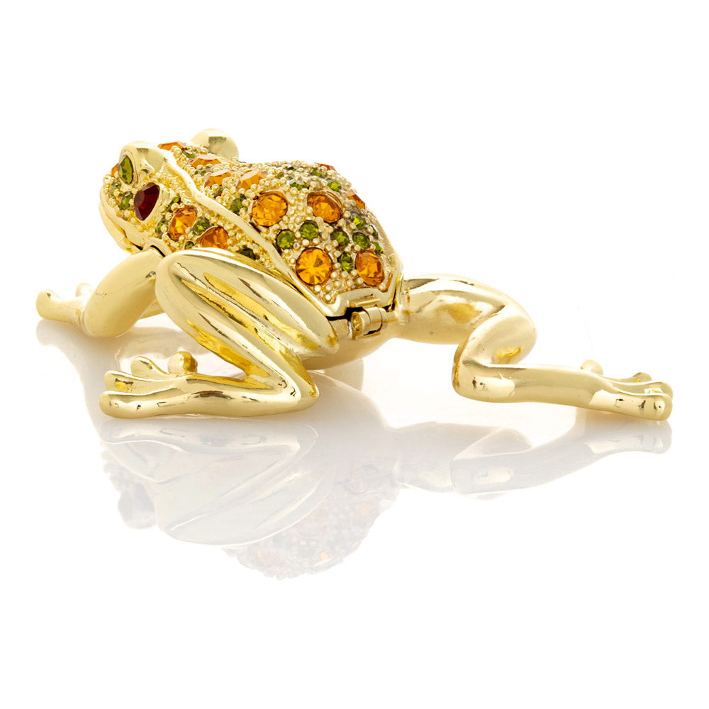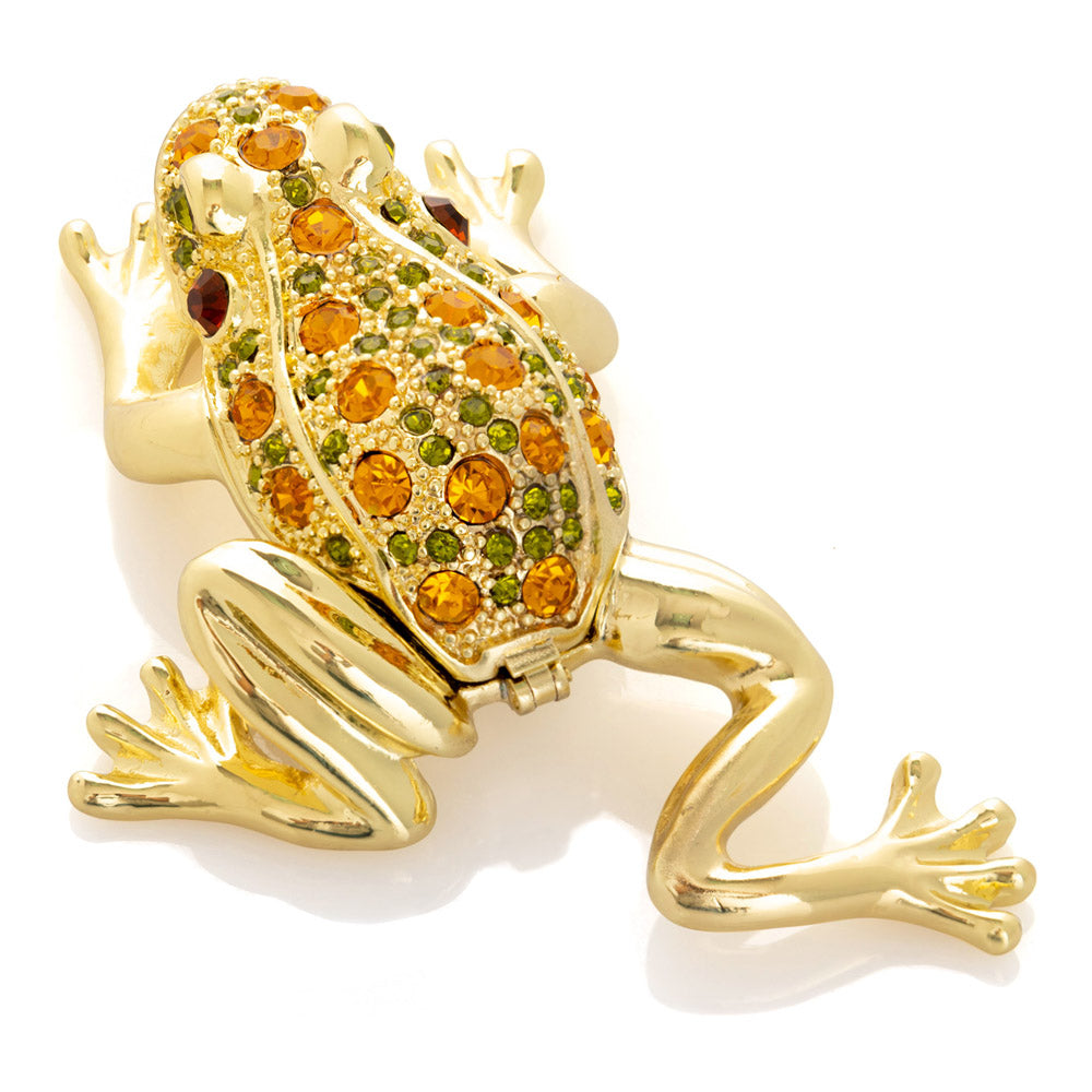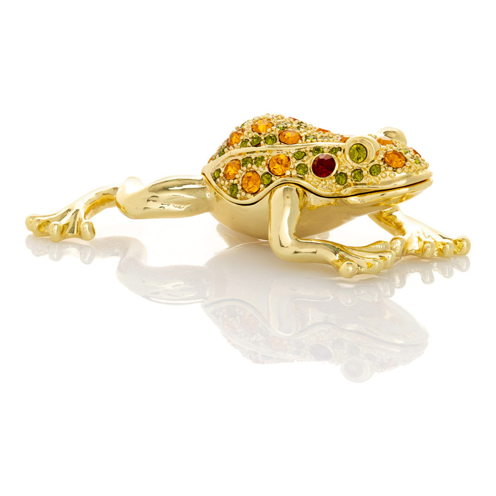 קופסת תכשיטים בעבודת יד בעיצוב צפרדע מוזהבת, יצירה יוקרתית מסדרת הצפרדעים של קרן קופל, המושפעת מסגנון האר נובו ומעבודות הפברז'ה האגדיות. מצופה זהב 24 קראט ומעוטרת בקריסטלים אוסטריים וסברובסקי נוצצים, הצביעה הידנית בטכניקת אמייל ייחודית מעניקה לה עומק וברק מרהיב. הצפרדע, סמל למזל, שגשוג והתחדשות בתרבויות רבות, הופכת את הקופסה לפריט אספנות בעל ערך אמנותי ותרבותי גבוה. הסגירה המגנטית מבטיחה שמירה בטוחה על התכולה, והקופסה מגיעה באריזת מתנה שחורה אלגנטית.
