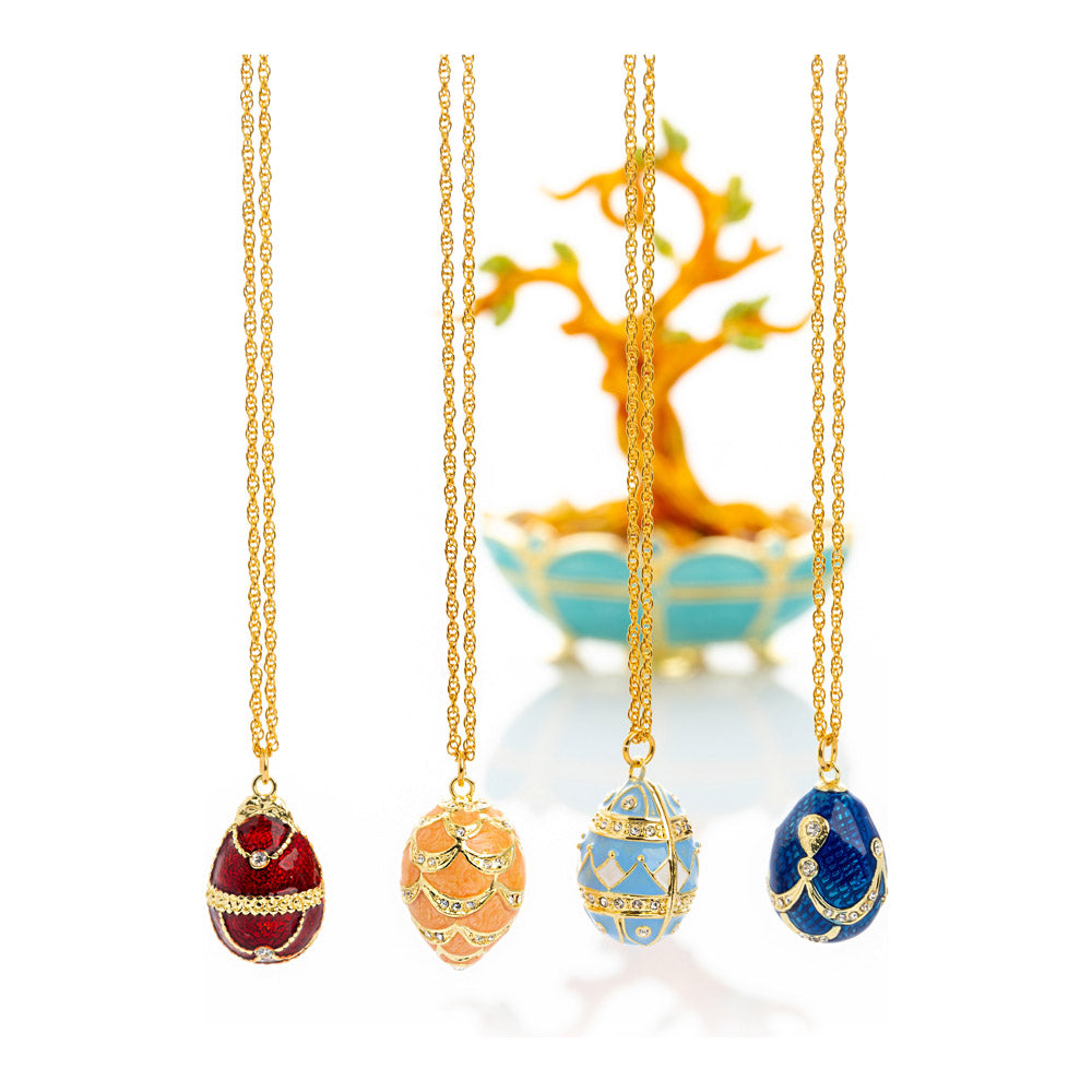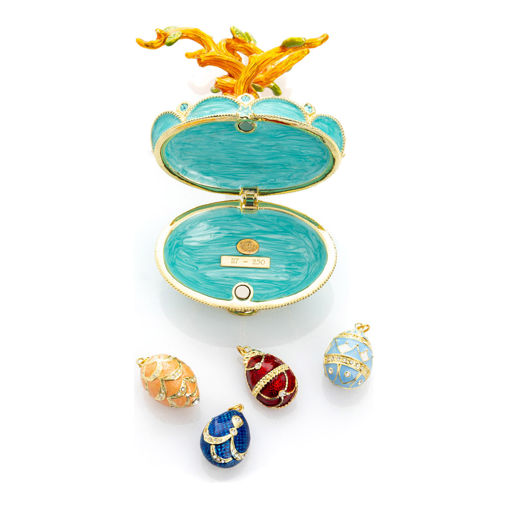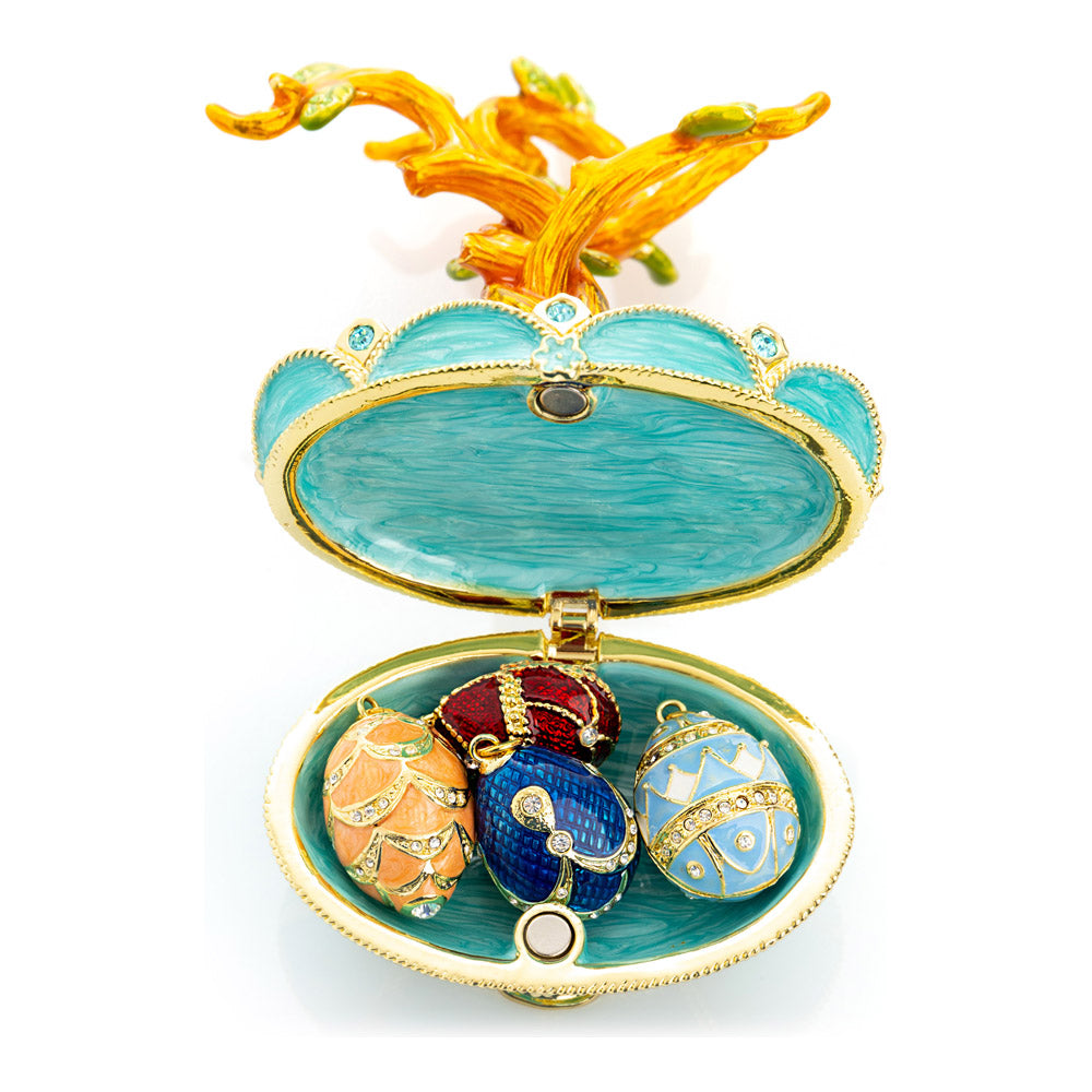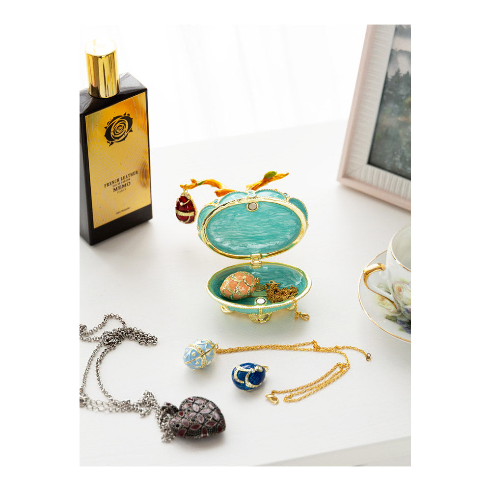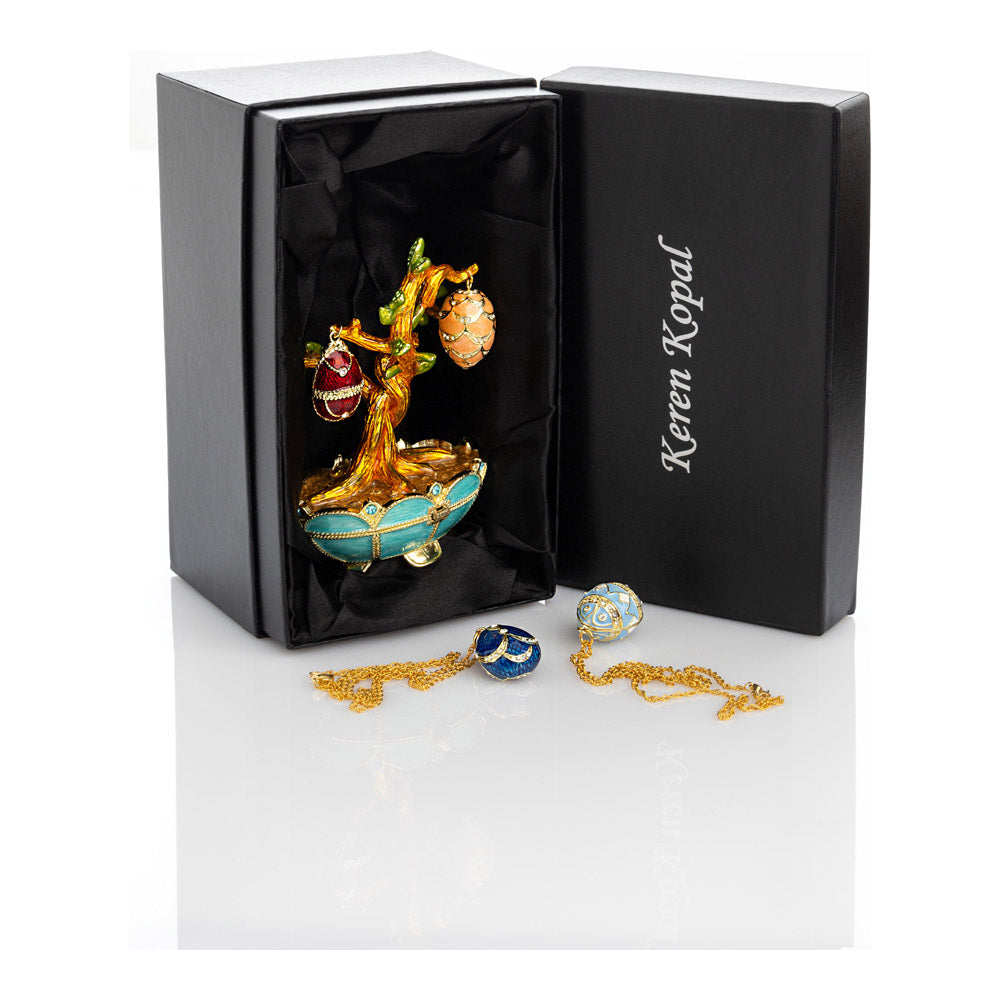 קופסת תכשיטים בעבודת יד בעיצוב עץ אלגנטי הנושא תליוני ביצי פברז'ה זעירות, פריט ייחודי ומהודר במהדורה מוגבלת. מצופה זהב 24 קראט או כסף 925, ומשובץ בקריסטלים אוסטריים נוצצים שנבחרו והוצבו אחד-אחד בעבודת יד. הצביעה הידנית בטכניקת אמייל ייחודית מעניקה עומק, צבעוניות וברק מרהיב, בעוד הסגירה המגנטית מבטיחה שמירה בטוחה על התכולה. יצירה זו מהווה שילוב מושלם של אומנות, יוקרה וערך אספני, ומגיעה באריזת מתנה שחורה אלגנטית.