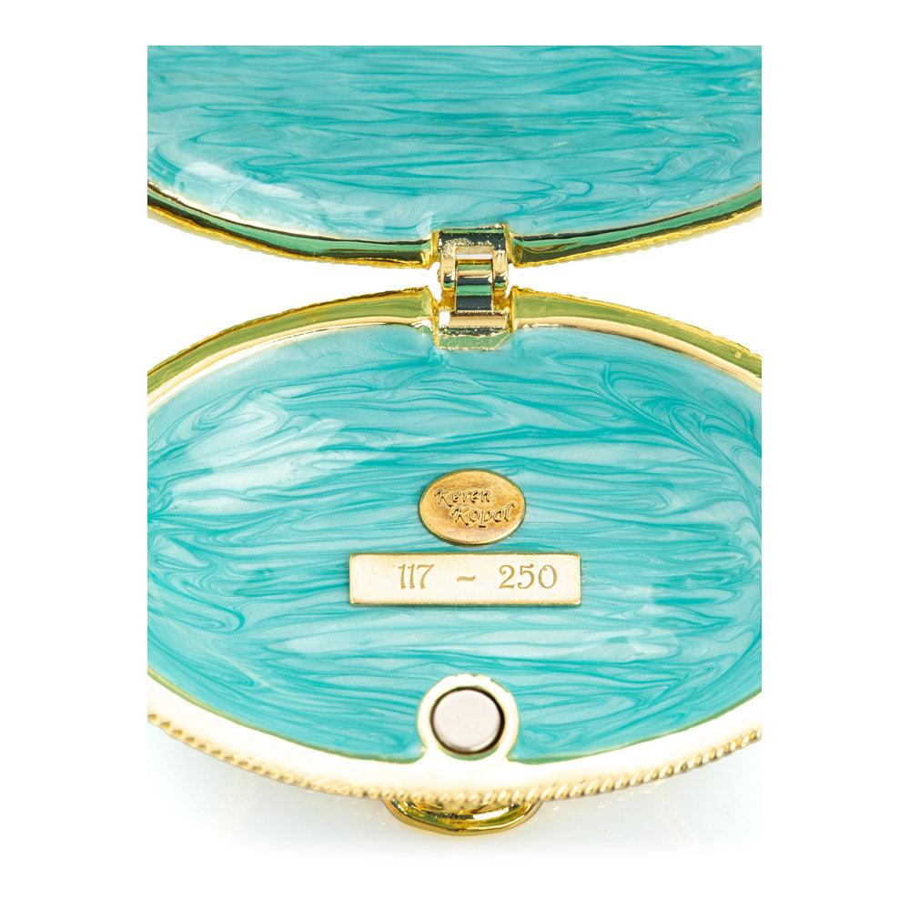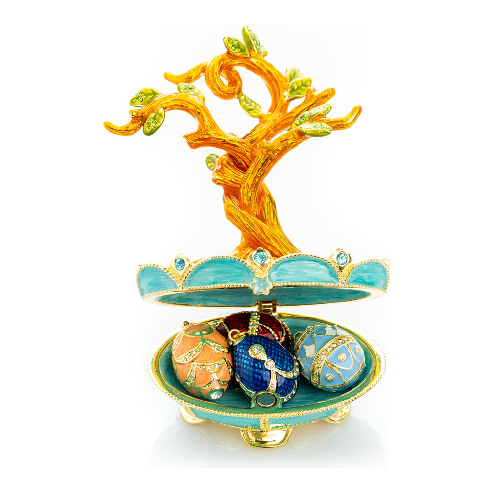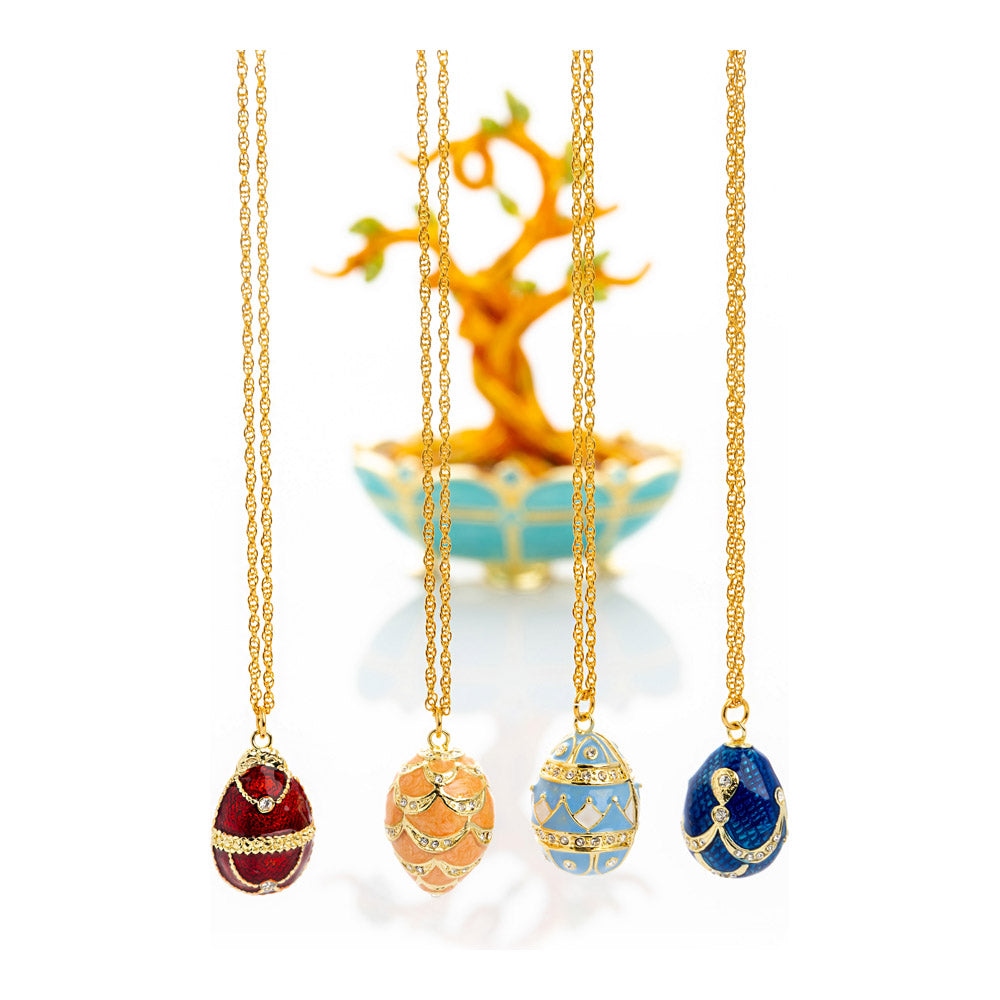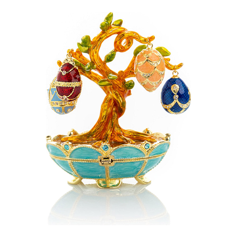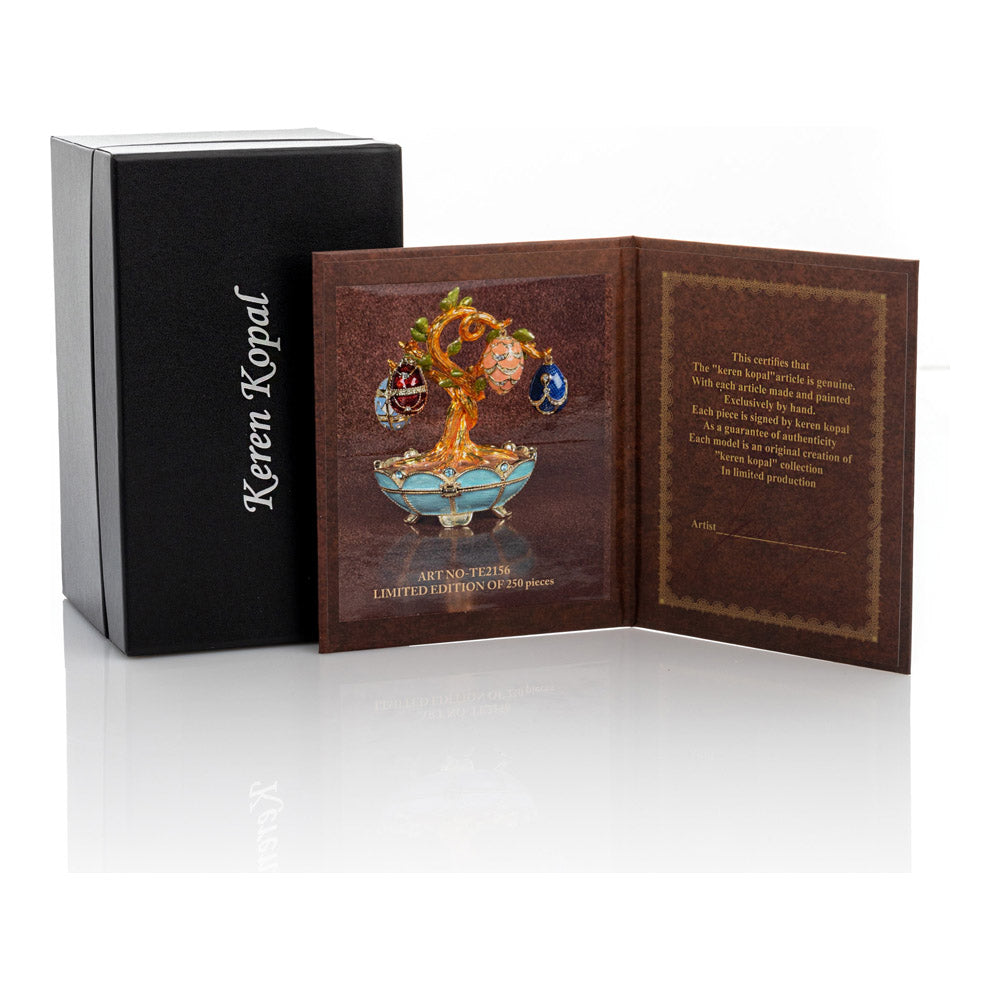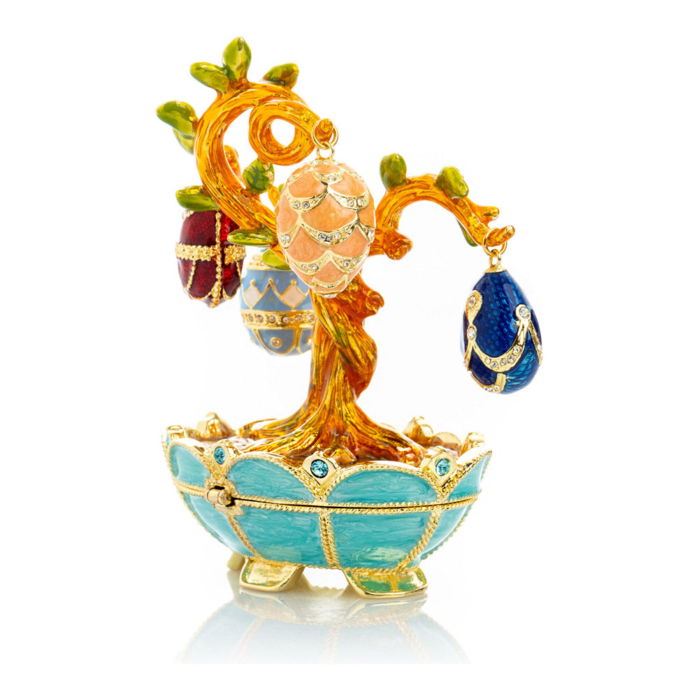 קופסת תכשיטים בעבודת יד בעיצוב עץ אלגנטי הנושא תליוני ביצי פברז'ה זעירות, פריט ייחודי ומהודר במהדורה מוגבלת. מצופה זהב 24 קראט או כסף 925, ומשובץ בקריסטלים אוסטריים נוצצים שנבחרו והוצבו אחד-אחד בעבודת יד. הצביעה הידנית בטכניקת אמייל ייחודית מעניקה עומק, צבעוניות וברק מרהיב, בעוד הסגירה המגנטית מבטיחה שמירה בטוחה על התכולה. יצירה זו מהווה שילוב מושלם של אומנות, יוקרה וערך אספני, ומגיעה באריזת מתנה שחורה אלגנטית.