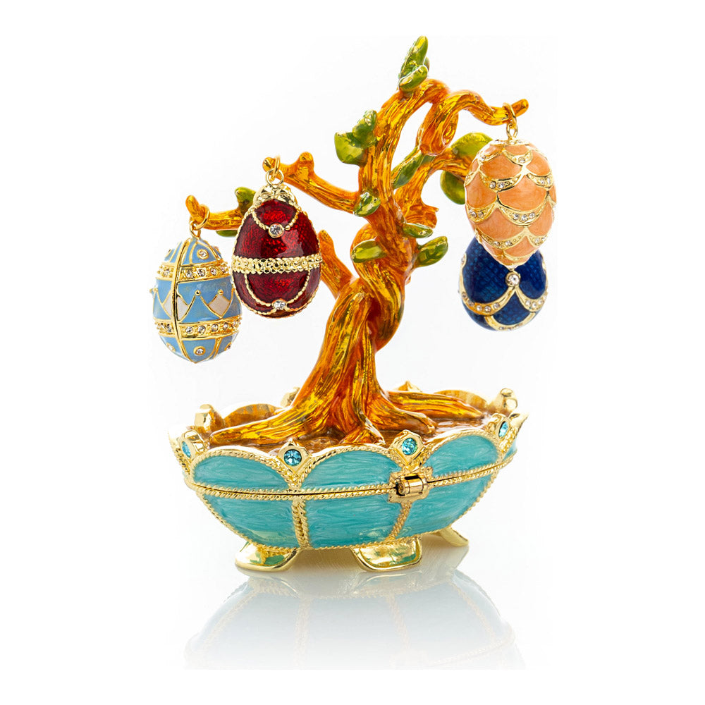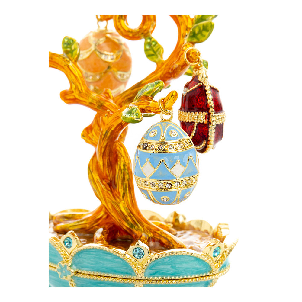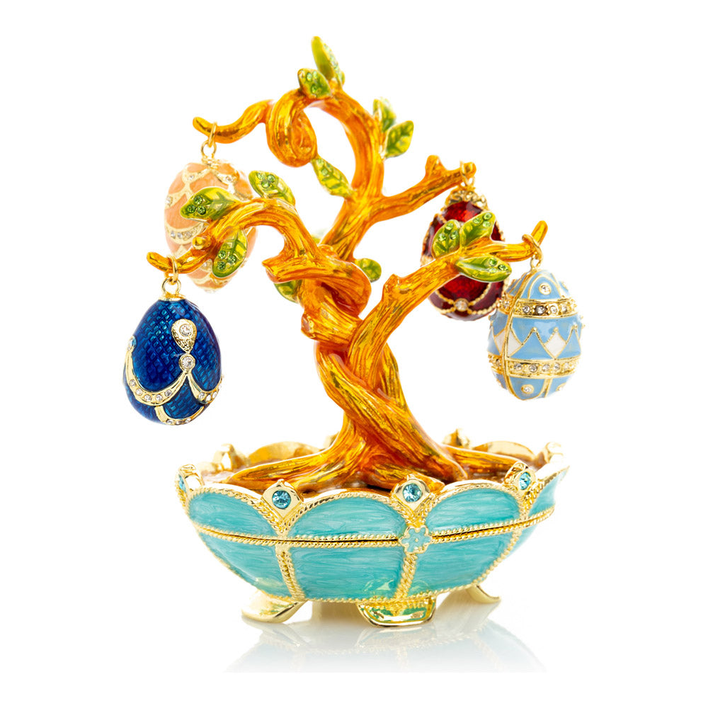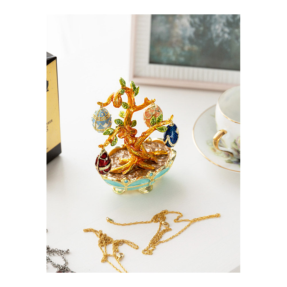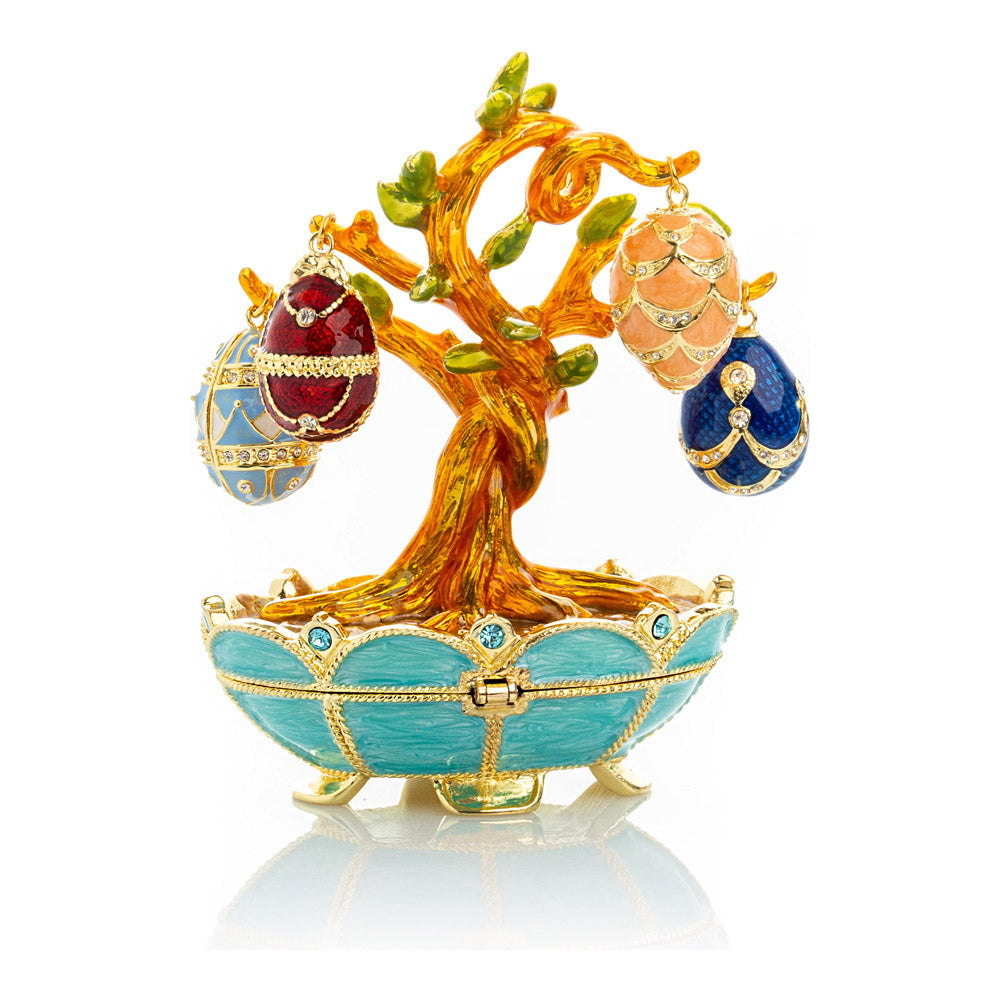 קופסת תכשיטים בעבודת יד בעיצוב עץ אלגנטי הנושא תליוני ביצי פברז'ה זעירות, פריט ייחודי ומהודר במהדורה מוגבלת. מצופה זהב 24 קראט או כסף 925, ומשובץ בקריסטלים אוסטריים נוצצים שנבחרו והוצבו אחד-אחד בעבודת יד. הצביעה הידנית בטכניקת אמייל ייחודית מעניקה עומק, צבעוניות וברק מרהיב, בעוד הסגירה המגנטית מבטיחה שמירה בטוחה על התכולה. יצירה זו מהווה שילוב מושלם של אומנות, יוקרה וערך אספני, ומגיעה באריזת מתנה שחורה אלגנטית.