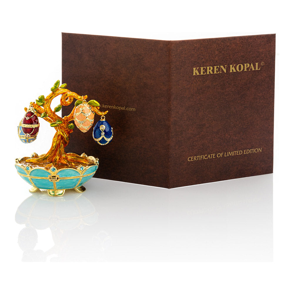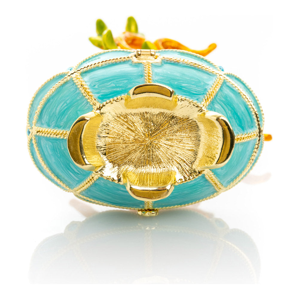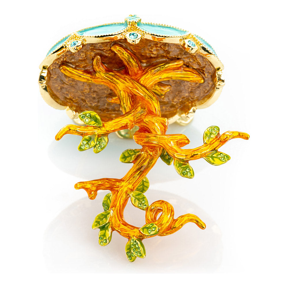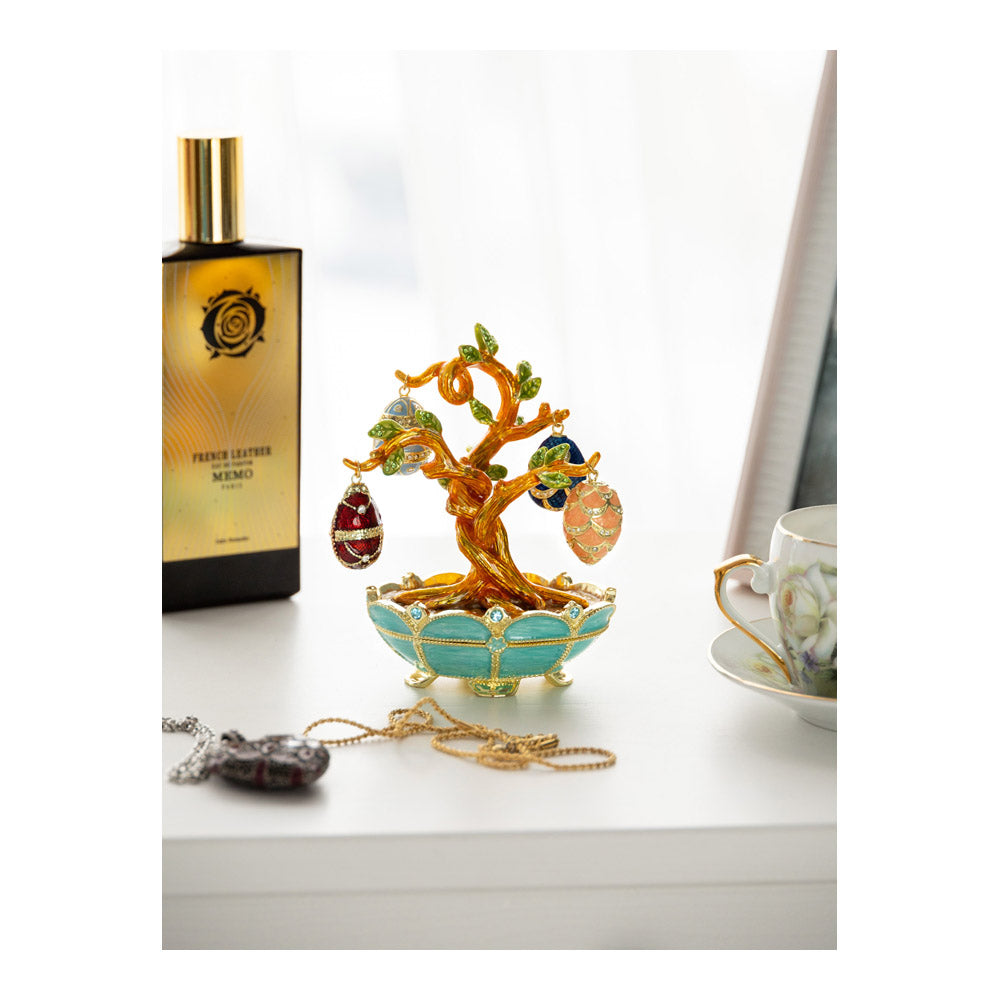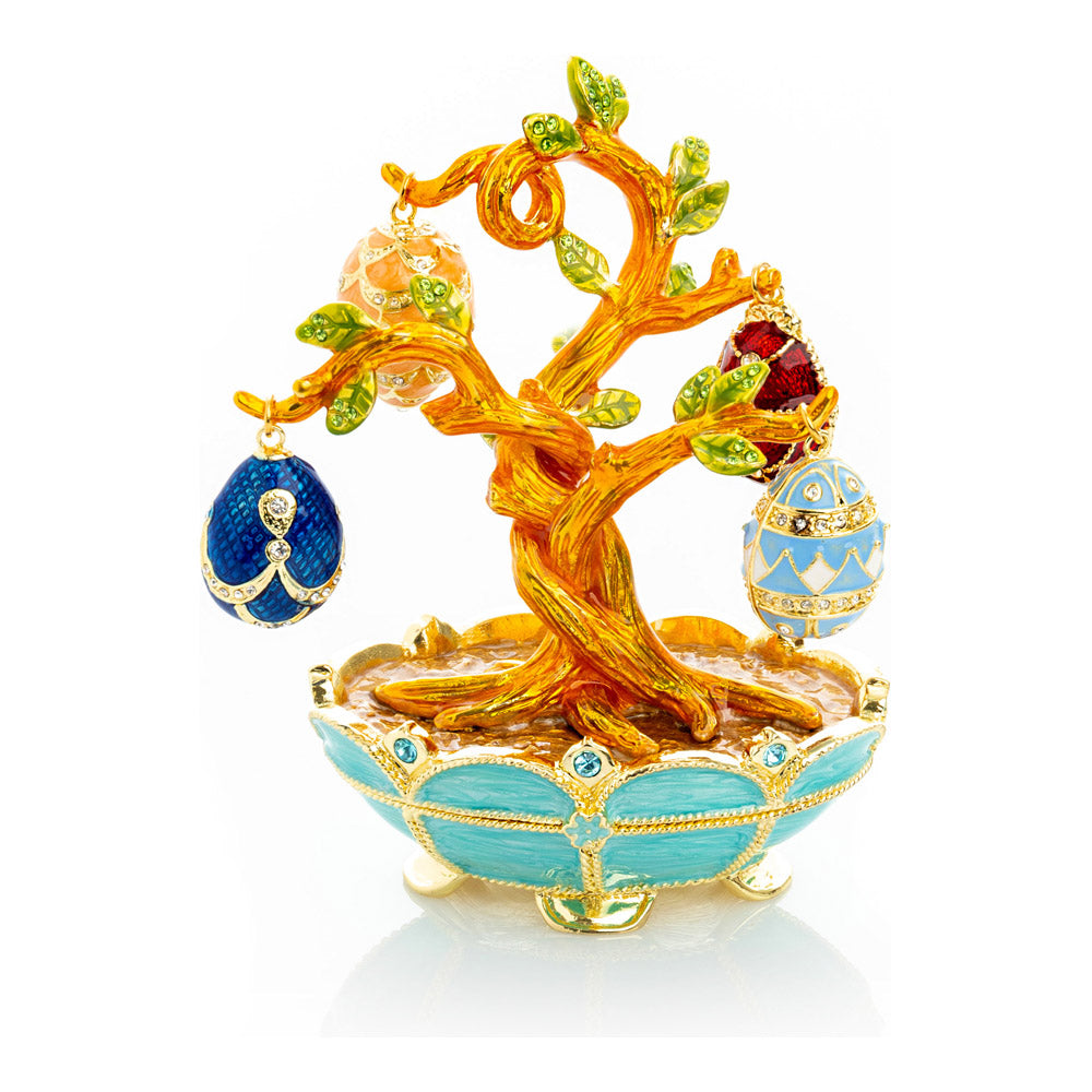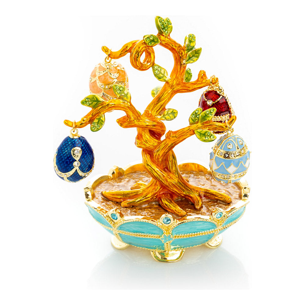 קופסת תכשיטים בעבודת יד בעיצוב עץ אלגנטי הנושא תליוני ביצי פברז'ה זעירות, פריט ייחודי ומהודר במהדורה מוגבלת. מצופה זהב 24 קראט או כסף 925, ומשובץ בקריסטלים אוסטריים נוצצים שנבחרו והוצבו אחד-אחד בעבודת יד. הצביעה הידנית בטכניקת אמייל ייחודית מעניקה עומק, צבעוניות וברק מרהיב, בעוד הסגירה המגנטית מבטיחה שמירה בטוחה על התכולה. יצירה זו מהווה שילוב מושלם של אומנות, יוקרה וערך אספני, ומגיעה באריזת מתנה שחורה אלגנטית.