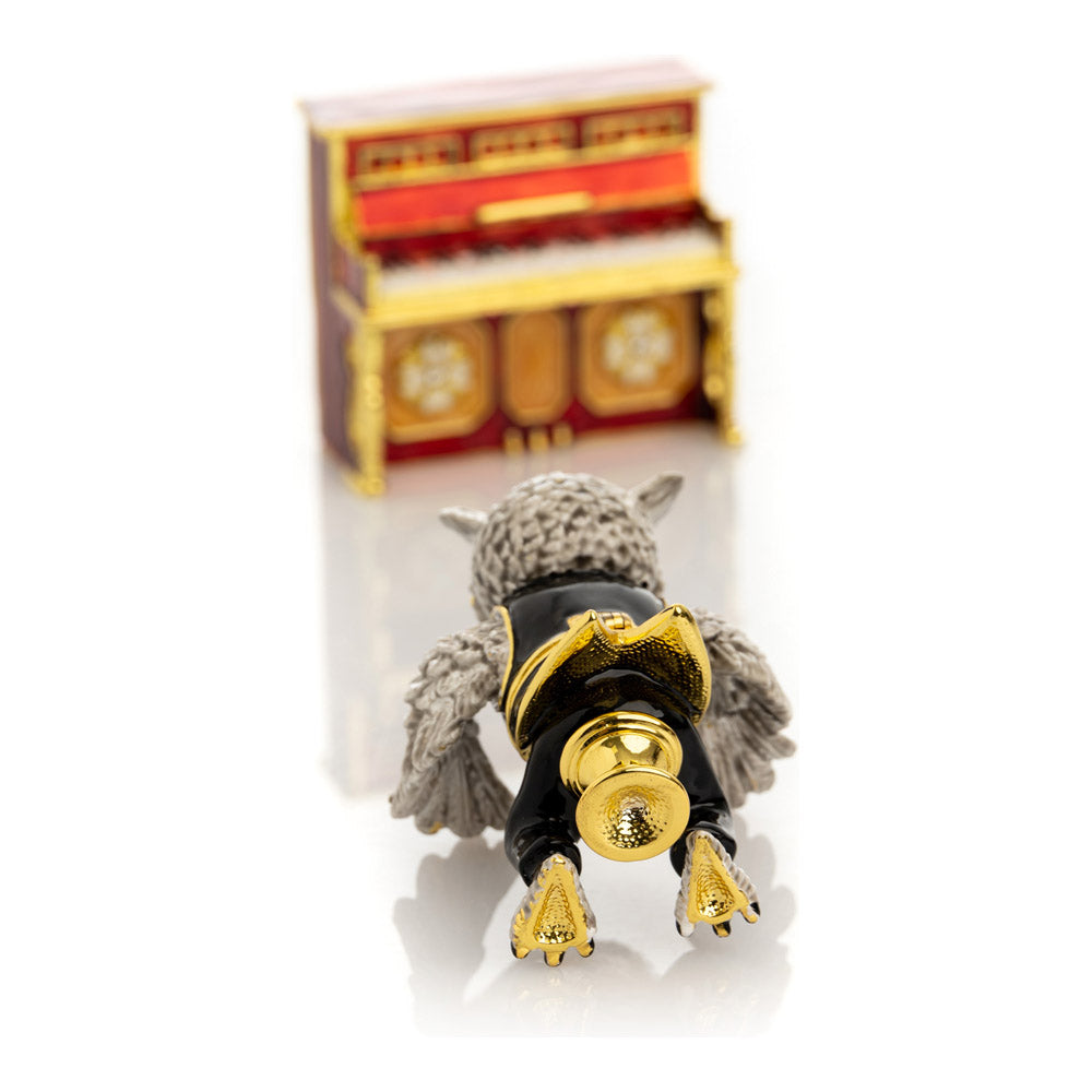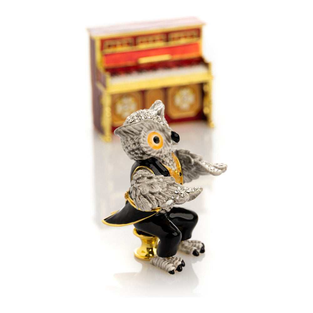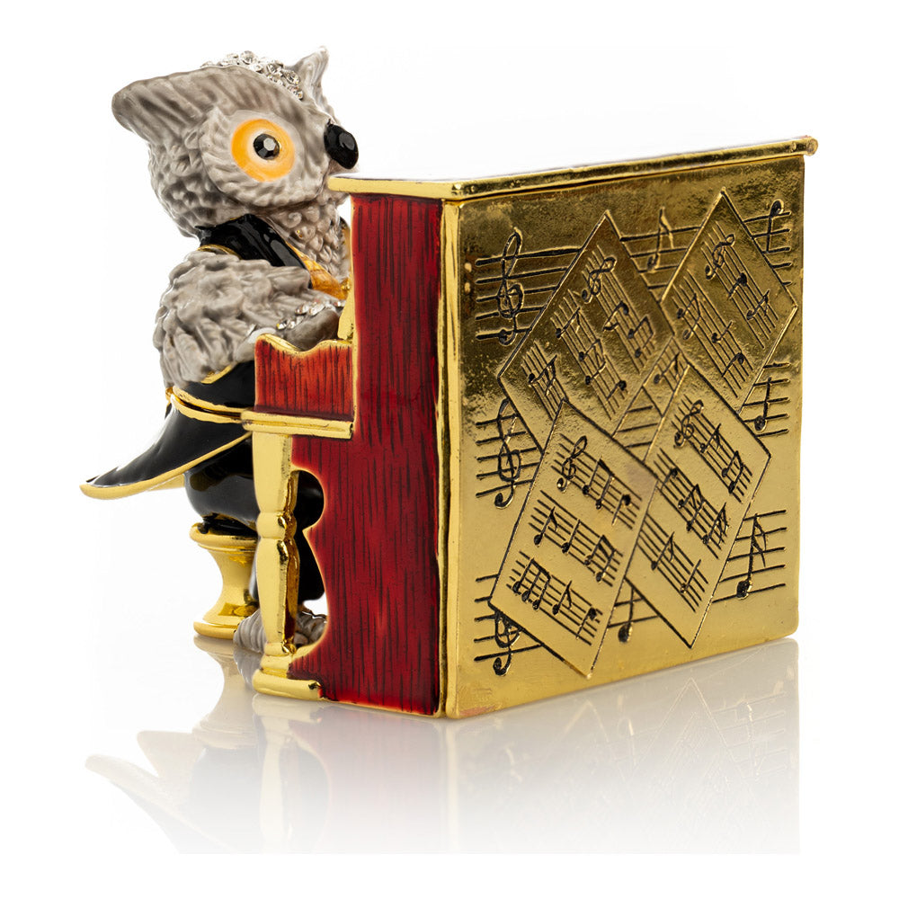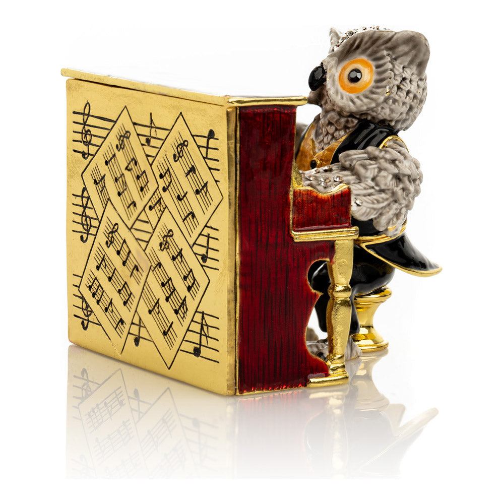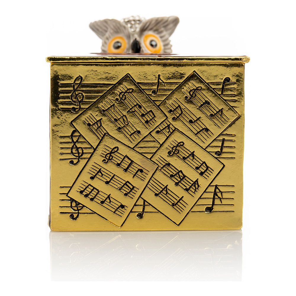 קופסת תכשיטים בעבודת יד בעיצוב ינשוף מנגן על פסנתר, פריט ייחודי מסדרת הינשופים של קרן קופל, המשלב את קסם המוזיקה עם סמליות החוכמה והאצילות של הינשוף. היצירה מצופה זהב 24 קראט, משובצת בקריסטלים אוסטריים נוצצים, ונצבעת ידנית בטכניקת אמייל ייחודית המעניקה עומק וברק מרהיב. העיצוב המפורט שואב השראה מסגנון האר נובו, ומציג קווים אורגניים ונגיעות טבעיות המשלימות את המראה היוקרתי. הסגירה המגנטית מבטיחה שמירה בטוחה על התכולה, והפריט מגיע באריזת מתנה שחורה אלגנטית – מושלם לאספנים, חובבי מוזיקה ואמנות.