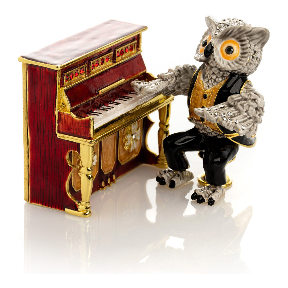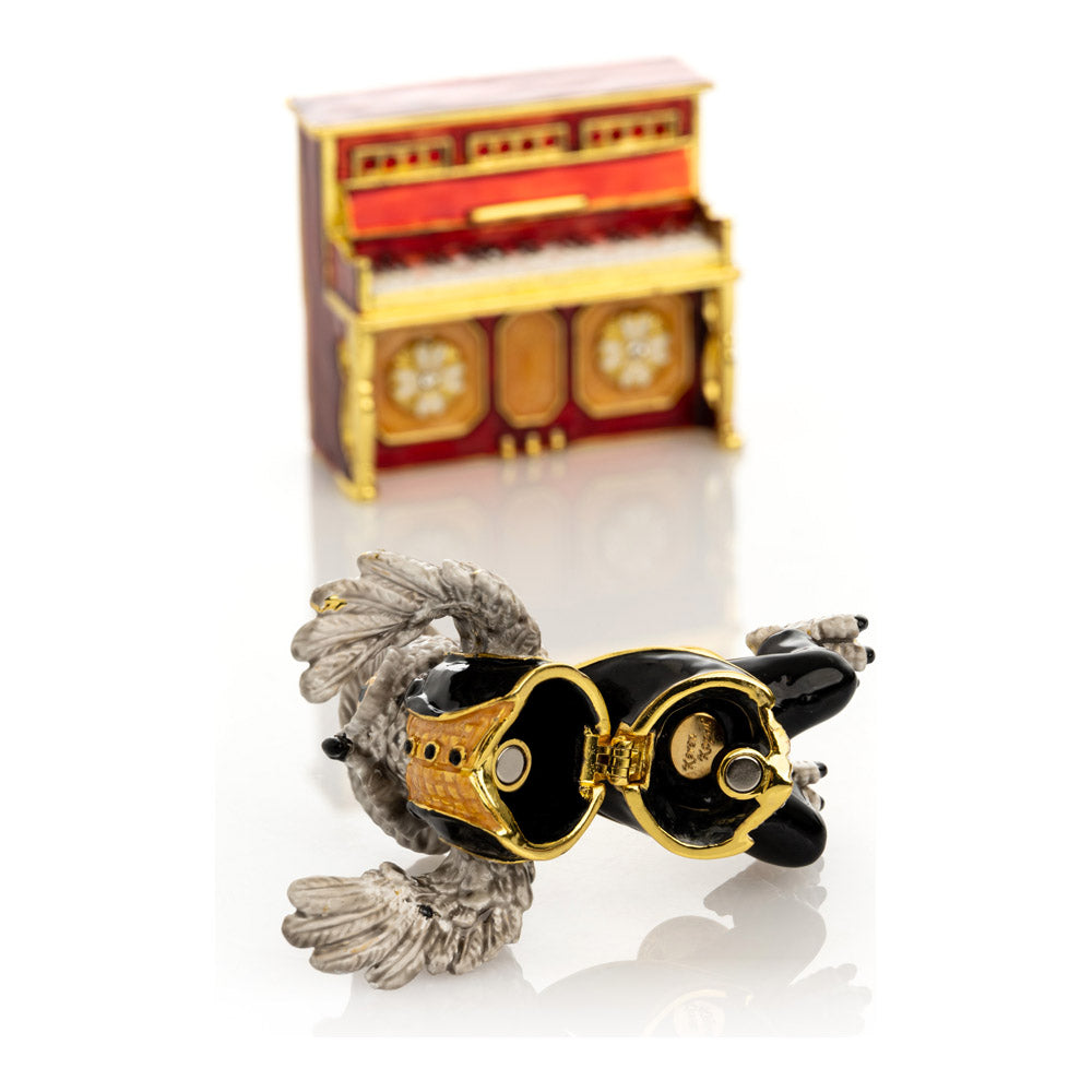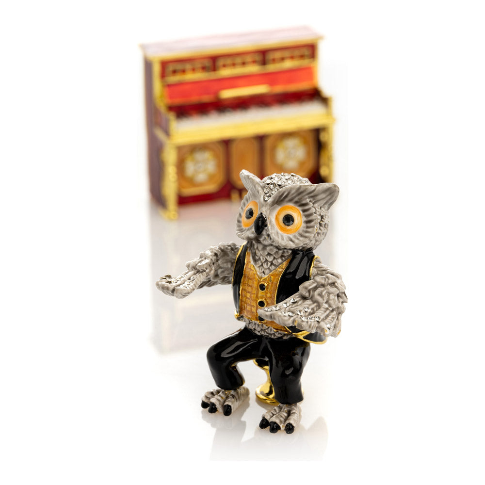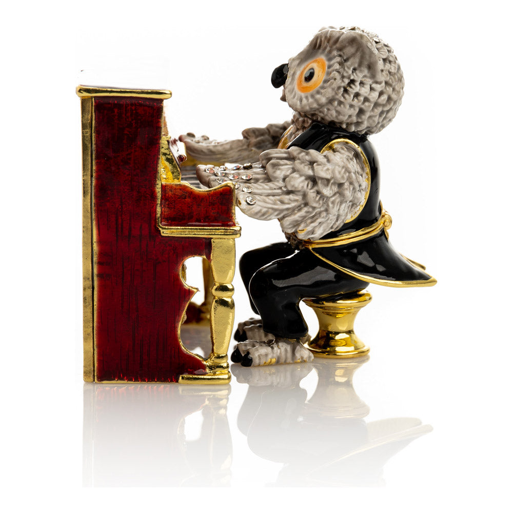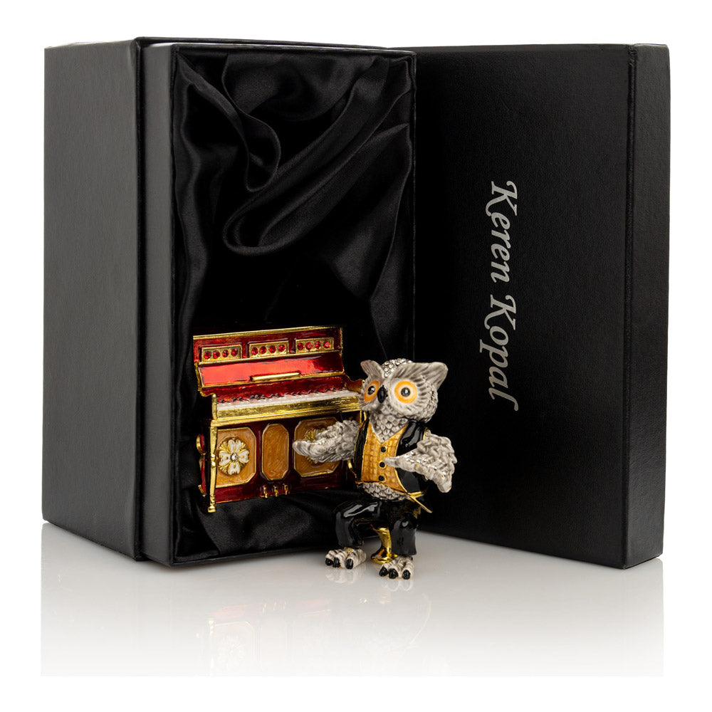 קופסת תכשיטים בעבודת יד בעיצוב ינשוף מנגן על פסנתר, פריט ייחודי מסדרת הינשופים של קרן קופל, המשלב את קסם המוזיקה עם סמליות החוכמה והאצילות של הינשוף. היצירה מצופה זהב 24 קראט, משובצת בקריסטלים אוסטריים נוצצים, ונצבעת ידנית בטכניקת אמייל ייחודית המעניקה עומק וברק מרהיב. העיצוב המפורט שואב השראה מסגנון האר נובו, ומציג קווים אורגניים ונגיעות טבעיות המשלימות את המראה היוקרתי. הסגירה המגנטית מבטיחה שמירה בטוחה על התכולה, והפריט מגיע באריזת מתנה שחורה אלגנטית – מושלם לאספנים, חובבי מוזיקה ואמנות.