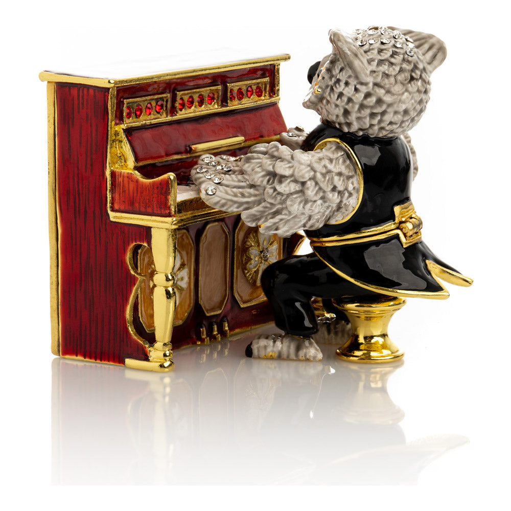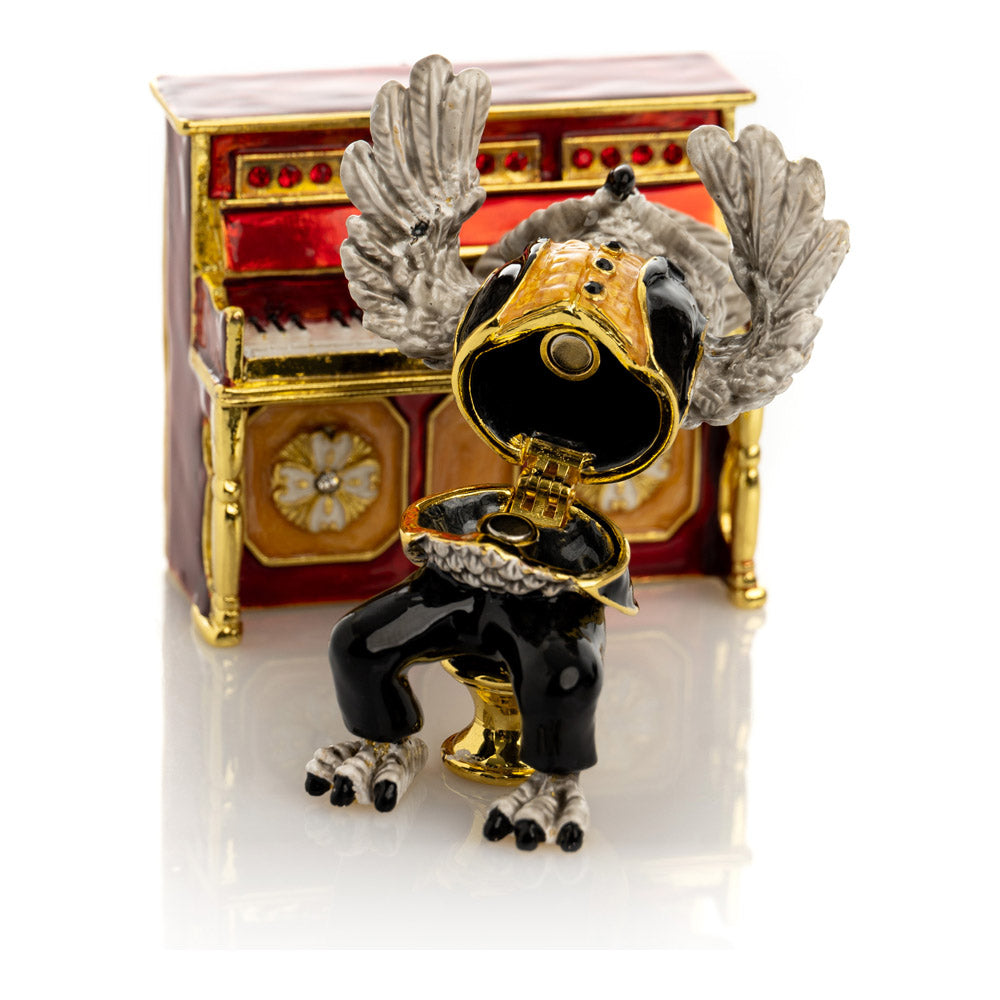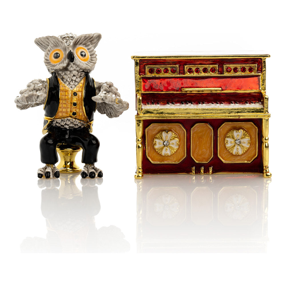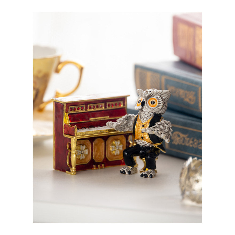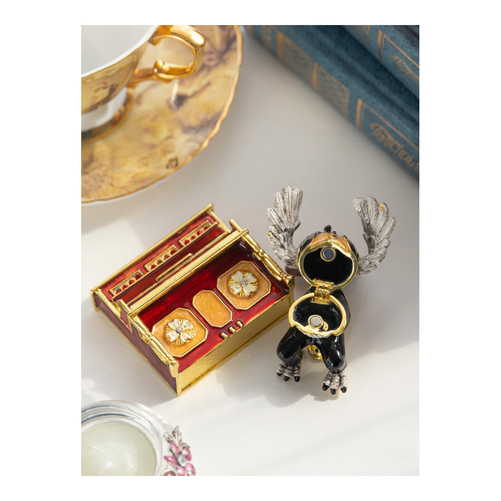 קופסת תכשיטים בעבודת יד בעיצוב ינשוף מנגן על פסנתר, פריט ייחודי מסדרת הינשופים של קרן קופל, המשלב את קסם המוזיקה עם סמליות החוכמה והאצילות של הינשוף. היצירה מצופה זהב 24 קראט, משובצת בקריסטלים אוסטריים נוצצים, ונצבעת ידנית בטכניקת אמייל ייחודית המעניקה עומק וברק מרהיב. העיצוב המפורט שואב השראה מסגנון האר נובו, ומציג קווים אורגניים ונגיעות טבעיות המשלימות את המראה היוקרתי. הסגירה המגנטית מבטיחה שמירה בטוחה על התכולה, והפריט מגיע באריזת מתנה שחורה אלגנטית – מושלם לאספנים, חובבי מוזיקה ואמנות.