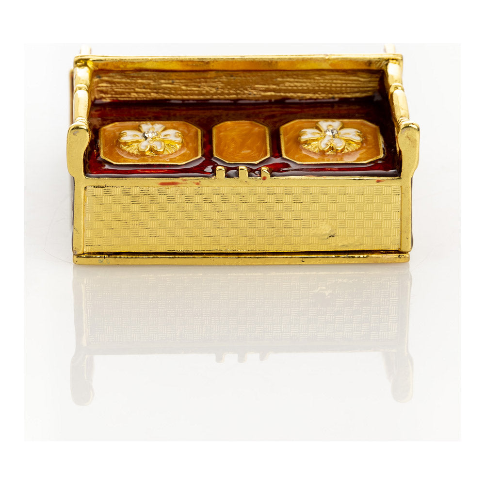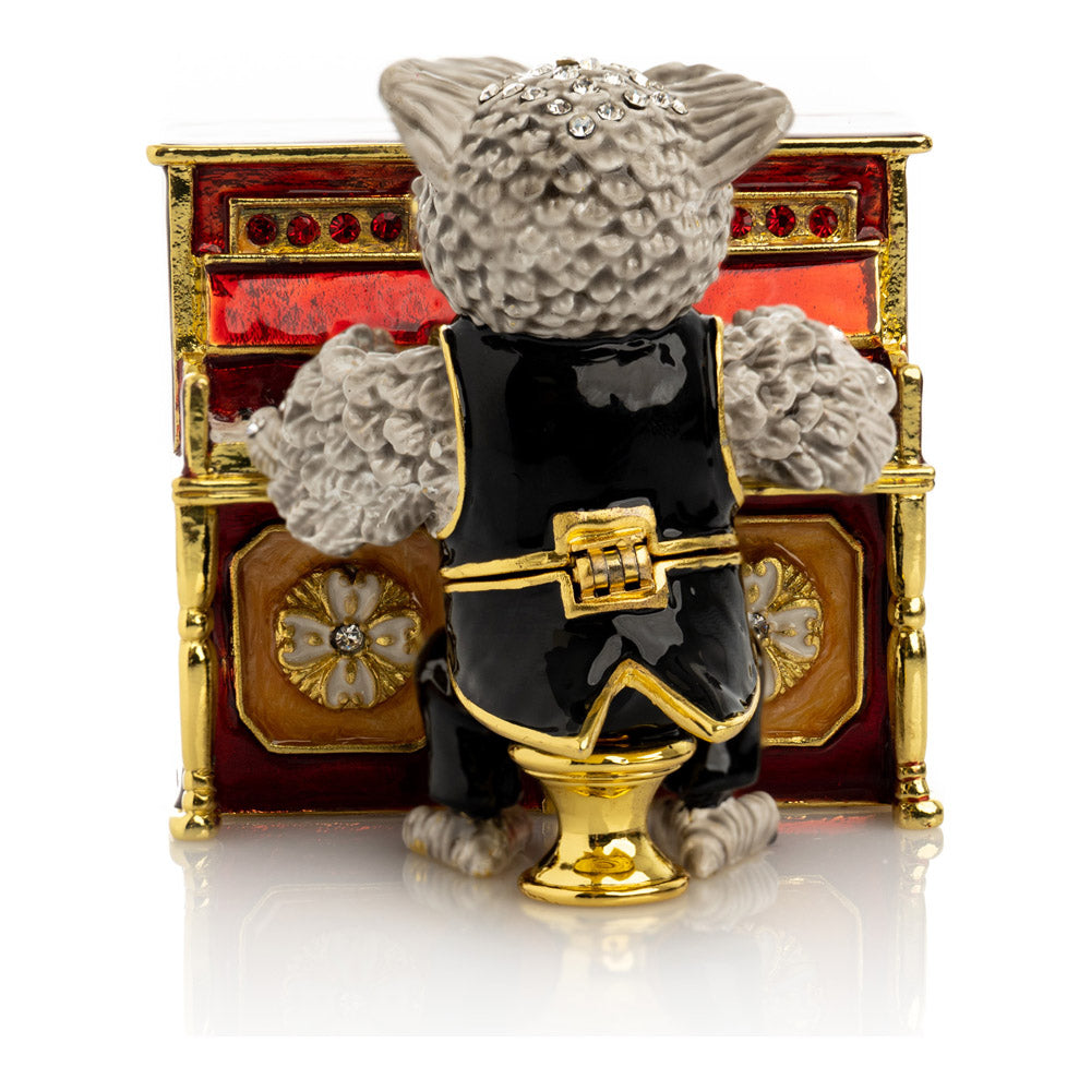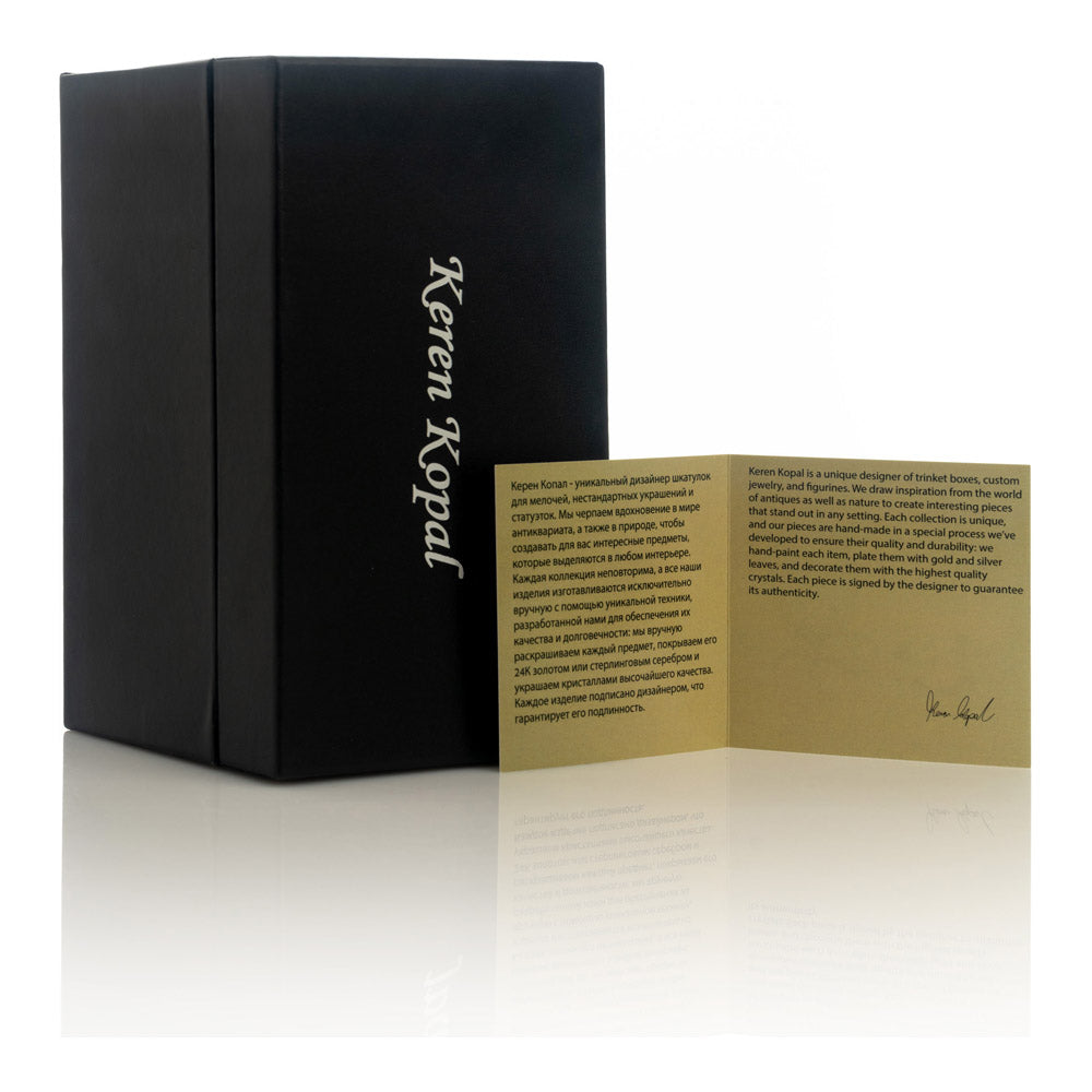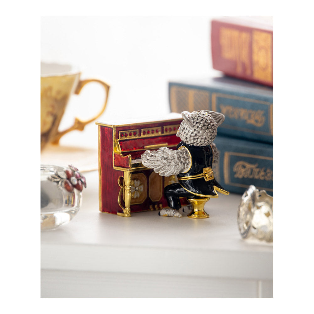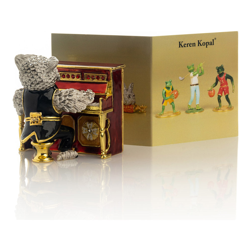 קופסת תכשיטים בעבודת יד בעיצוב ינשוף מנגן על פסנתר, פריט ייחודי מסדרת הינשופים של קרן קופל, המשלב את קסם המוזיקה עם סמליות החוכמה והאצילות של הינשוף. היצירה מצופה זהב 24 קראט, משובצת בקריסטלים אוסטריים נוצצים, ונצבעת ידנית בטכניקת אמייל ייחודית המעניקה עומק וברק מרהיב. העיצוב המפורט שואב השראה מסגנון האר נובו, ומציג קווים אורגניים ונגיעות טבעיות המשלימות את המראה היוקרתי. הסגירה המגנטית מבטיחה שמירה בטוחה על התכולה, והפריט מגיע באריזת מתנה שחורה אלגנטית – מושלם לאספנים, חובבי מוזיקה ואמנות.