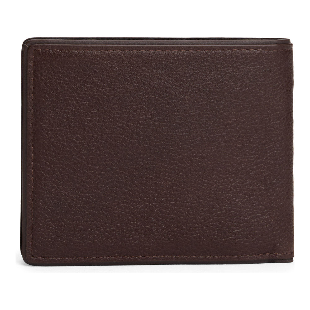 ארנק עשוי מעור איכותי, עם לוגו המותג מוטבע בחלק הקידמי בצבע כסף.