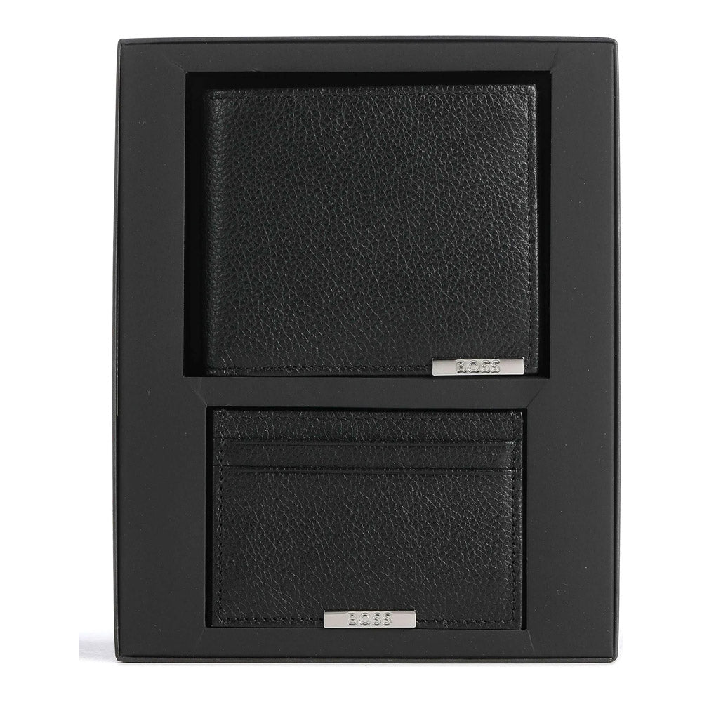 הסט כולל ארנק סופ"ש קלאסי עם מקום ל-4 כרטיסים וארנק נפתח עם מקום לעד 10 כרטיסים ותא לשטרות, בעיצוב אלגנטי. שני הפריטים ממותגים עם לוחית BOSS כסופה המעניקה מראה יוקרתי.