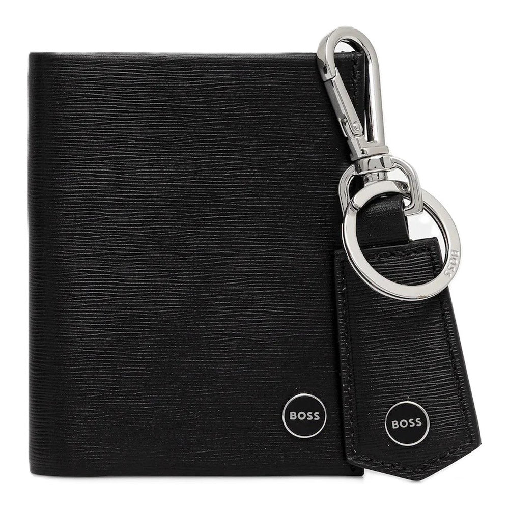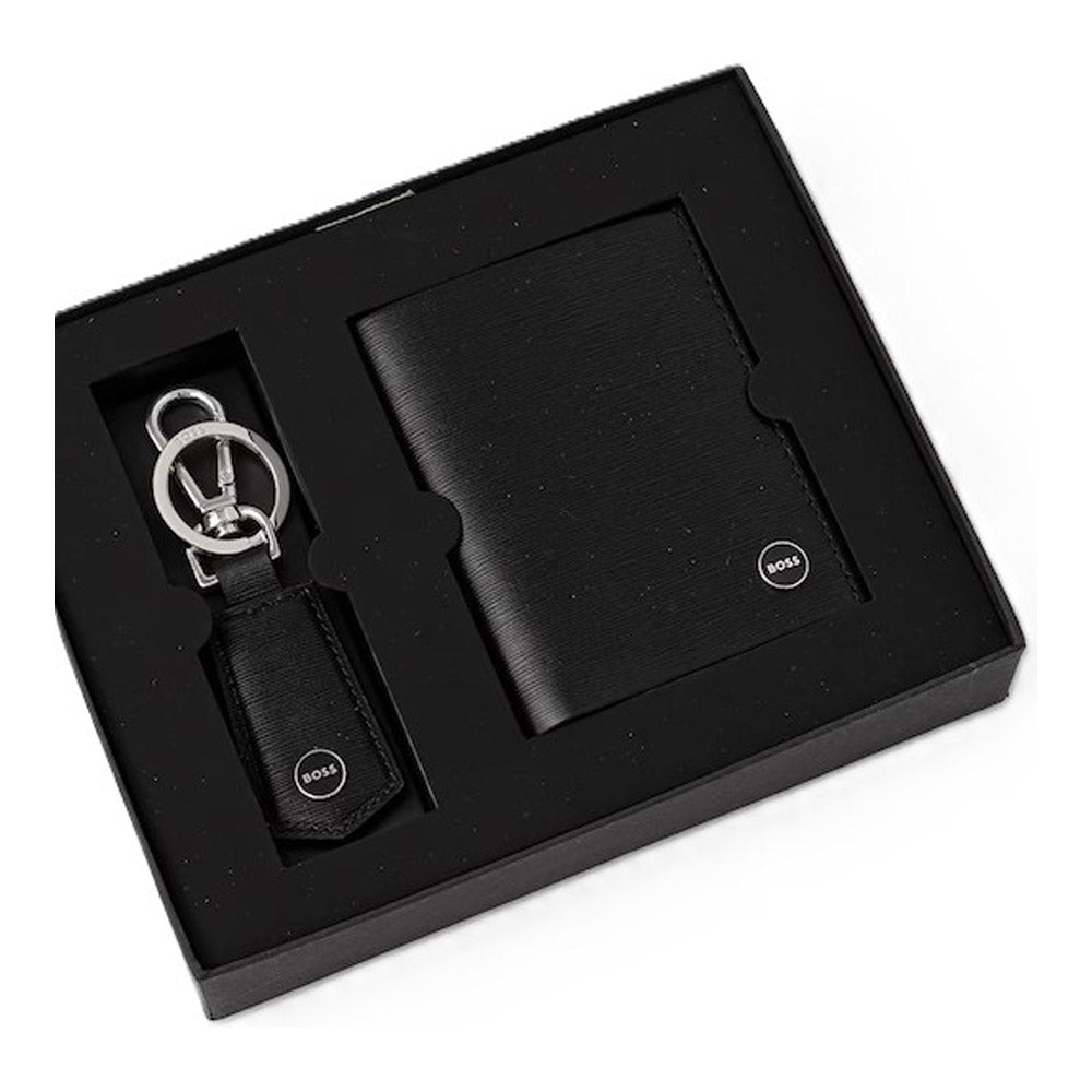 סט מתנה יוקרתי לגבר מבית BOSS, הכולל ארנק ומחזיק מפתחות יוקרתיים, עשויים מעור איכותי בצבע שחור.