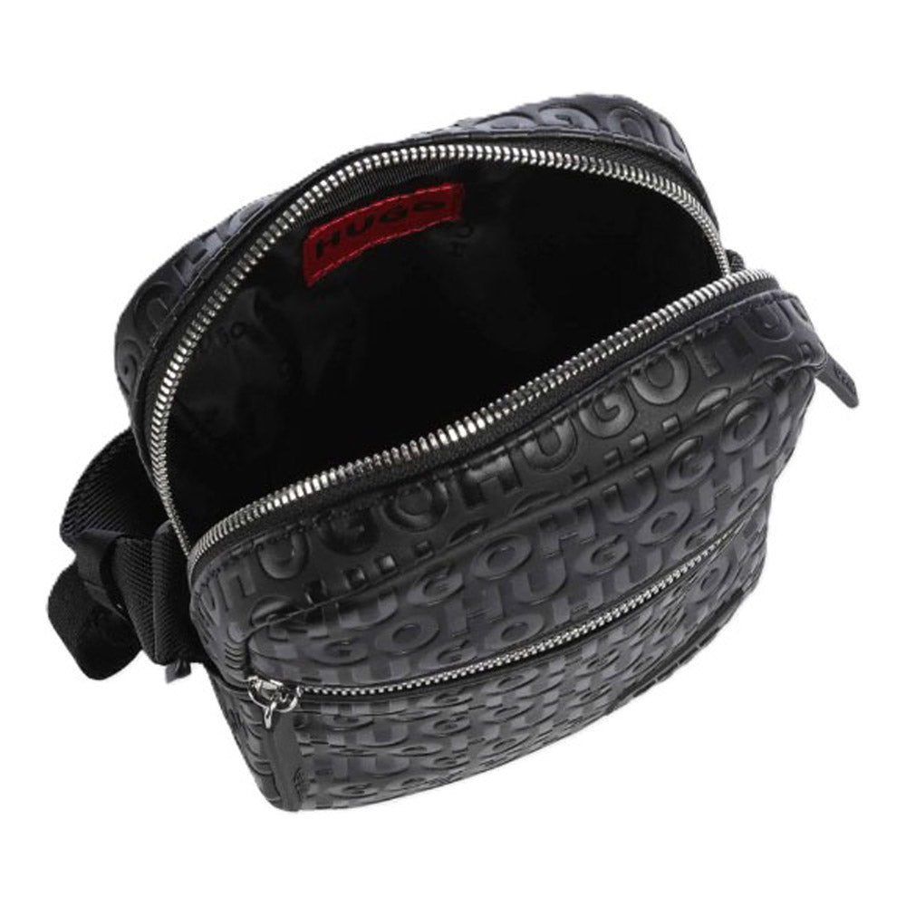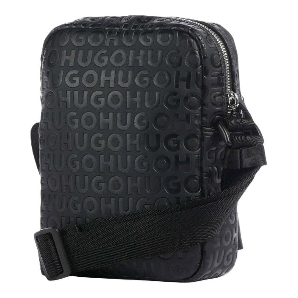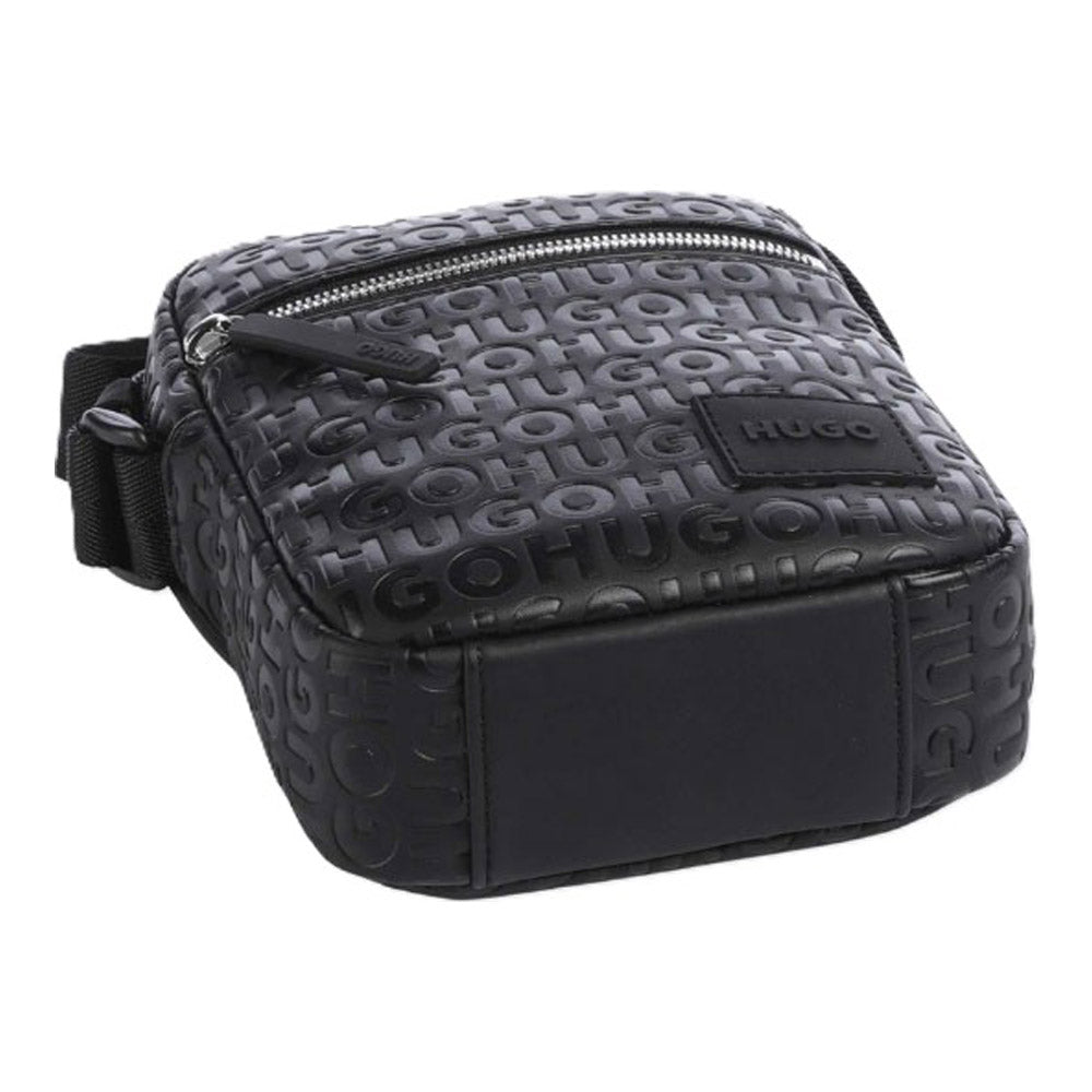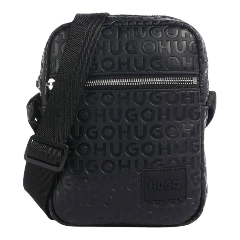 תיק צד קטן ורחב לגבר עשוי PU איכותי, בצבע שחור, מוטבע עם לוגו HUGO בחזית. כולל תא חיצוני קידמי, כיס פנימי ותא מרכזי עם סגירת רוכסן כולל רצועת כתף מתכווננת.