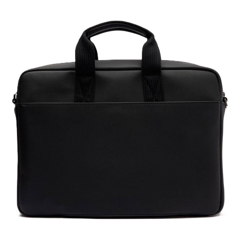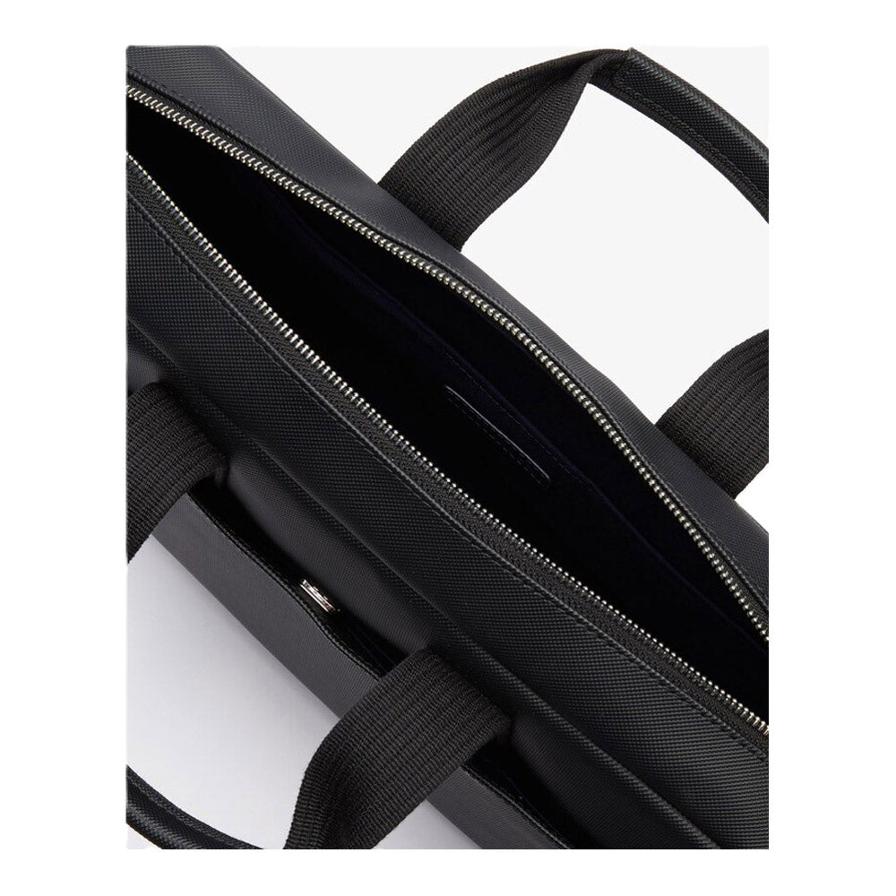 תיק עסקים דק ואיכותי, עשוי בד בשילוב PU, בצבע שחור של המותג היוקרתי LACOSTE, תא חיצוני, ותאים פנימיים עם חלוקה פנימית של 3 תאים ומקום למחשב נייד עד גודל של 15".
