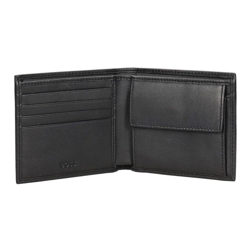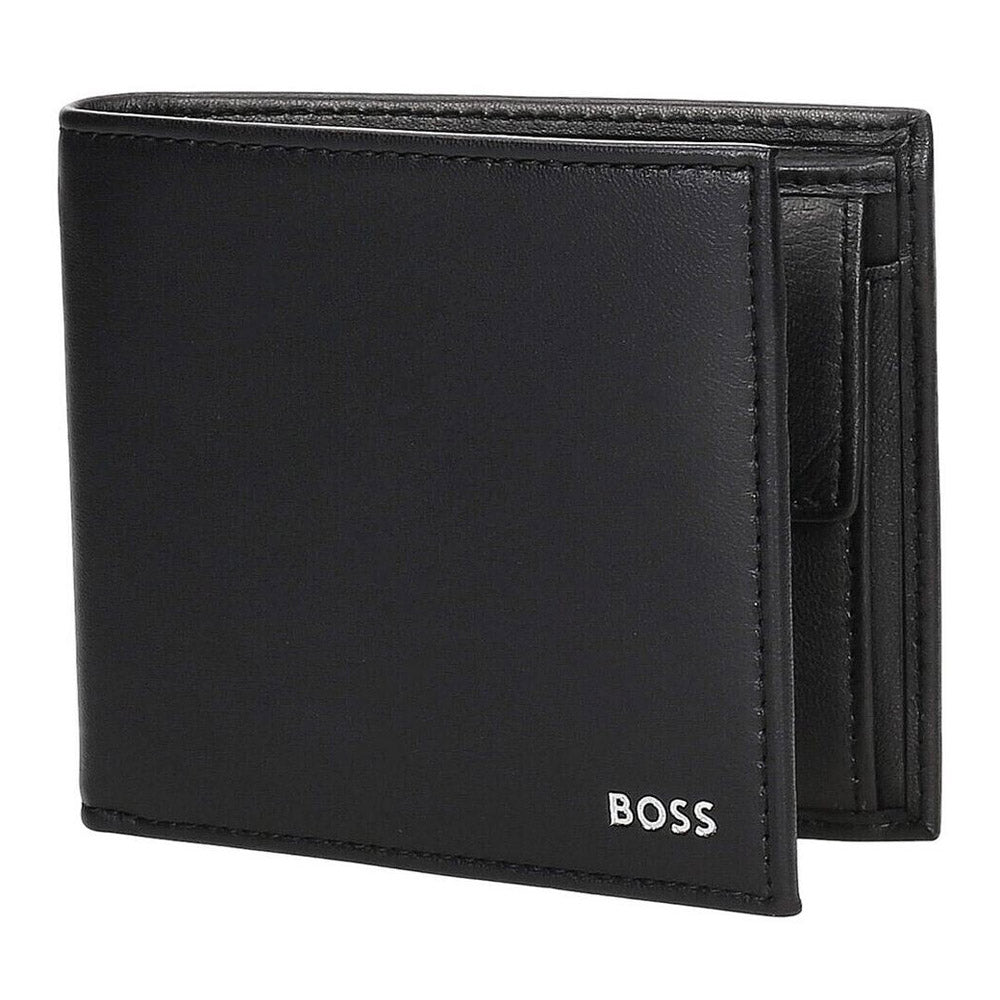 ארנק מעור מט שחור איכותי לגבר מהקולקציה החדשה של מותג האופנה העולמי HUGO ממותג בחלק הקדמי, עם מקום ל-4 כרטיסי אשראי, תא מטבעות ותא לשטרות.