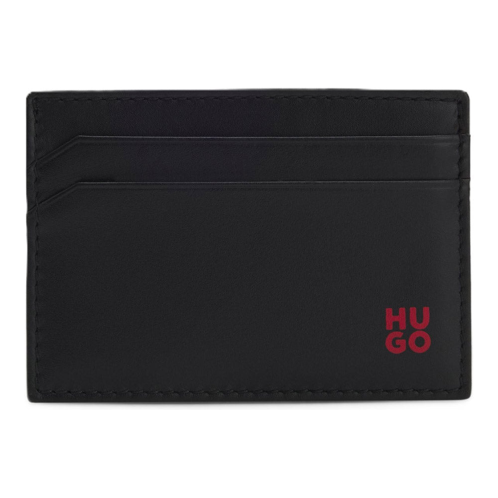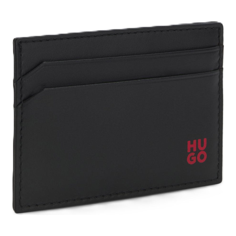 ארנק סופ"ש מעור שחור איכותי לגבר מהקולקציה החדשה של מותג האופנה העולמי HUGO ממותג בחלק הקדמי, עם מקום ל-4 כרטיסי אשראי.