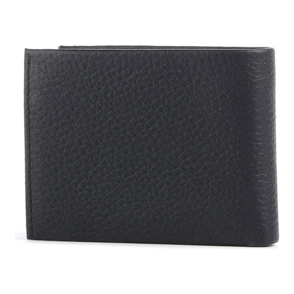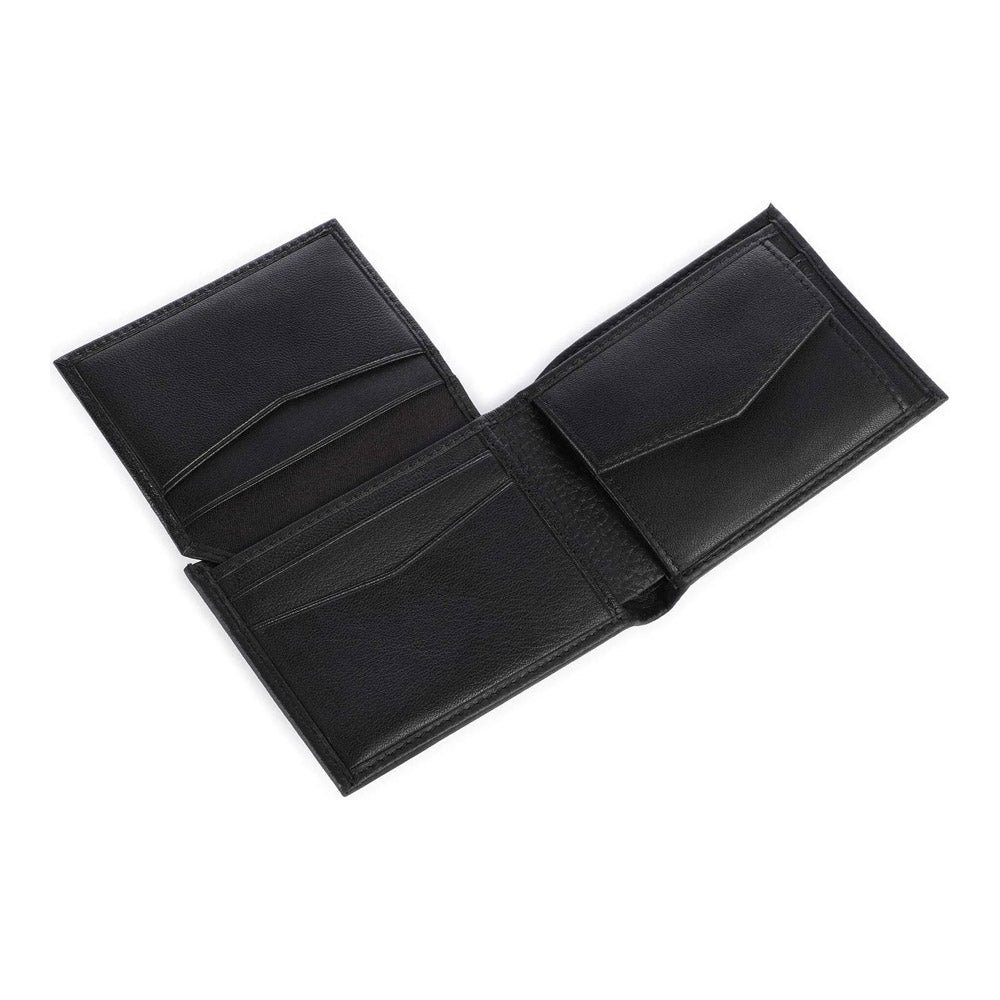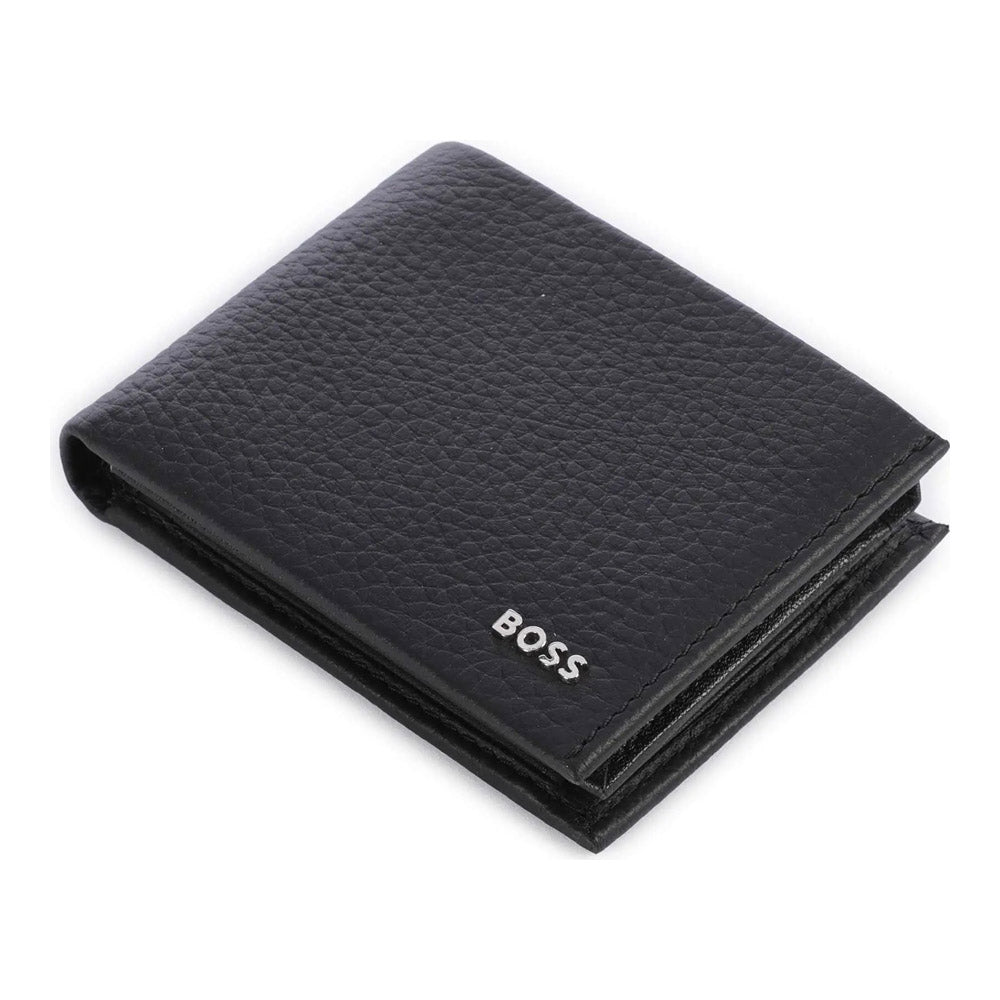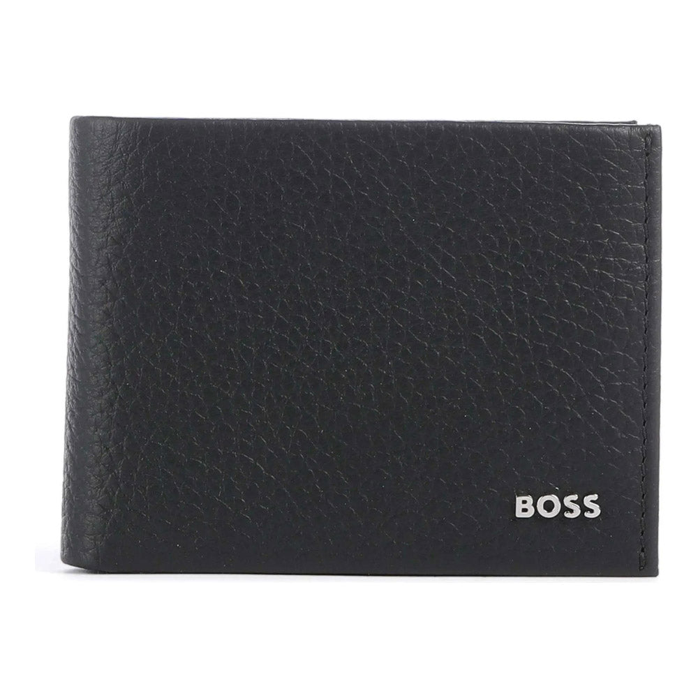ארנק מעור שחור איכותי לגבר מהקולקציה החדשה של מותג האופנה העולמי HUGO ממותג בחלק הקדמי, עם קלאפה נפתחת כלפי מעלה, מקום ל-6 כרטיסי אשראי, תא למטבעות ותא לשטרות.