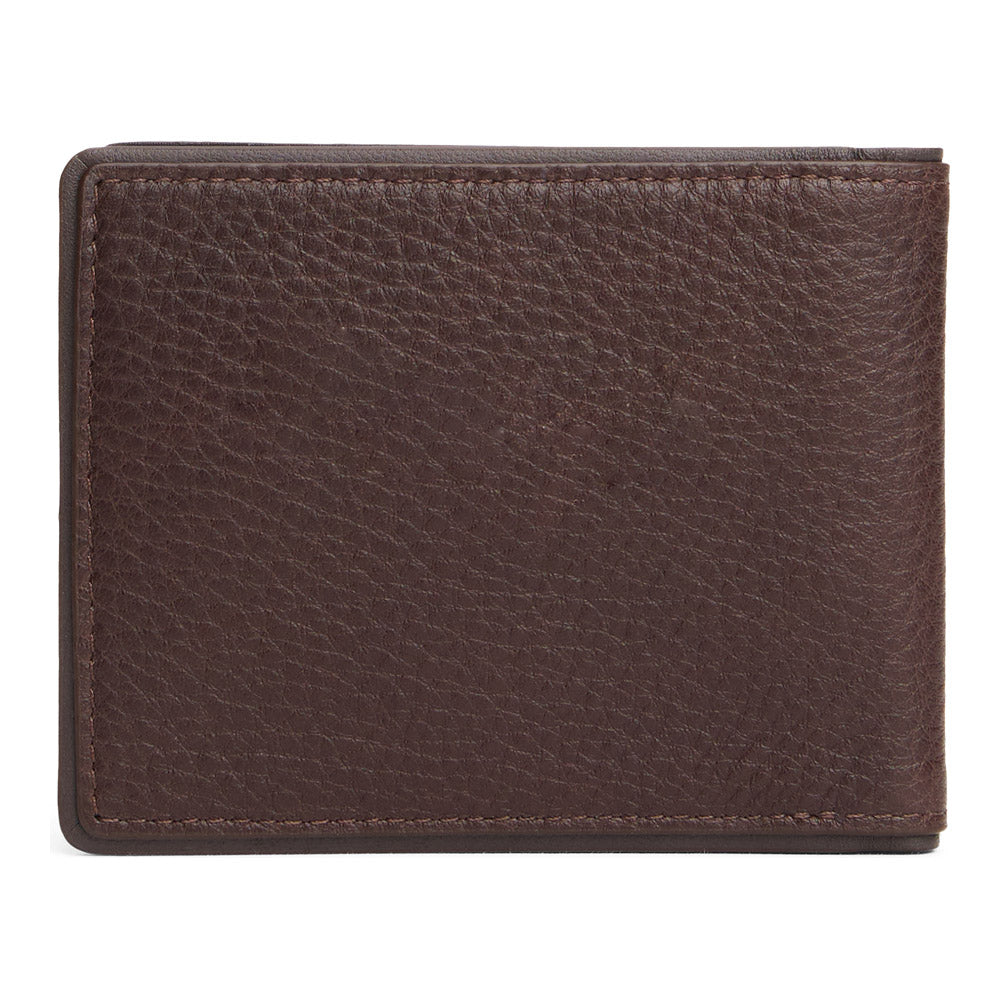 ארנק עשוי מעור איכותי, עם לוגו המותג מוטבע בחלק הקידמי בצבע כסף.