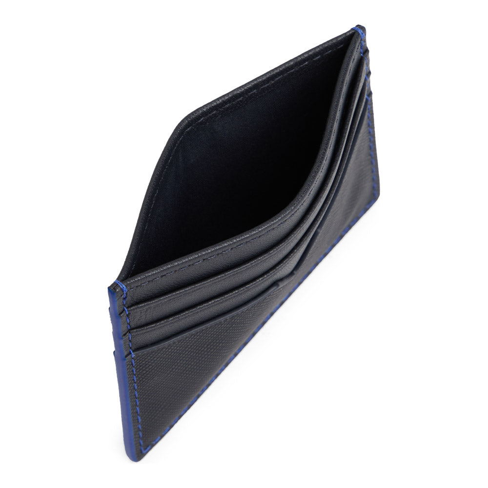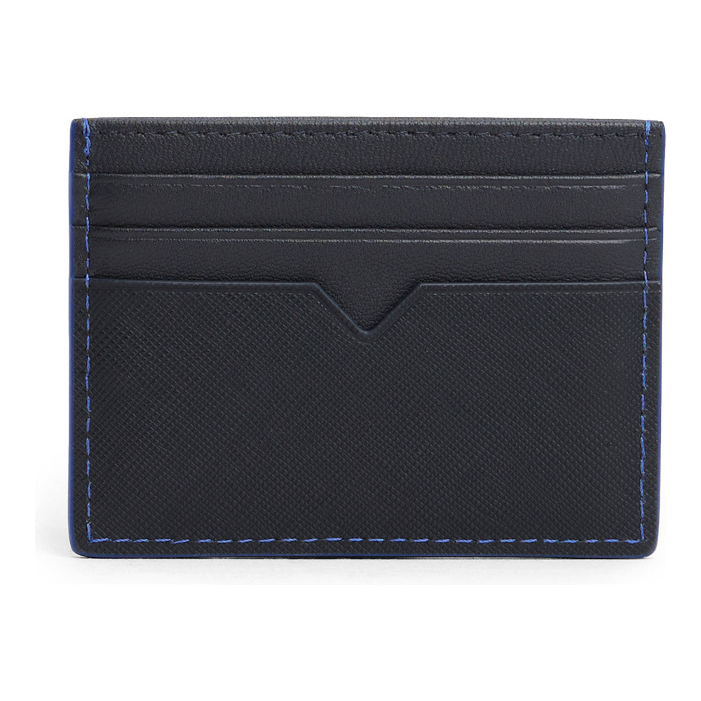 ארנק לגבר סופ"ש קומפקטי, קל ונוח, עשוי מעור איכותי עם לוגו המותג בחלק הקידמי עם תפרים בצבע כחול.